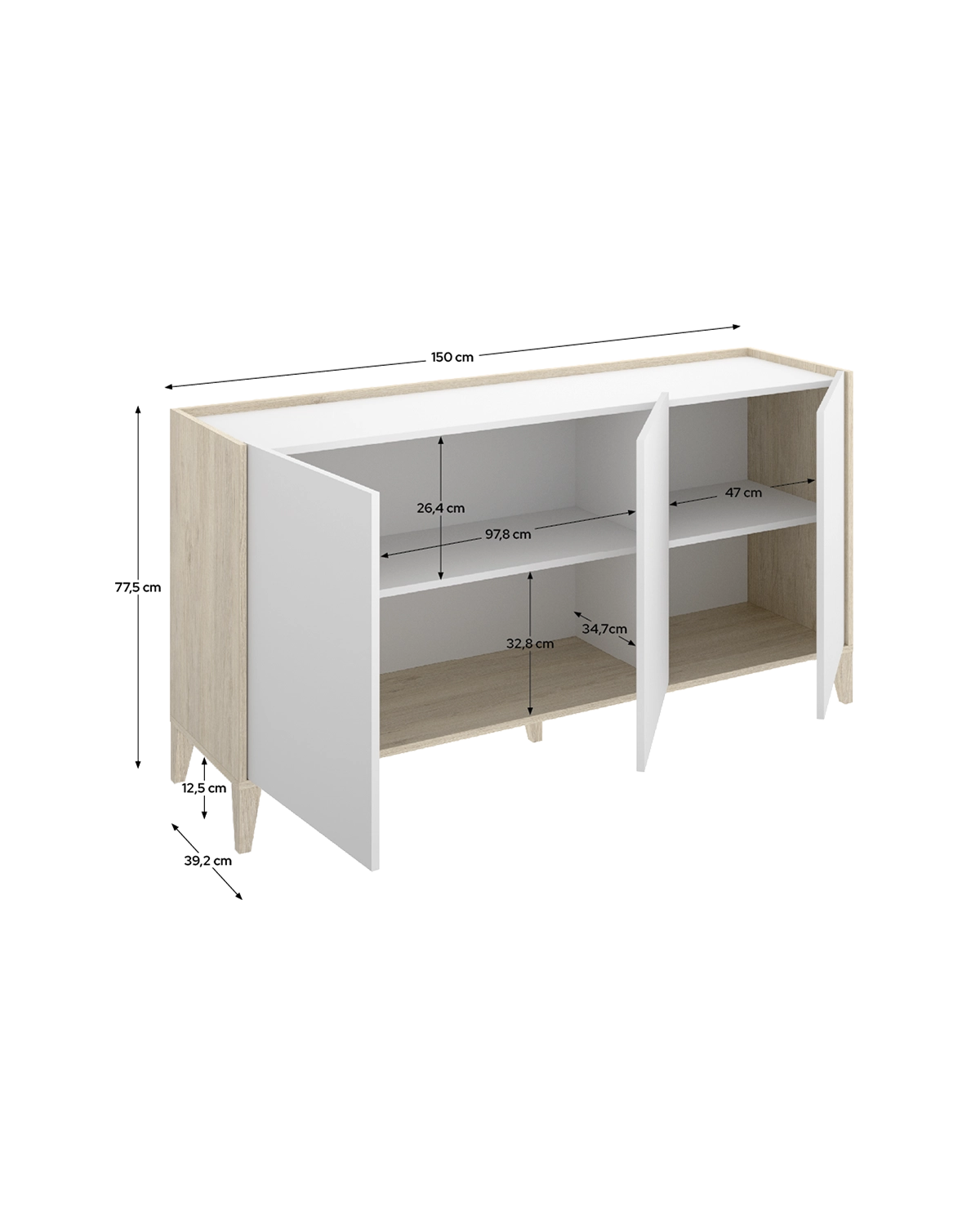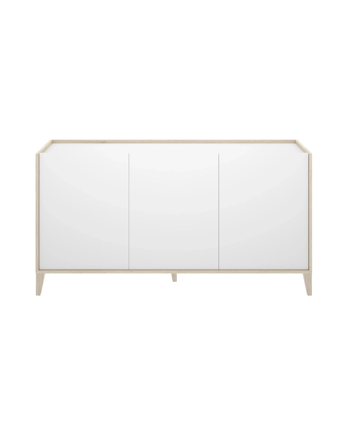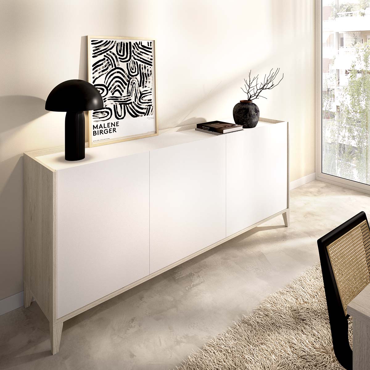 - El aparador Bari de tres puertas ofrece una estética depurada y natural que encaja con facilidad en interiores contemporáneos o escandinavos. Su combinación de blanco y madera natural crea un contraste suave y equilibrado que aporta claridad al ambiente. Con sus 150 cm de ancho y 75 cm de alto, ofrece espacio de almacenamiento suficiente sin recargar visualmente la estancia. Su interior incluye amplios estantes regulables tras las tres puertas batientes, pensados para guardar vajilla, textiles o complementos del hogar de forma ordenada. Las patas elevadas aportan una sensación de ligereza, al tiempo que facilitan la limpieza del suelo y mejoran la estabilidad del conjunto. El mueble está fabricado en tablero melaminizado de 16 mm con patas en ABS efecto madera natural y tacos antirrayaduras y quitarruidos en la base. Su diseño funcional y armonioso combina durabilidad, estética y practicidad, aportando una solución decorativa y eficiente al salón o comedor.