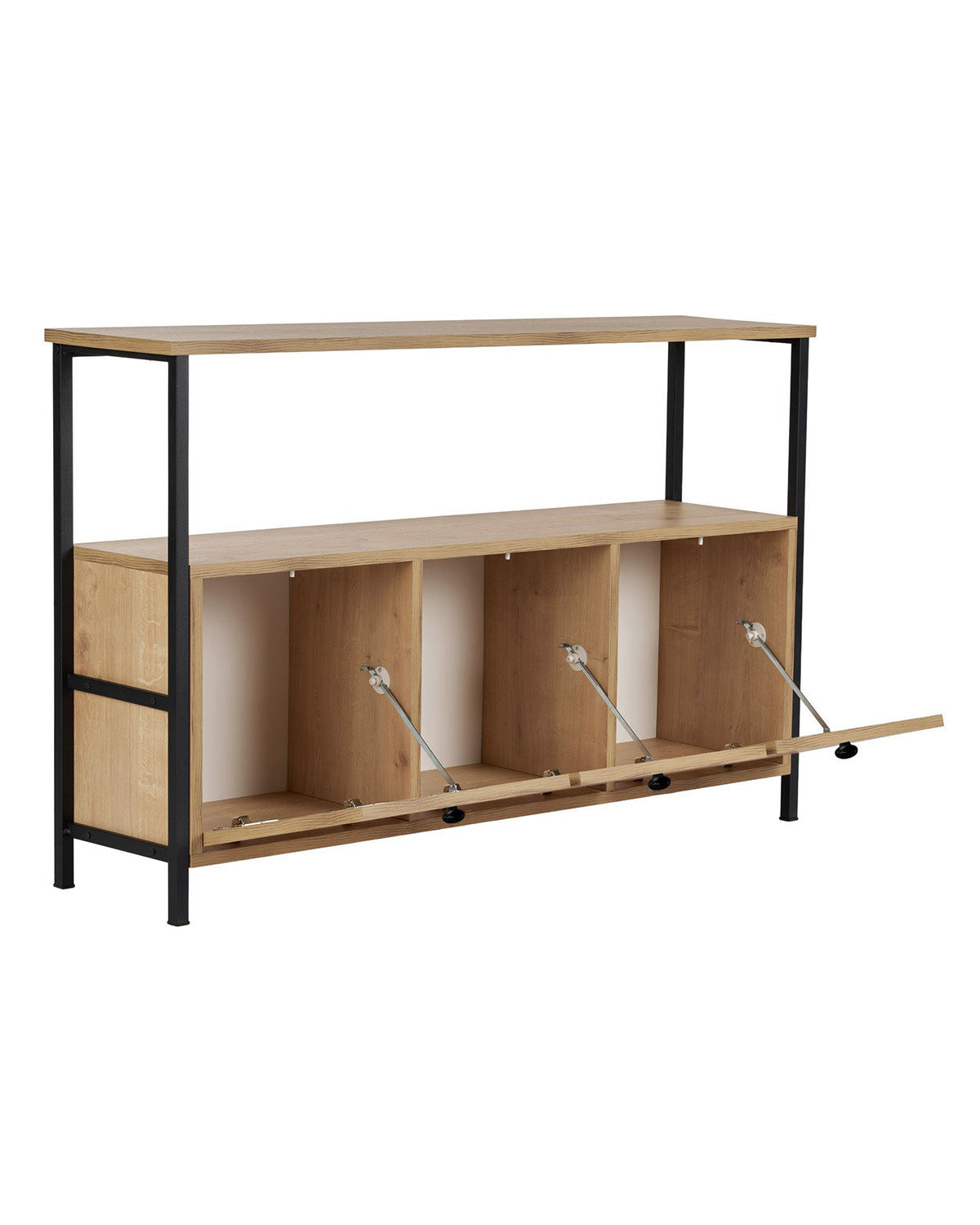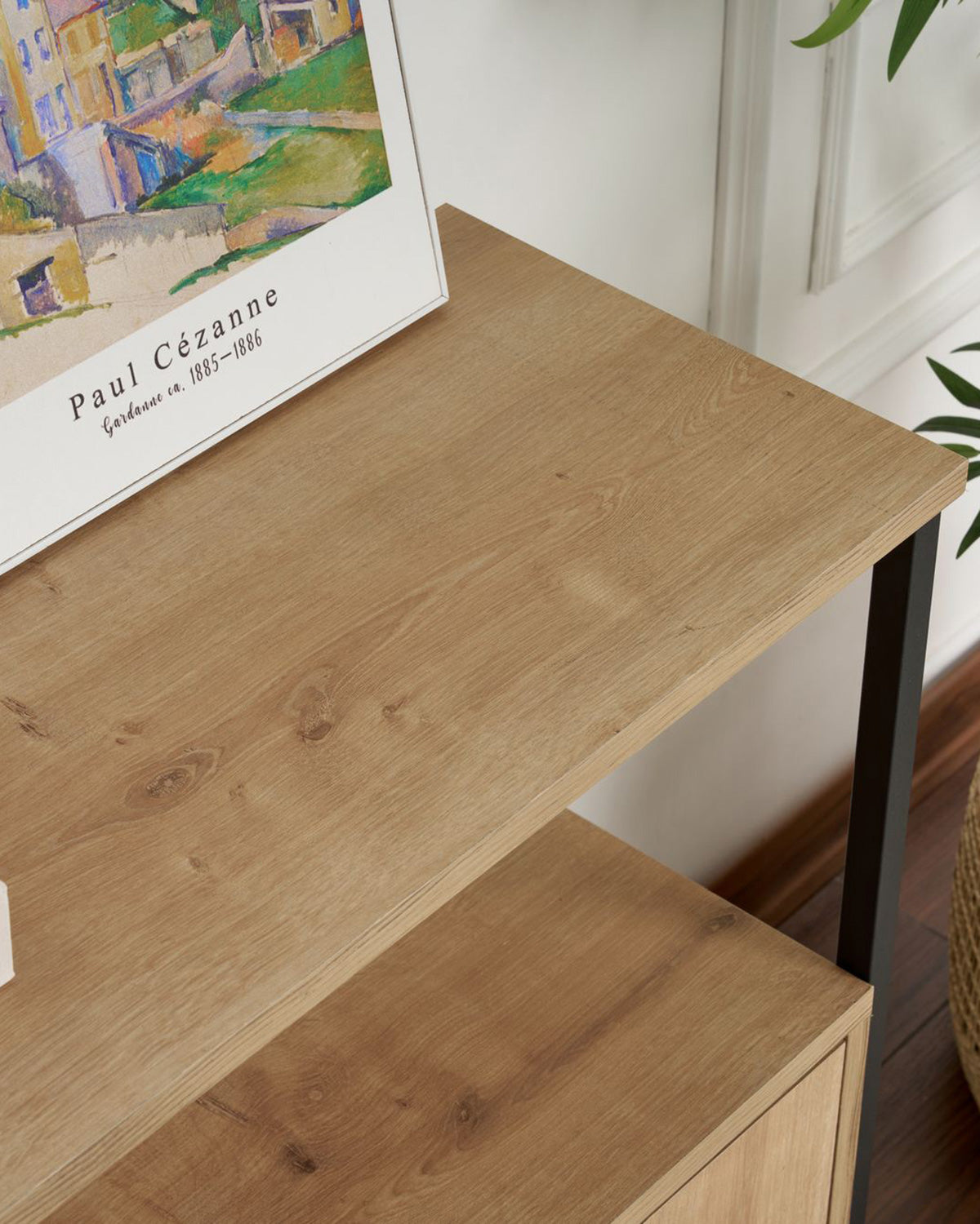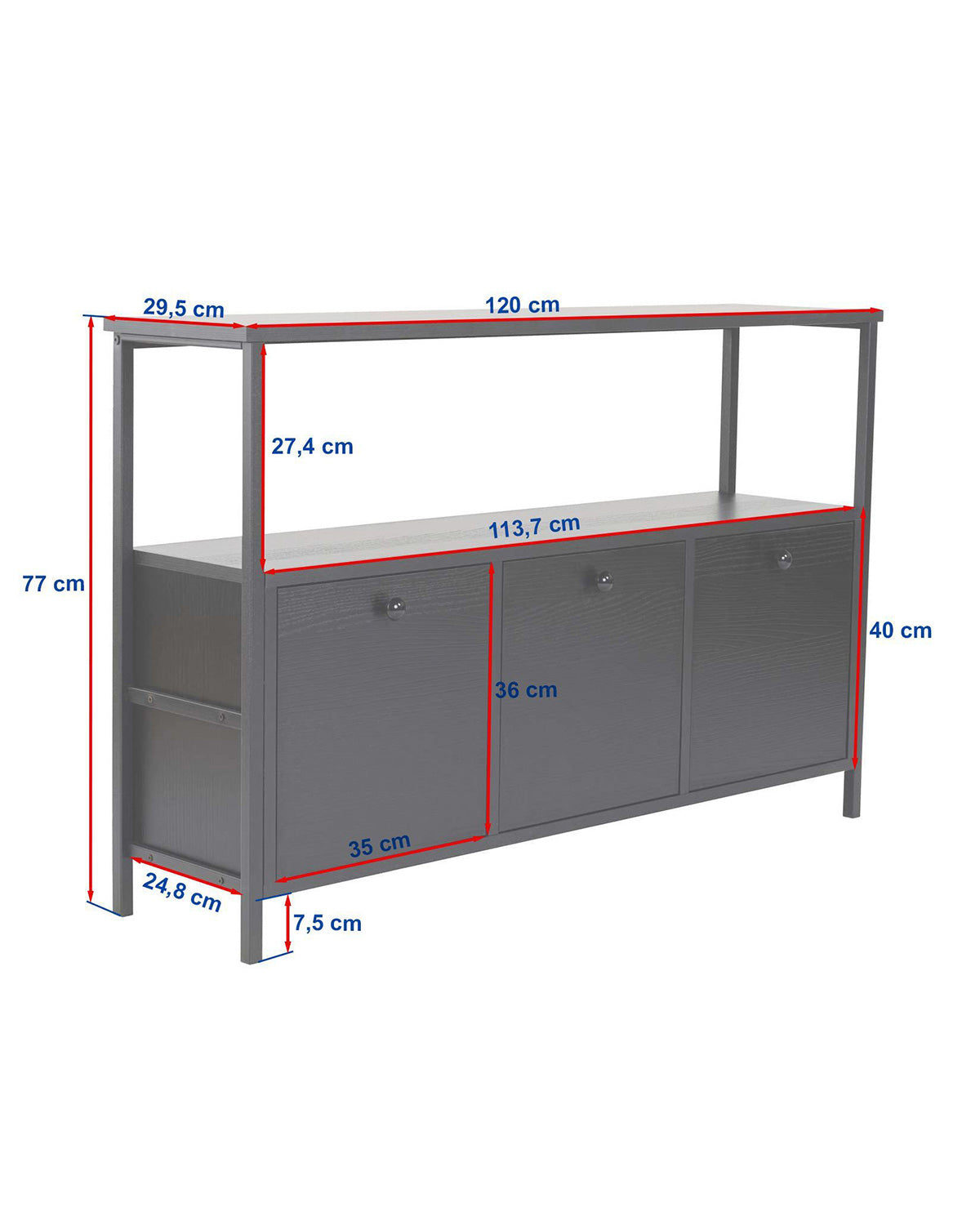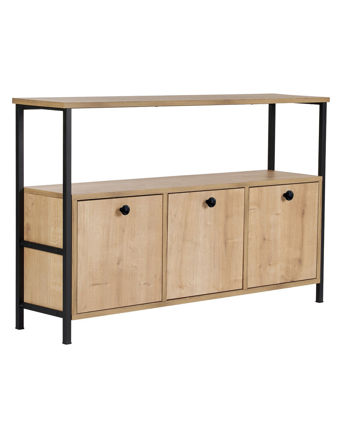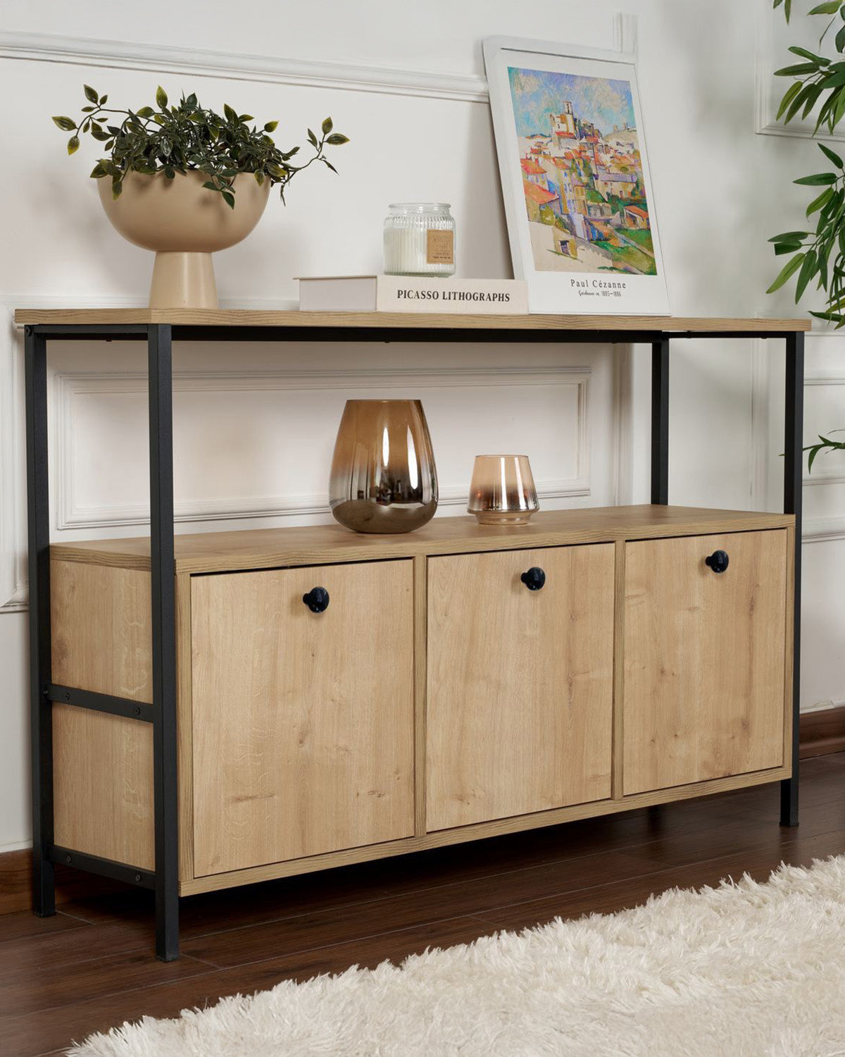 - El aparador Lorrie destaca por su carácter sobrio y elegante, con un acabado en madera oscura que aporta profundidad y un estilo más sofisticado. Su diseño minimalista con estructura en color negro crea un efecto visual equilibrado, ideal para salones o comedores de estética industrial o contemporánea. Dispone de tres puertas que esconden un espacio interior generoso para mantener el orden y almacenar todo tipo de objetos del día a día. Fabricado en tablero de partículas melaminizado, combina durabilidad con una textura agradable y fácil mantenimiento. Las patas metálicas elevan el mueble, aportando ligereza y estabilidad a la composición. Una pieza versátil que se adapta a distintos entornos decorativos, desde interiores modernos hasta ambientes más cálidos. Su superficie superior permite añadir detalles decorativos o piezas de iluminación. Requiere un mantenimiento mínimo: basta con un paño ligeramente humedecido y secado posterior para conservar su acabado.