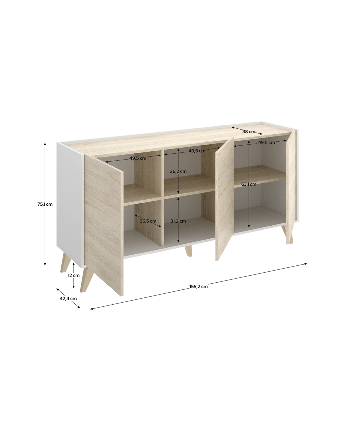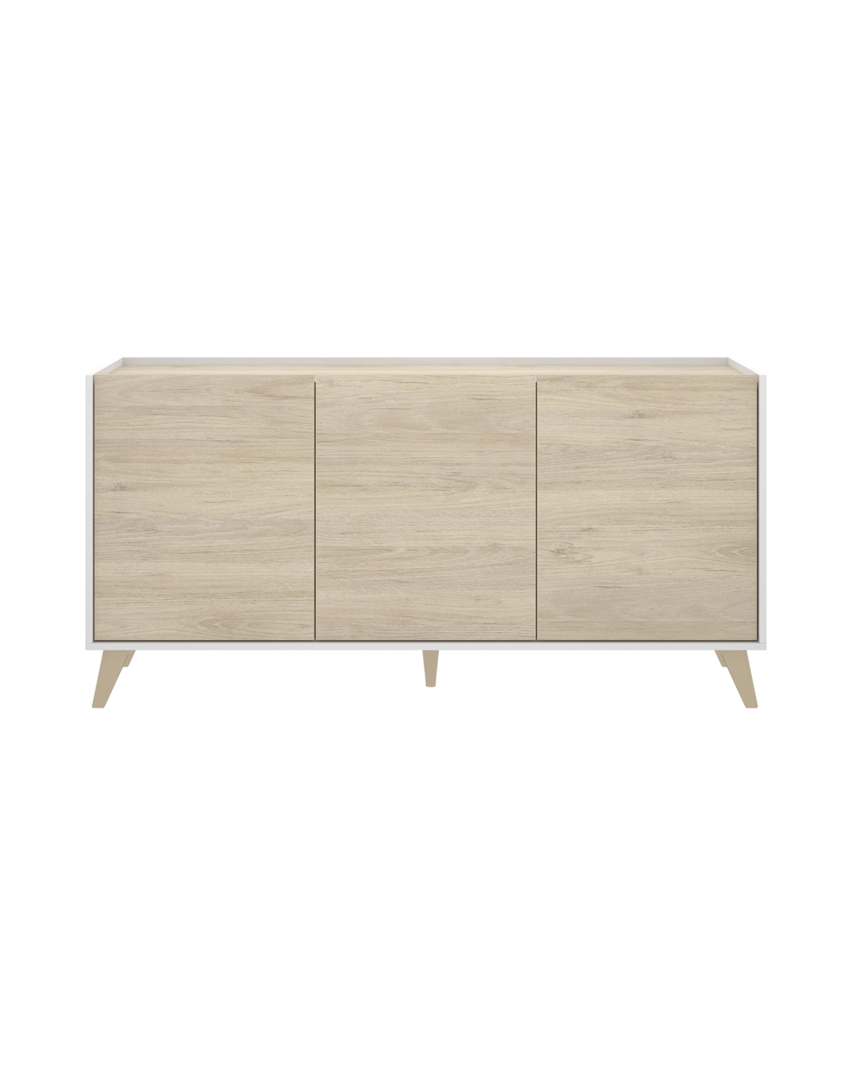 - El aparador Ness destaca por su equilibrio entre diseño contemporáneo y funcionalidad. Con líneas limpias y una cuidada combinación de blanco y madera natural, aporta luminosidad y calidez a cualquier estancia. Su estructura baja y alargada realza la sensación de amplitud y se adapta con facilidad a salones y comedores de estilo nórdico o moderno. Confeccionado en tablero de partículas melaminizado, ofrece una superficie resistente y de mantenimiento sencillo. Las tres puertas ocultan un interior amplio y bien distribuido, ideal para mantener el orden sin renunciar a la estética. Las patas, fabricadas en ABS con acabado roble natural, elevan el mueble y aportan ligereza visual y estabilidad al conjunto. El acabado en blanco refuerza la luminosidad, mientras los detalles en madera natural aportan textura y equilibrio. Un mueble versátil que combina la practicidad del almacenaje diario con un diseño sereno y atemporal, perfecto para crear ambientes ordenados y armónicos.