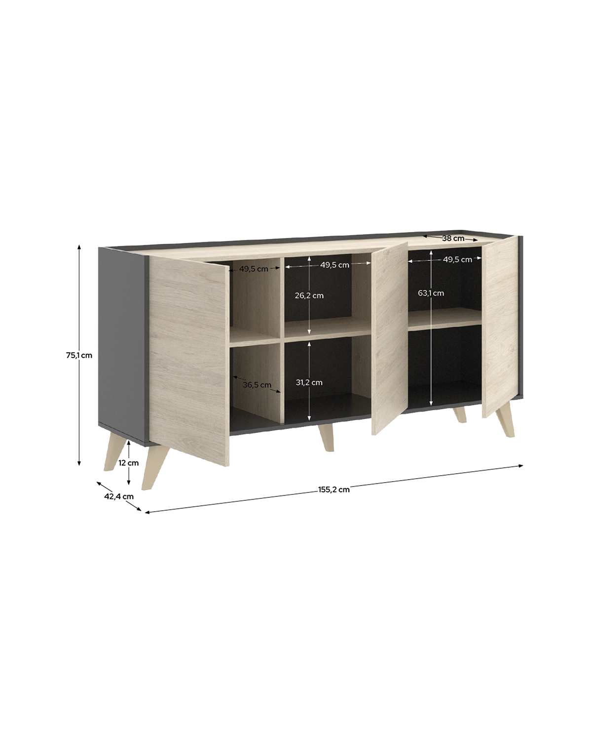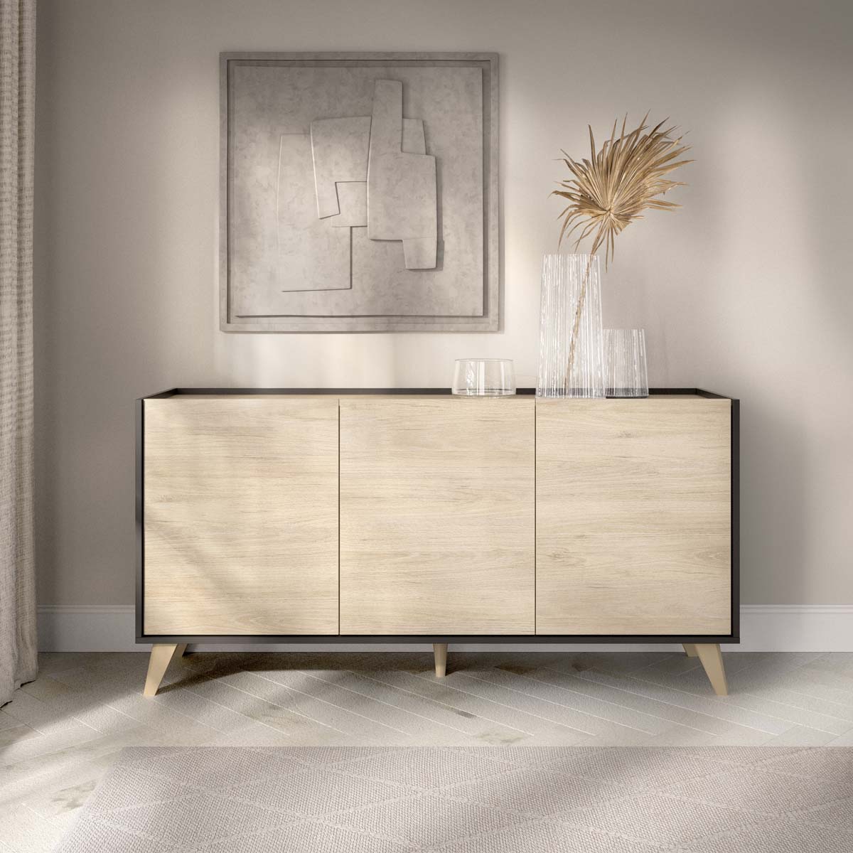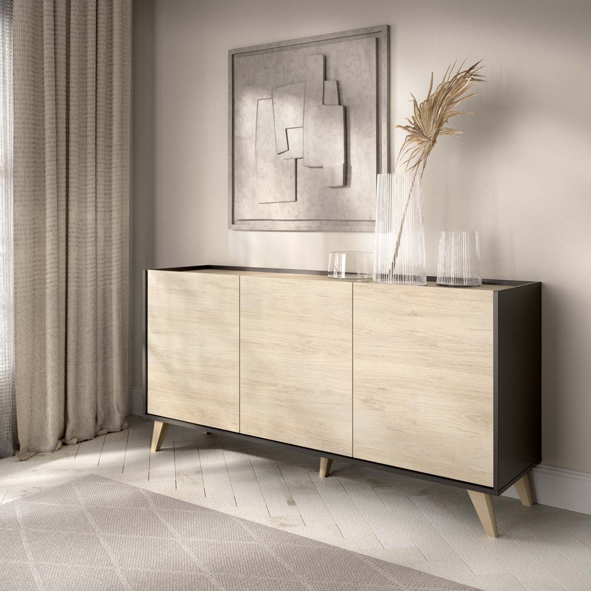 - El aparador Ness combina el encanto del roble natural con la elegancia del tono grafito, logrando una estética sofisticada y actual. Su diseño de líneas depuradas y proporciones equilibradas lo convierte en una pieza clave para aportar estilo y funcionalidad al hogar. Su composición aporta contraste y profundidad sin perder sensación de calidez. Realizado en tablero de partículas melaminizado, garantiza durabilidad y una superficie fácil de limpiar. Las tres puertas ofrecen una gran capacidad interior para organizar vajilla, textiles o documentos, mientras las patas en ABS color roble natural aportan un toque orgánico y elevan la estructura con ligereza. El contraste entre el grafito y la madera natural añade carácter sin resultar recargado, integrándose con facilidad en espacios contemporáneos. Un aparador pensado para quienes buscan orden, estilo y materiales resistentes en una pieza de diseño funcional y elegante.