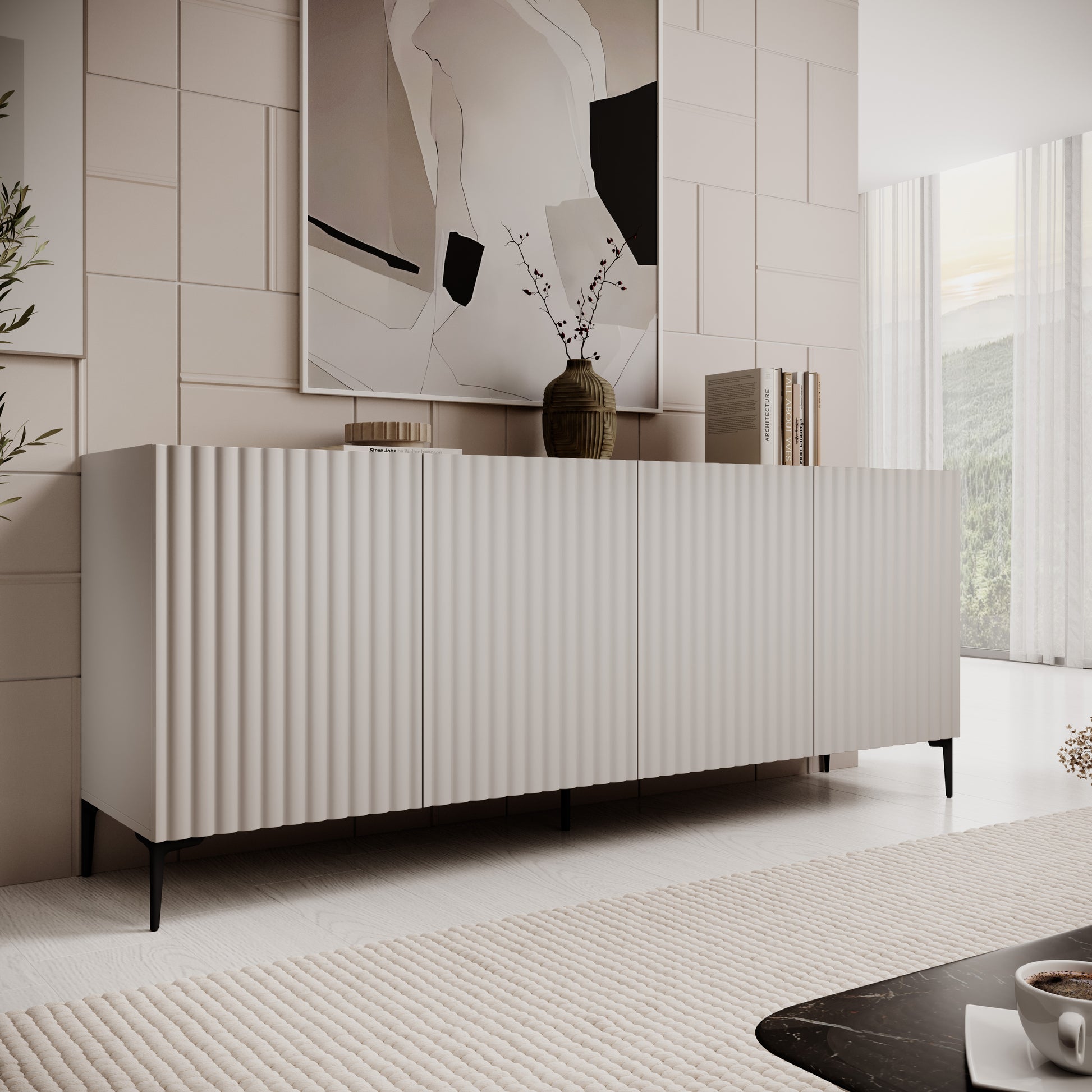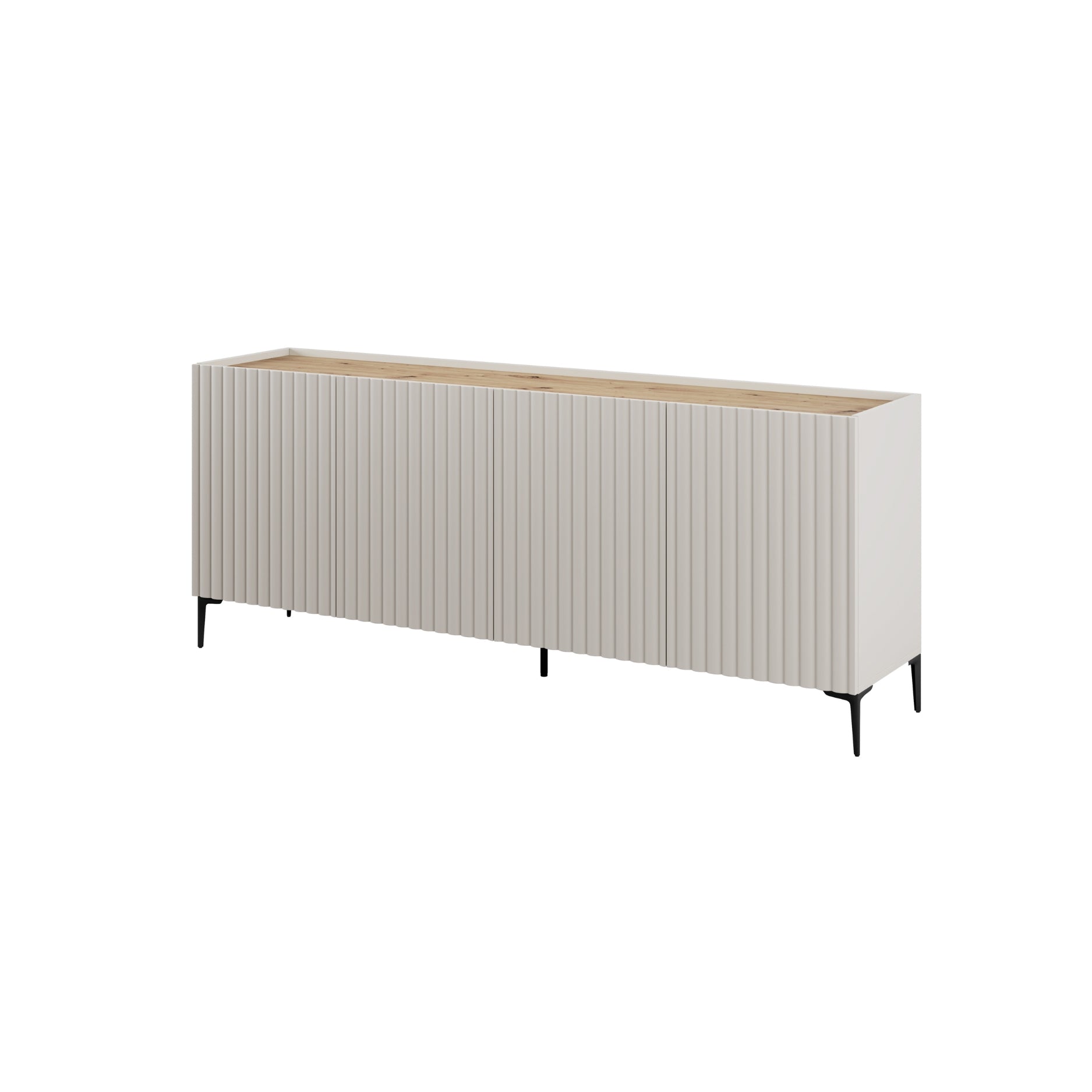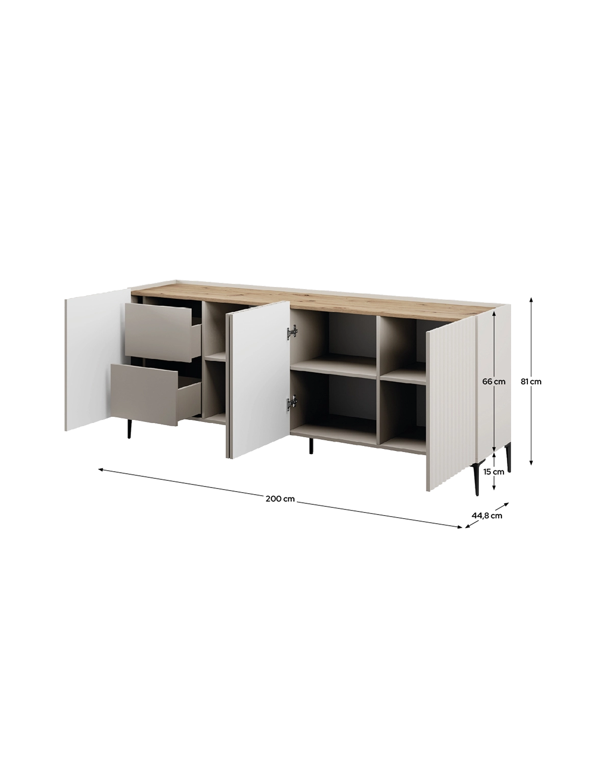 - Este aparador Nora de 200 cm en acabado beige y madera natural es la combinación perfecta entre funcionalidad y estética suave, ideal para ambientes acogedores y contemporáneos. Su diseño alargado destaca como pieza principal del salón o comedor. Dispone de cuatro puertas y dos cajones que multiplican las posibilidades de almacenaje, mientras que los estantes interiores ayudan a mantener todo bien estructurado. Gracias a sus patas de 15 cm, el mueble resulta visualmente ligero y permite limpiar cómodamente por debajo. Fabricado en tablero laminado y equipado con herrajes y patas metálicas, es un aparador sólido, estable y preparado para acompañarte durante muchos años sin perder su estilo.