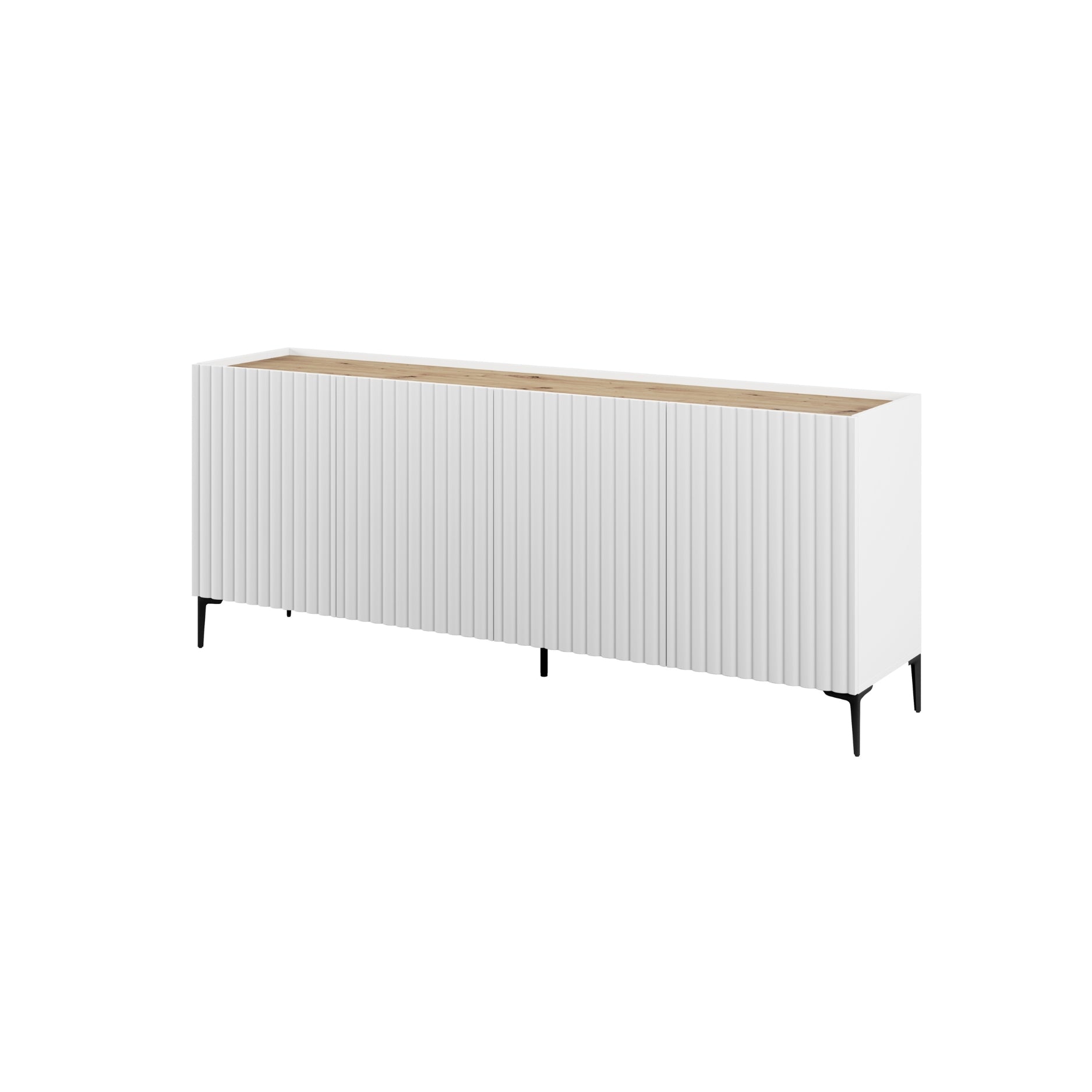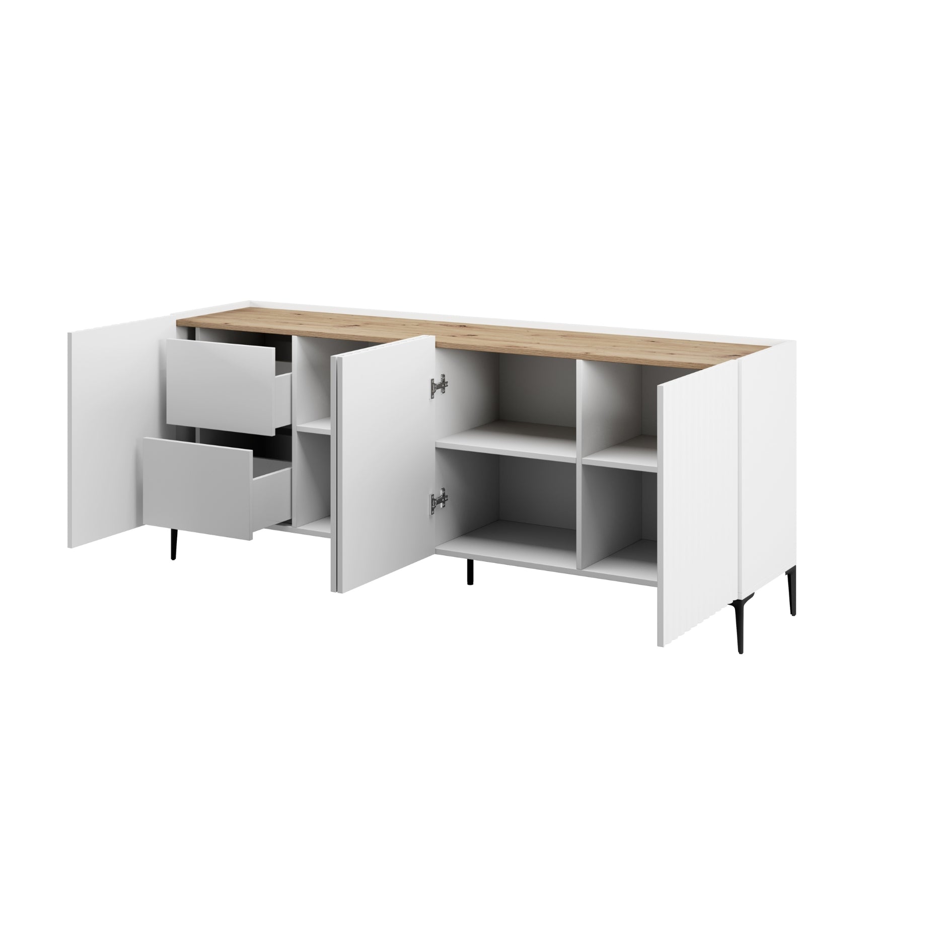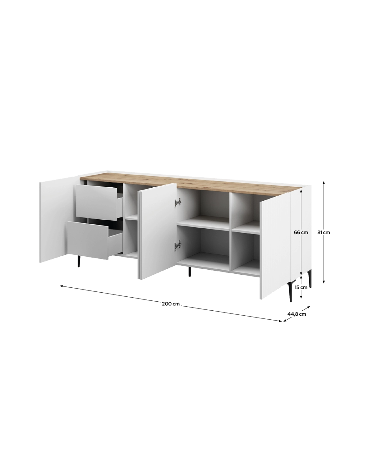 - La versión de 200 cm del aparador Nora destaca por su gran capacidad de almacenaje, ideal para quienes necesitan un mueble amplio y funcional sin renunciar al diseño. El contraste entre blanco y madera natural aporta frescura y calidez en partes iguales. Cuenta con cuatro puertas y dos cajones, ofreciendo una solución muy completa para guardar desde vajilla hasta documentos o artículos de uso diario. Los estantes interiores optimizan el espacio, manteniendo todo bien organizado y accesible. Su fabricación en tablero laminado y su estructura con patas y bisagras metálicas garantizan resistencia y durabilidad, convirtiéndolo en una pieza perfecta para el uso continuado en el día a día.
