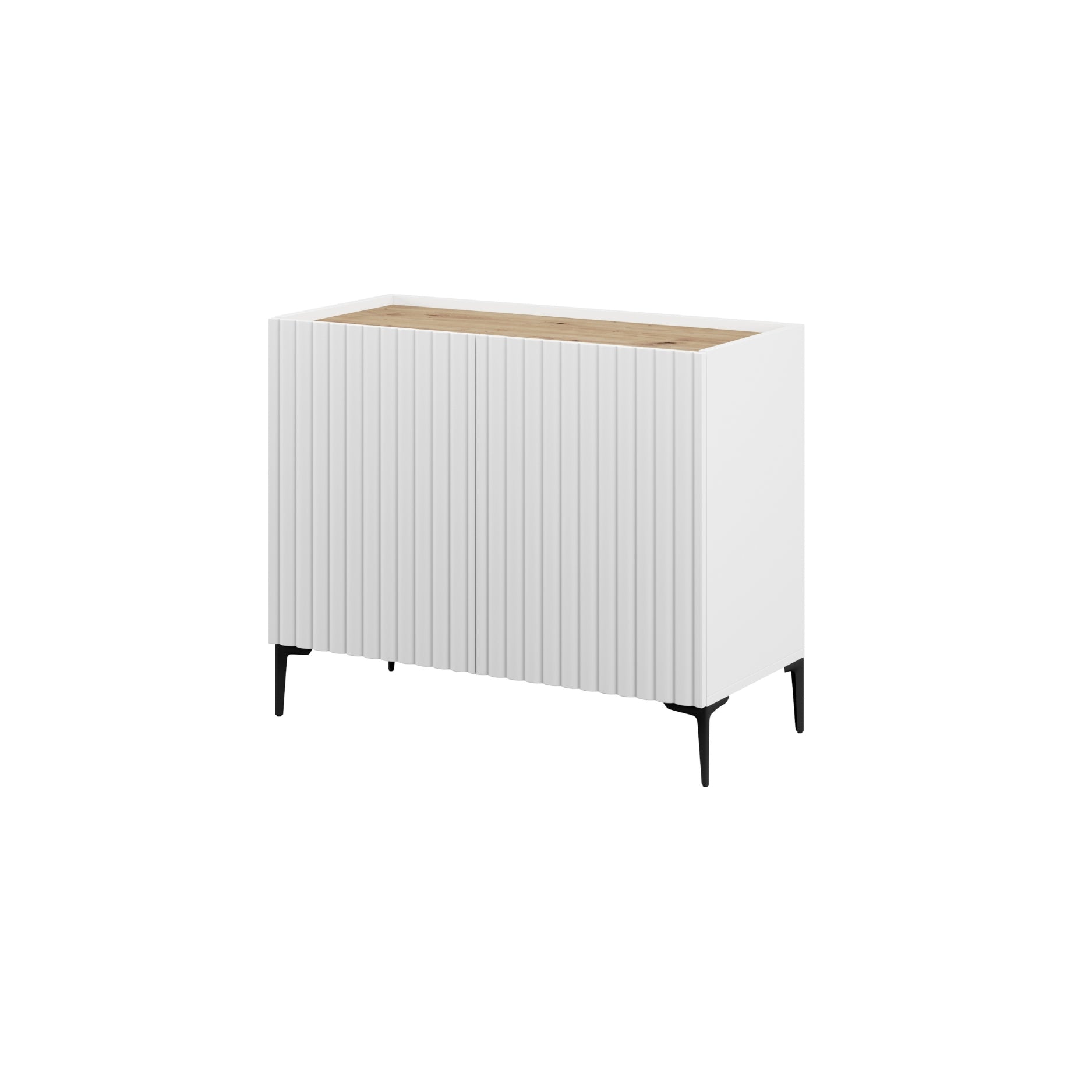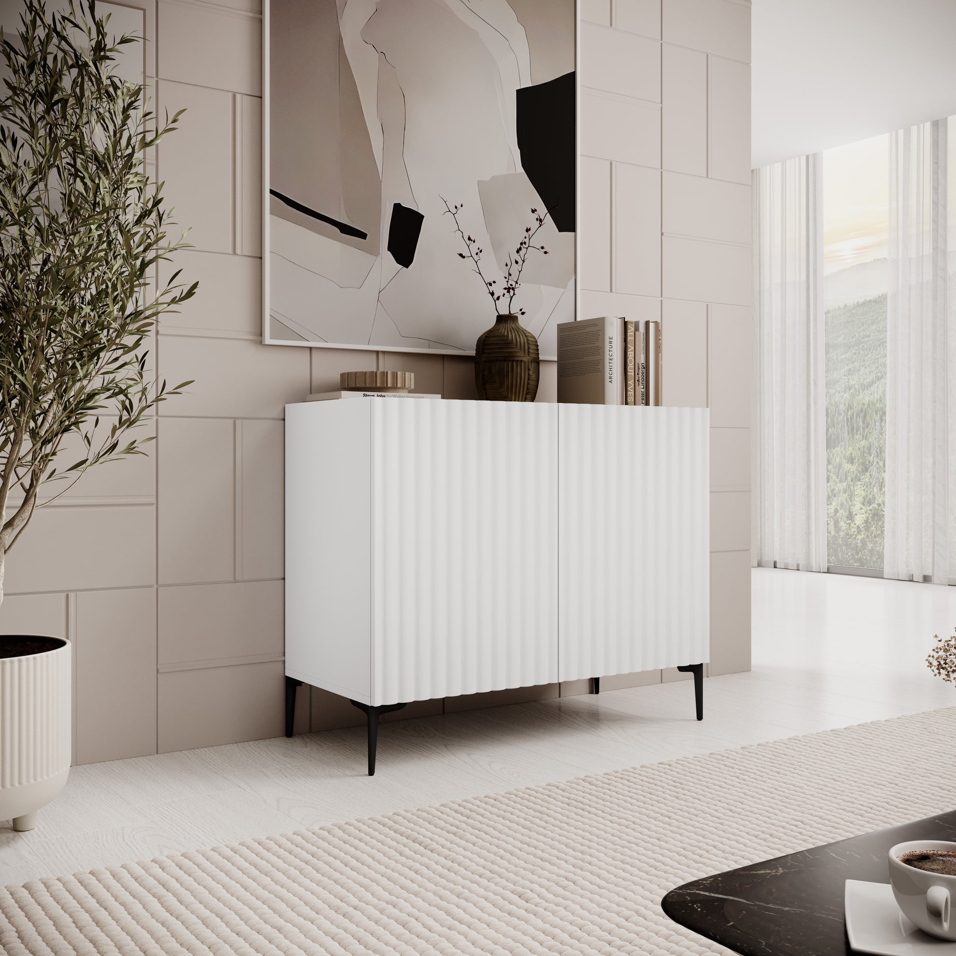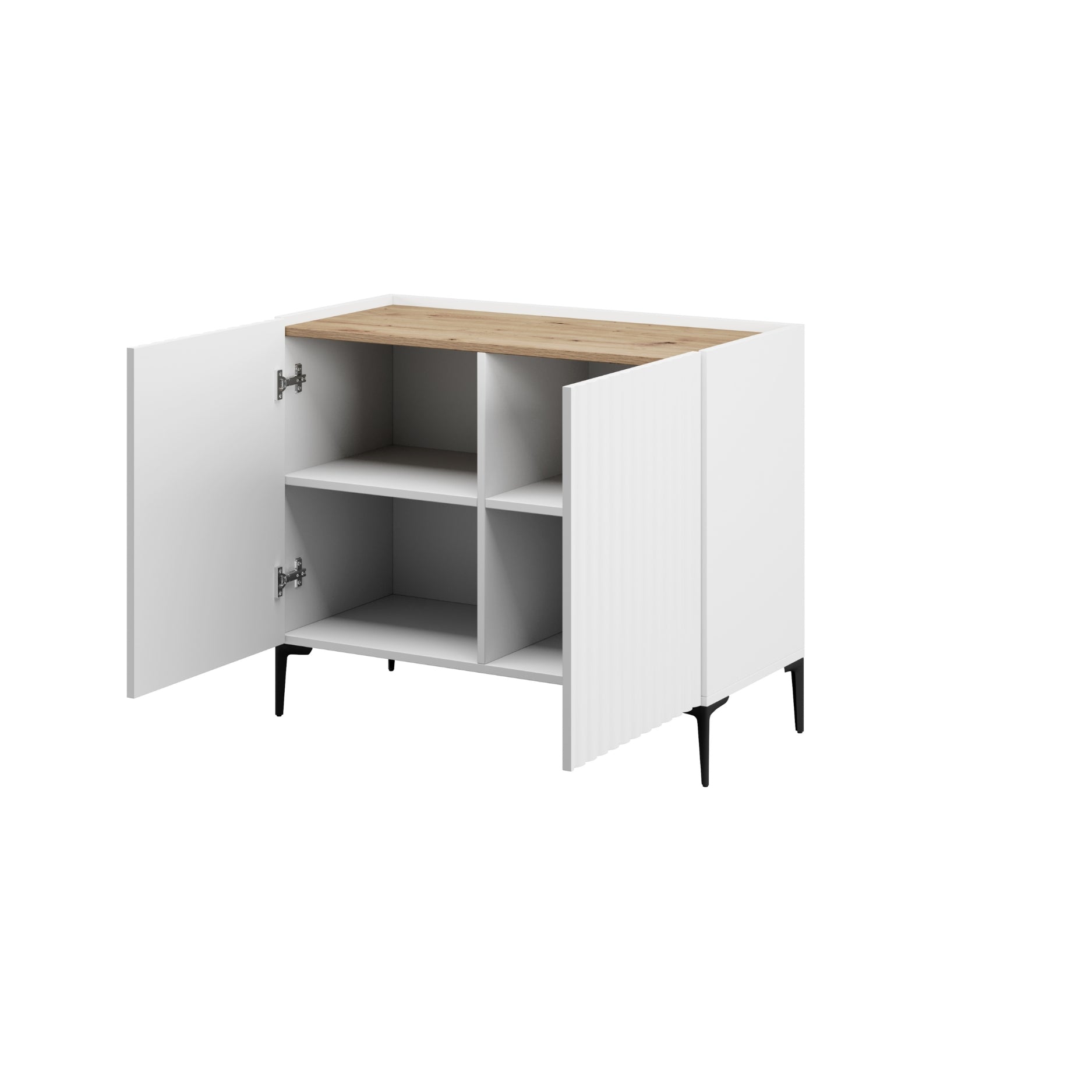- Este aparador alto en blanco y madera natural es ideal para complementar el almacenamiento del salón o comedor sin ocupar demasiado espacio horizontal. Con cuatro puertas y estantes interiores, ofrece una excelente capacidad para organizar vajilla, documentos o accesorios. Su formato compacto de 98 cm de ancho y sus patas metálicas de 15 cm aportan estabilidad y un estilo moderno. La combinación de colores crea un ambiente luminoso y acogedor. Fabricado en tablero laminado y equipado con bisagras y guías metálicas resistentes, pensado para un uso diario cómodo y duradero.