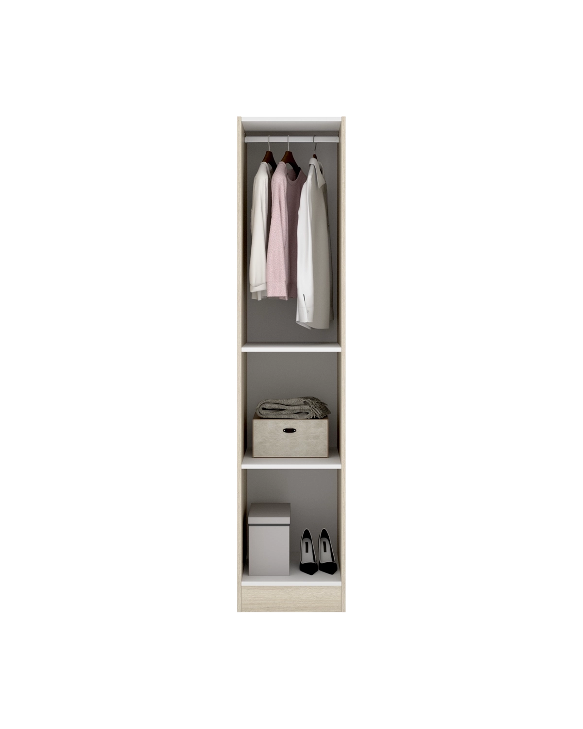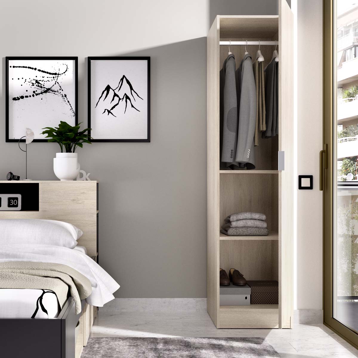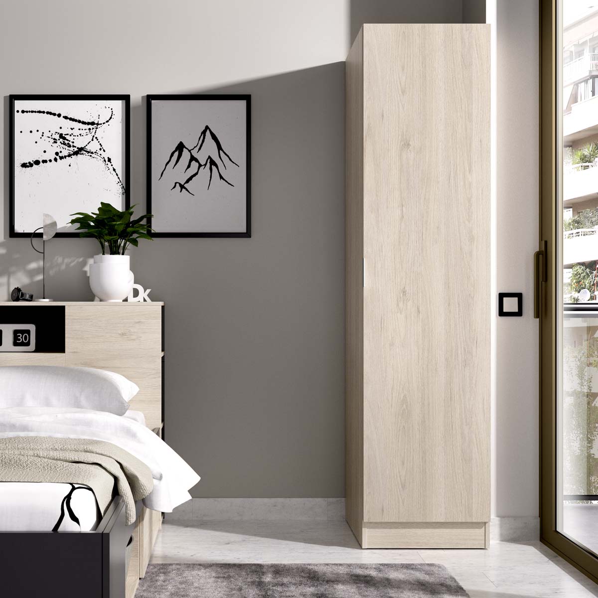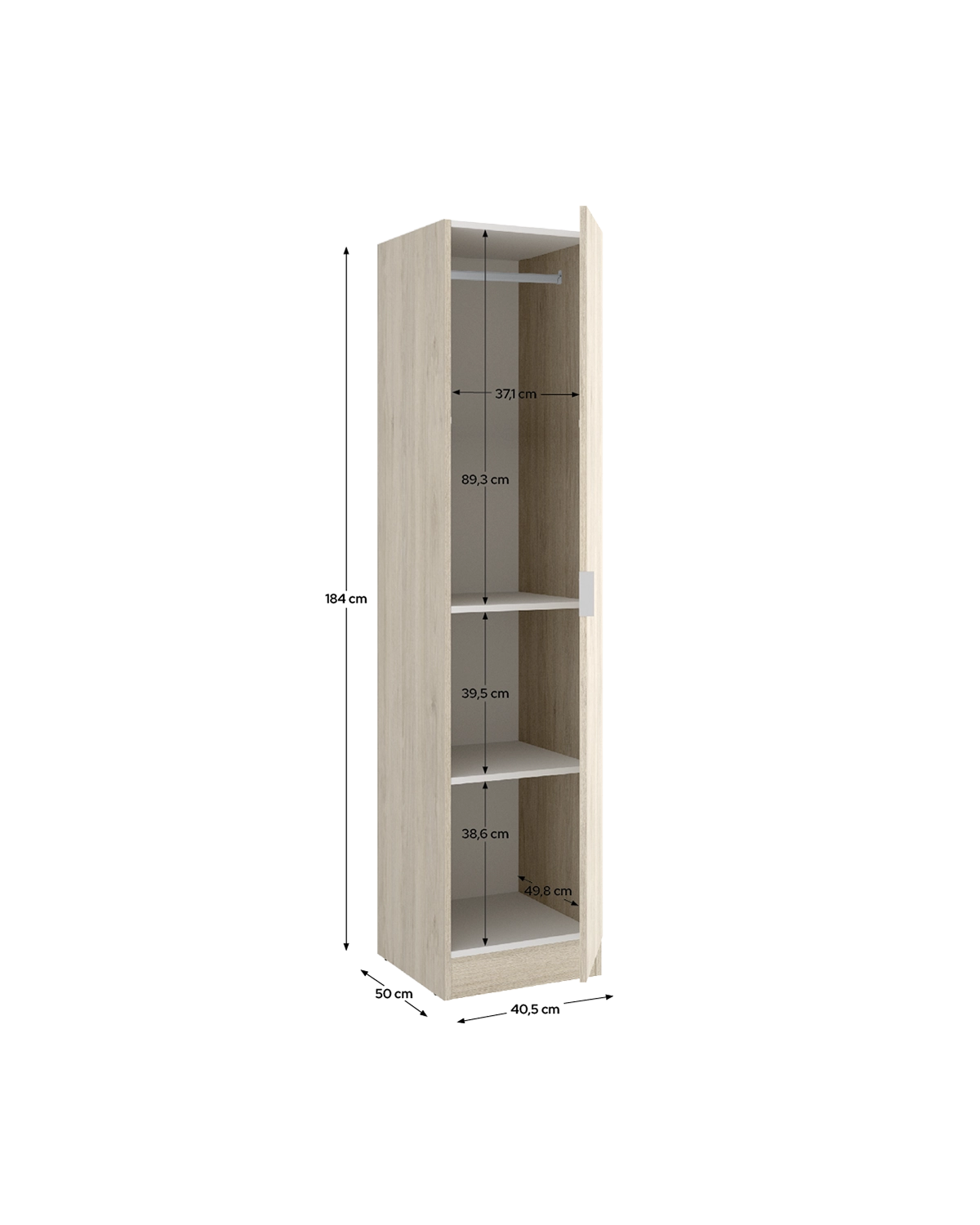 - El armario Essen de una puerta batiente en acabado madera natural combina calidez y practicidad en un formato compacto. Su diseño sencillo y funcional lo convierte en una pieza perfecta para dormitorios, vestidores o habitaciones auxiliares donde el espacio es limitado. Tras la puerta abatible se oculta un interior bien distribuido, con barra metálica de colgar y estantes regulables que facilitan mantener el orden en prendas o accesorios. Fabricado en tablero melaminizado de alta calidad, este armario ofrece resistencia y un mantenimiento sencillo. Las bisagras y herrajes metálicos garantizan un cierre estable, mientras que los tiradores de aluminio completan su estética moderna. Los tacos ABS antirrayaduras cuidan el suelo y aportan mayor estabilidad al conjunto. Su acabado en madera natural aporta un toque acogedor y realista, capaz de integrarse en diferentes estilos decorativos, desde los más actuales hasta los más clásicos. El armario Essen de una puerta es una solución práctica y decorativa que ofrece funcionalidad, durabilidad y una presencia cálida en cualquier espacio.