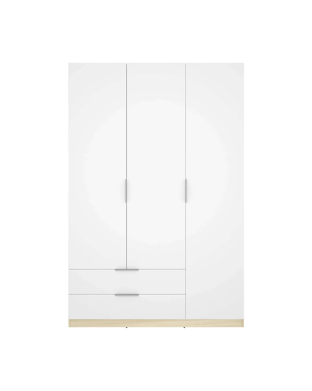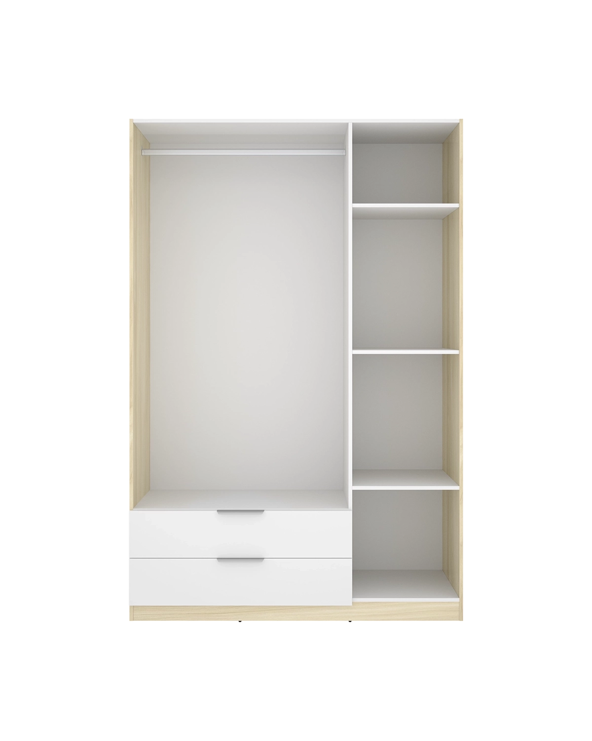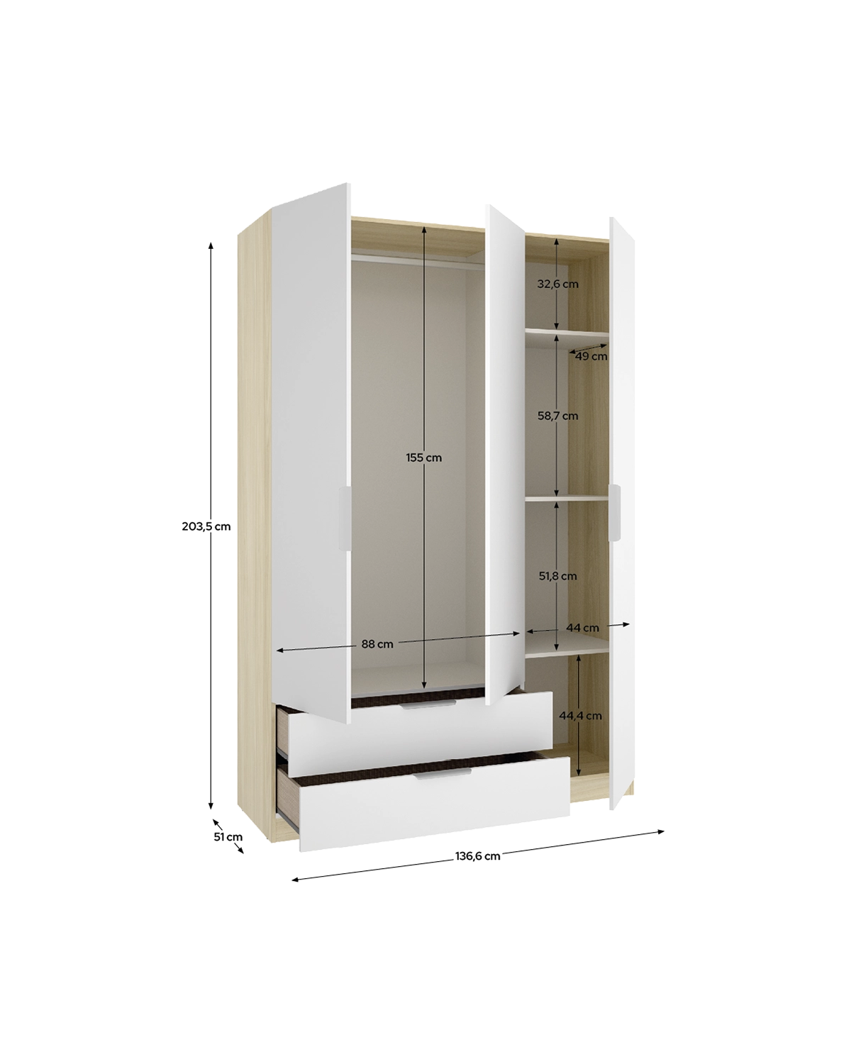 - El armario Emax en blanco y madera natural une la luminosidad del blanco con la calidez del roble, ofreciendo un diseño moderno y armónico. Sus 203 cm de altura proporcionan una capacidad de almacenaje excelente, ideal para mantener la ropa y los complementos perfectamente organizados. Su combinación de tonos neutros lo hace fácil de integrar en cualquier estilo decorativo. Cuenta con tres puertas batientes que facilitan el acceso completo al interior, equipado con barras para colgar, estantes regulables y dos cajones inferiores para una organización más detallada. Cada elemento está pensado para ofrecer comodidad y funcionalidad en el uso diario. Fabricado en tablero melaminizado de 15 mm, dispone de tiradores y barra de aluminio, guías metálicas en los cajones y tacos ABS antirrayaduras y quitarruidos. Un mueble resistente, práctico y elegante que combina diseño, durabilidad y equilibrio visual.