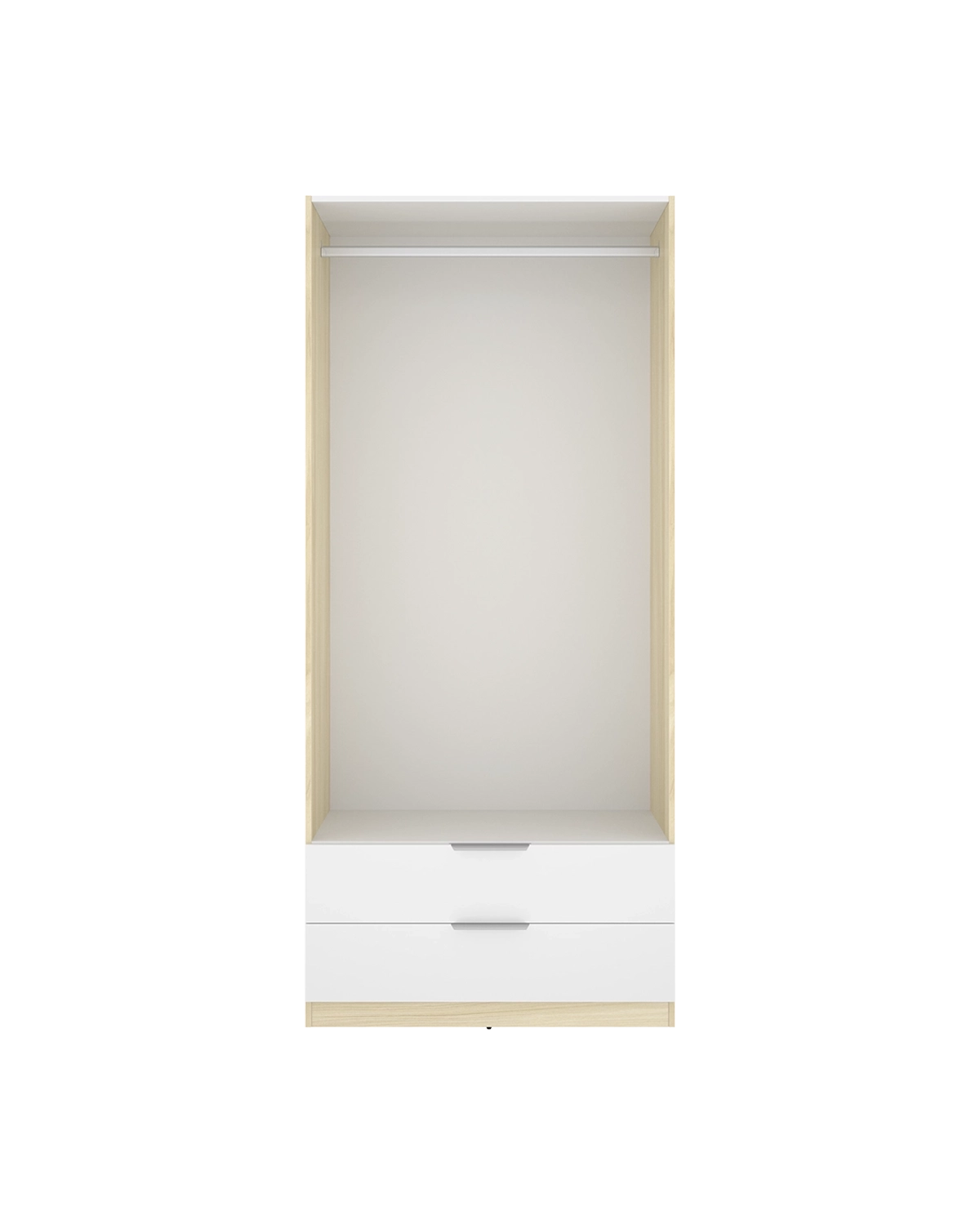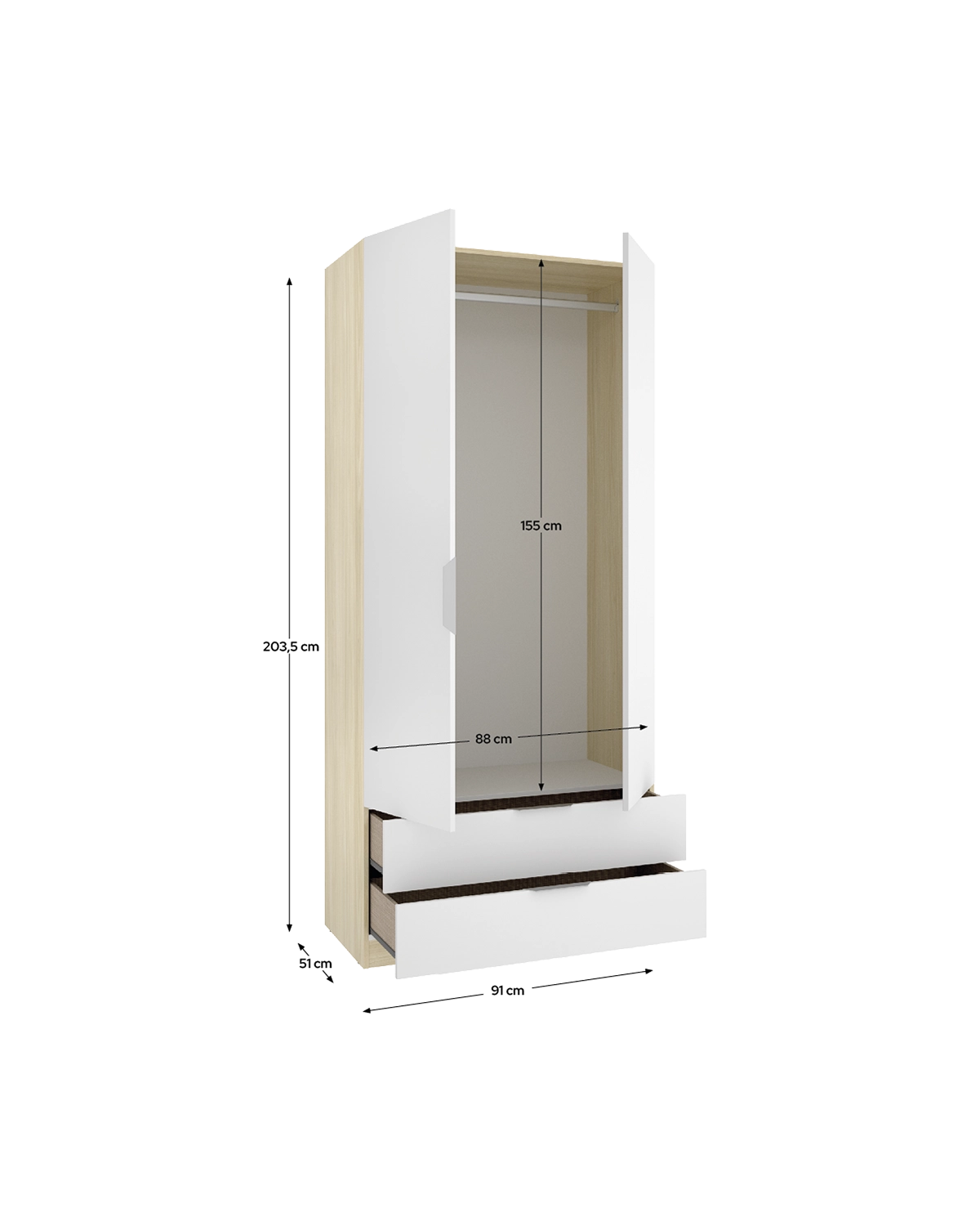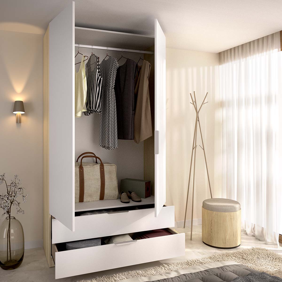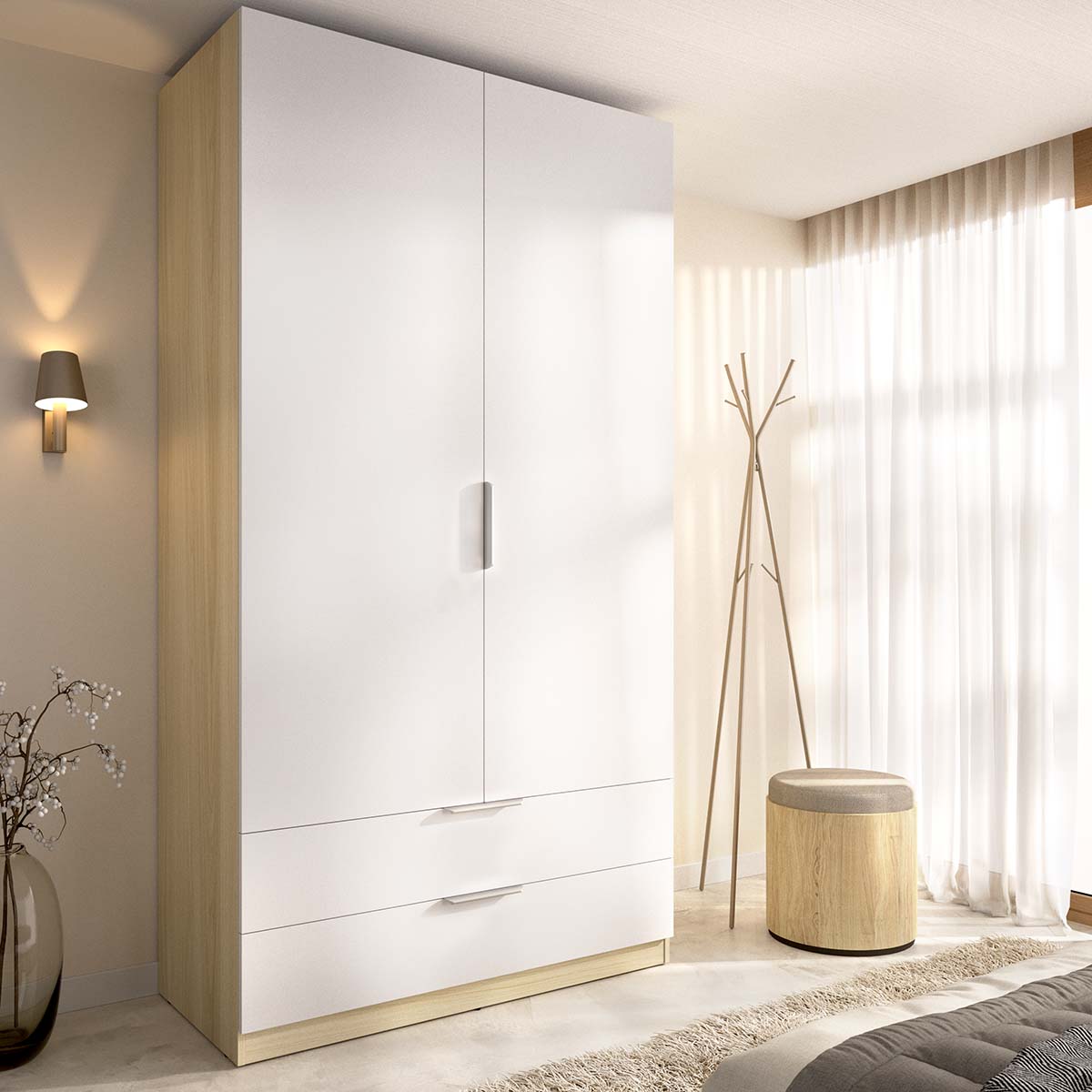 - El armario Emax en blanco y madera natural combina la pureza del blanco con la calidez del roble, creando una pieza moderna y elegante. Con una altura de 203 cm, ofrece una excelente capacidad de almacenaje en un formato compacto, ideal para dormitorios actuales que buscan equilibrio entre estética y funcionalidad. El interior incluye barra metálica y estantes regulables, junto con dos cajones inferiores que amplían las posibilidades de orden y clasificación. Las puertas batientes garantizan un acceso completo al interior, facilitando la organización diaria de prendas y complementos. Fabricado en tablero melaminizado de 15 mm, con tiradores y barra de aluminio y guías metálicas en los cajones, incorpora además tacos ABS quitarruidos y antirrayaduras. Su mezcla de tonos neutros y naturales aporta armonía visual y una sensación de orden duradero.