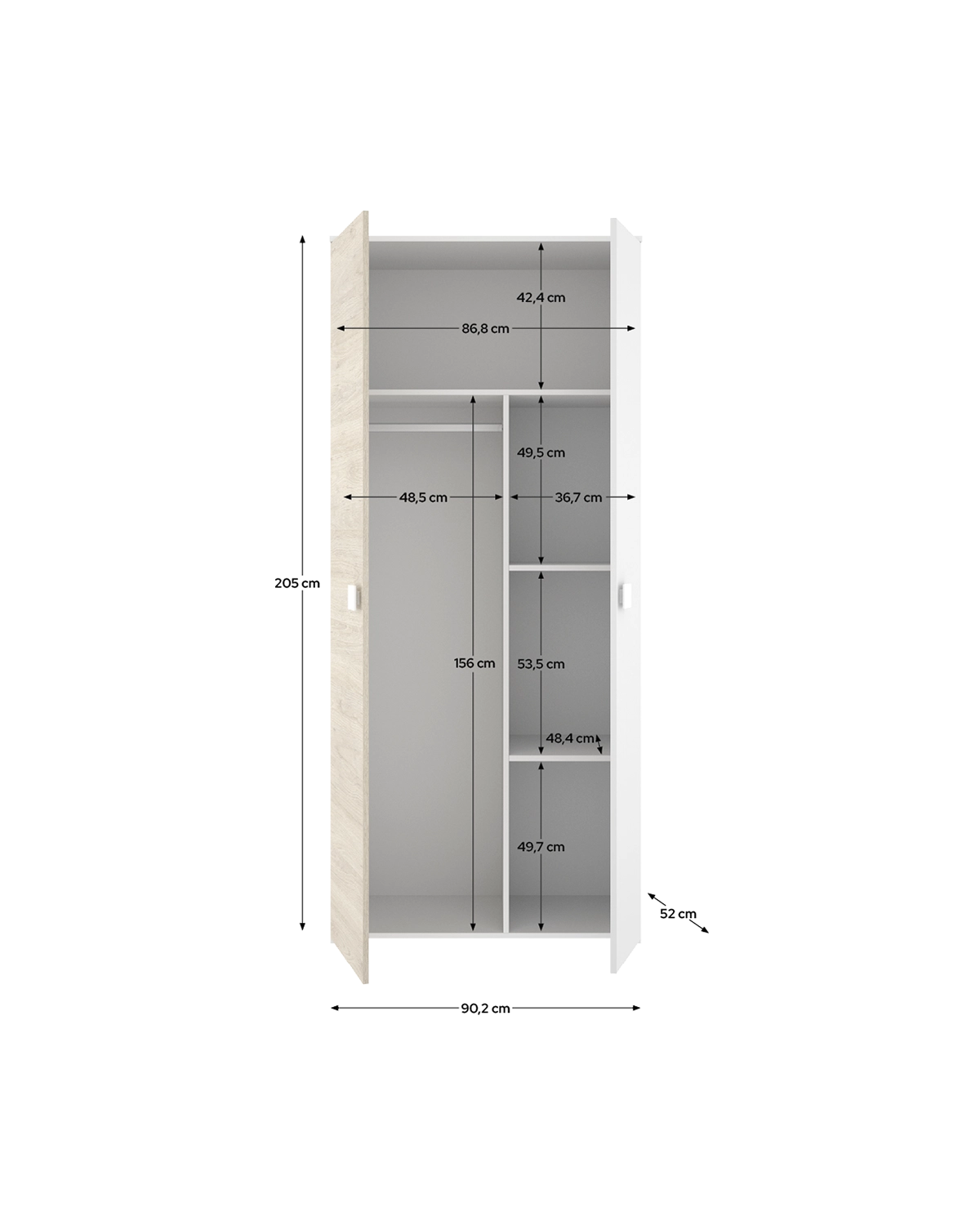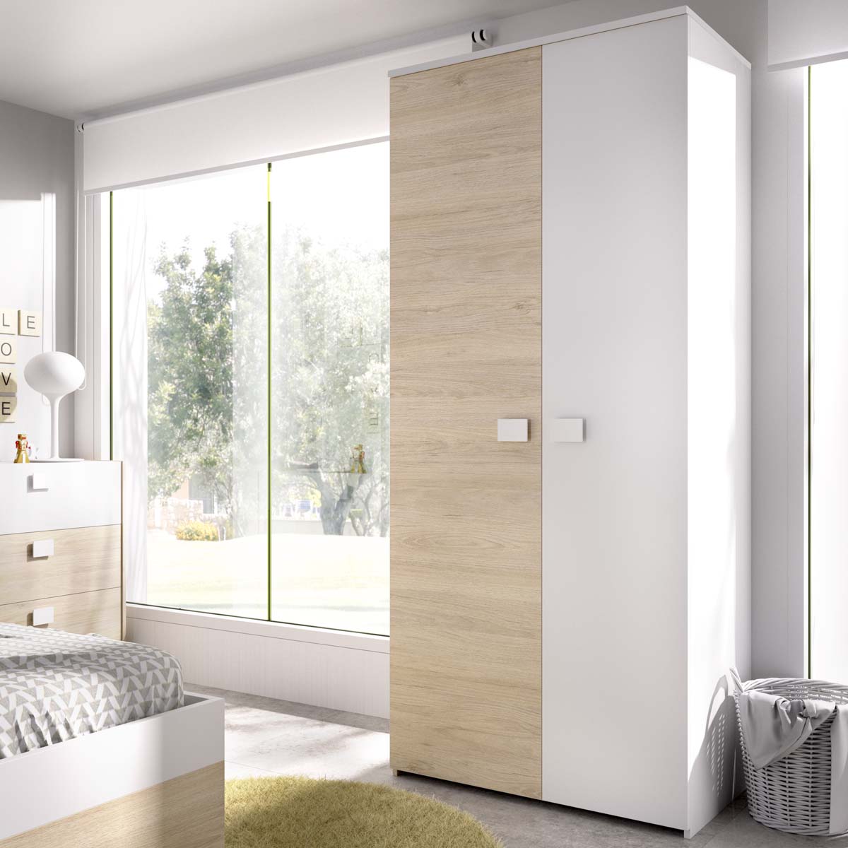 - El armario Dina de puertas batientes combina funcionalidad y diseño con una estética cálida que mezcla el blanco con la madera natural, ideal para dormitorios juveniles donde se busca equilibrio entre orden y estilo. Su interior bien distribuido ofrece una barra metálica para colgar la ropa y varios estantes que facilitan mantener todo organizado: desde camisetas y chaquetas hasta mochilas o complementos. Gracias a su estructura robusta y a los tacos ABS antirrayaduras, resulta una pieza práctica y resistente para el uso diario. El acabado en tablero melaminizado garantiza durabilidad y fácil limpieza, manteniendo su aspecto impecable con el paso del tiempo. Las bisagras metálicas y los tiradores en ABS aportan solidez y un toque moderno que encaja en ambientes jóvenes y dinámicos. La barra de aluminio permite aprovechar al máximo el espacio interior sin renunciar a una sensación ligera y ordenada. Su combinación de blanco y madera lo convierte en un mueble versátil que se adapta tanto a habitaciones juveniles de estilo nórdico como a espacios más modernos. Dina es una solución funcional y estética para quienes buscan un armario juvenil con personalidad, capaz de acompañar el crecimiento y las necesidades del día a día.