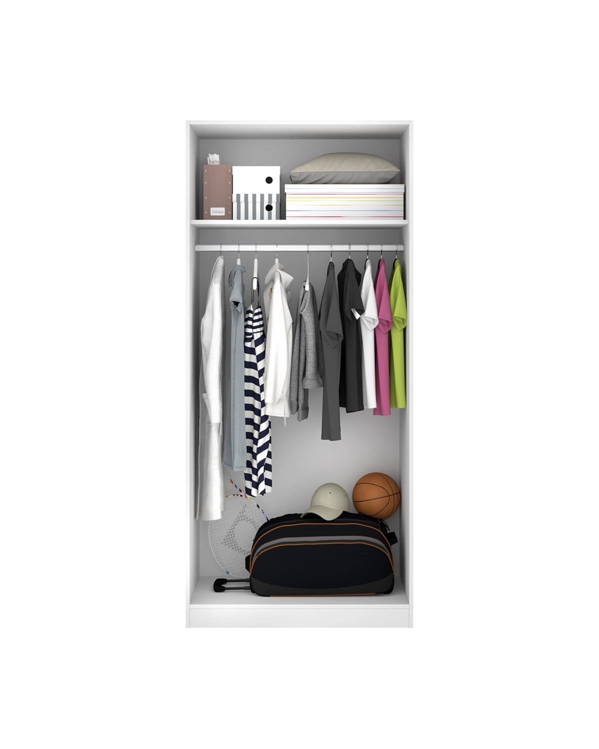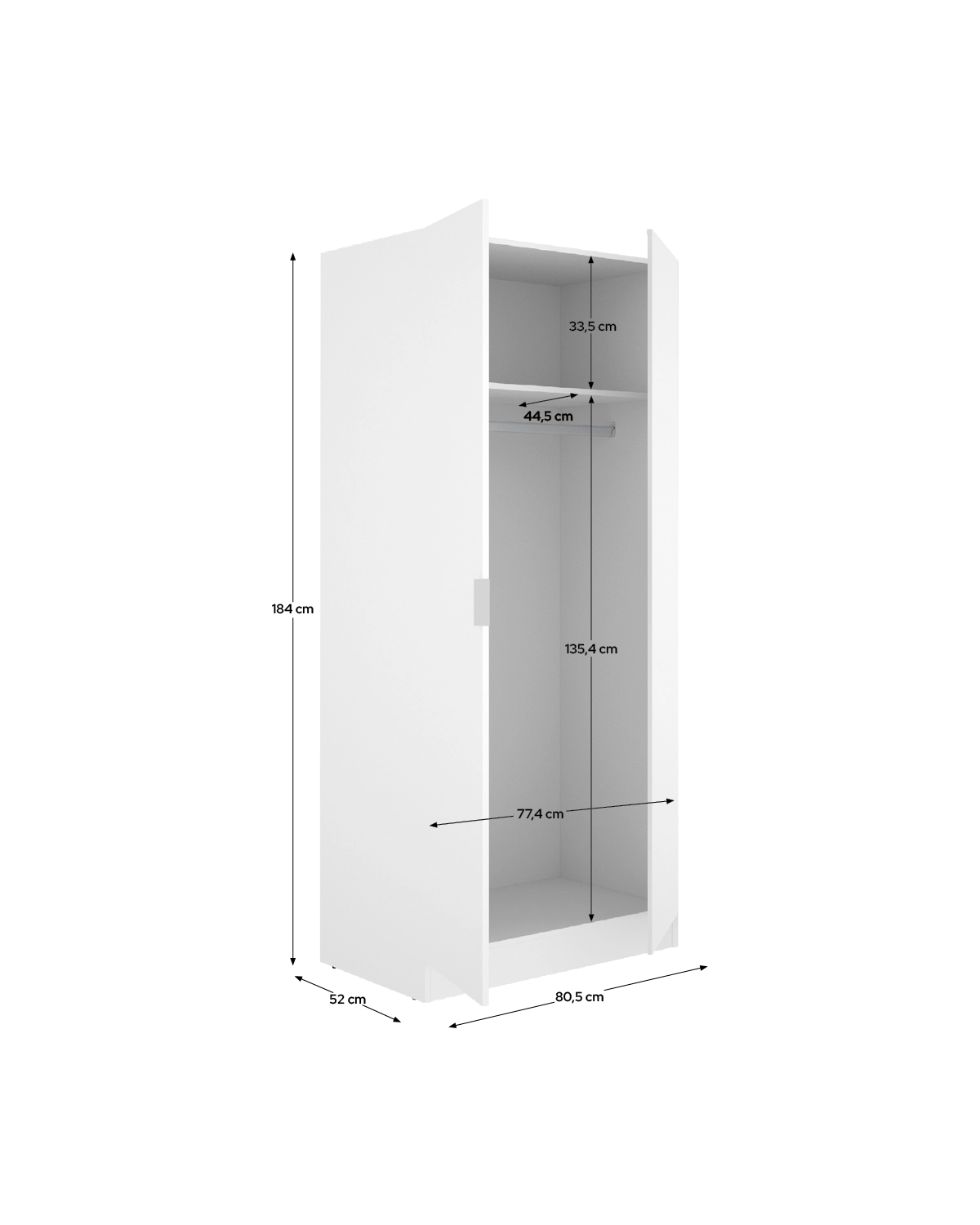 - El armario Essen blanco de dos puertas batientes ofrece un equilibrio perfecto entre capacidad y diseño, adaptándose con facilidad a distintos tipos de dormitorios. Su acabado blanco amplía la luminosidad y transmite sensación de orden, mientras que las dos puertas abatibles permiten un acceso cómodo al interior. Equipado con una barra metálica para colgar ropa y estantes interiores, facilita mantener la organización de prendas dobladas, bolsos o calzado. Su estructura de tablero melaminizado aporta solidez y resistencia, asegurando un uso prolongado y un mantenimiento sencillo. Las bisagras metálicas garantizan un cierre suave y preciso, los tiradores de aluminio refuerzan su estética moderna y los tacos protectores antirrayaduras añaden confort y estabilidad. El diseño limpio y funcional del Essen blanco se integra fácilmente en ambientes contemporáneos o escandinavos, aportando equilibrio y armonía visual. Es un armario versátil, ideal tanto como pieza independiente como combinado con otros módulos de la colección, ofreciendo una solución práctica y elegante para mantener el orden.