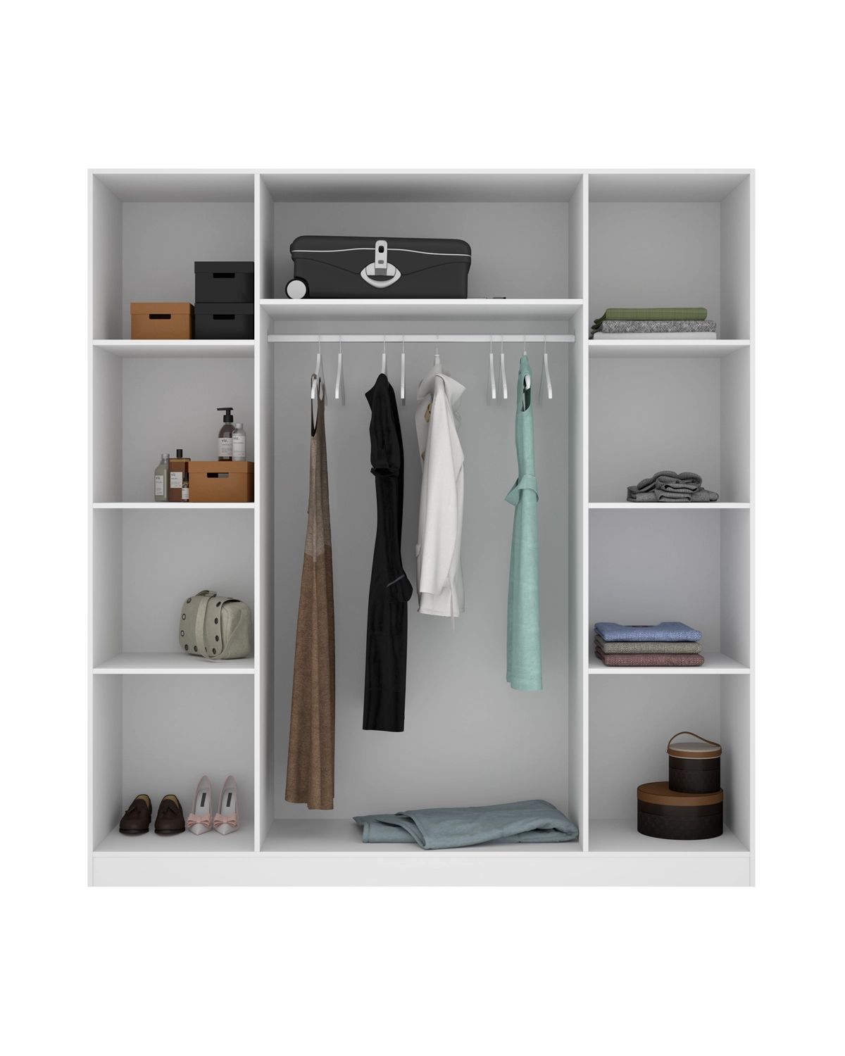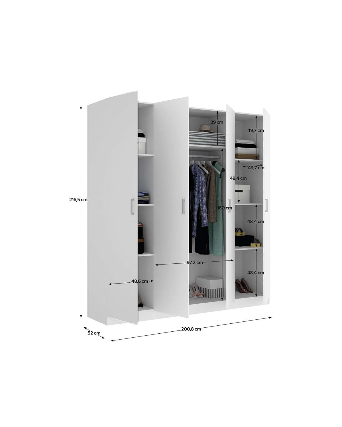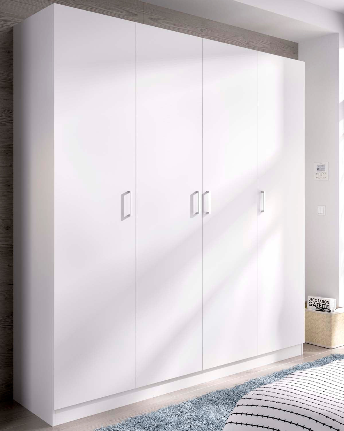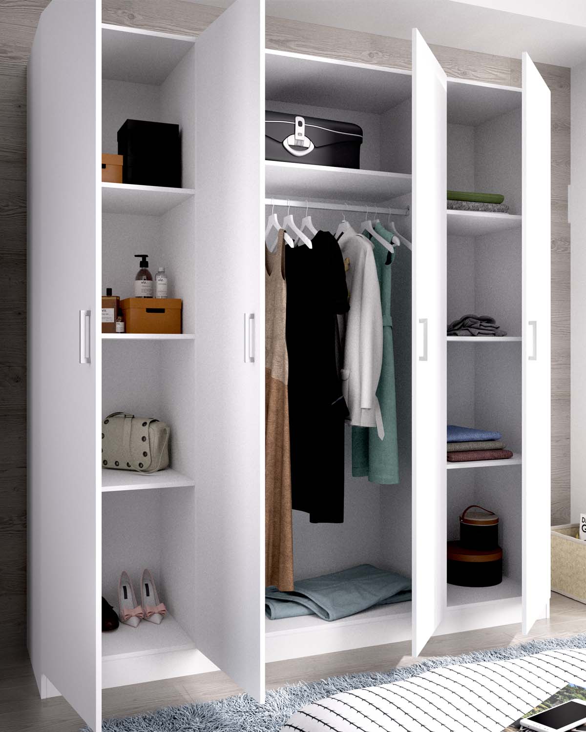 - El armario Maxi de puertas batientes sin cajones destaca por su gran altura de 215 cm, una característica clave que permite maximizar el almacenamiento vertical y mantener el dormitorio ordenado y despejado. Su diseño amplio lo convierte en una solución práctica para espacios que requieren gran capacidad interior. Con 200 cm de ancho, dispone de cuatro puertas batientes que dan acceso a un interior espacioso con estantes regulables y barra de colgar de aluminio, ideal para organizar prendas largas, ropa doblada y complementos. Su distribución interior favorece una organización clara y funcional. Fabricado en tablero de partículas melaminizado de 16 mm y trasera de fibras de densidad media, ofrece una estructura sólida y duradera. El acabado en blanco aporta luminosidad y una estética neutra que encaja en dormitorios modernos, nórdicos o minimalistas. Incluye sistema de fijación a pared para mayor seguridad y estabilidad.