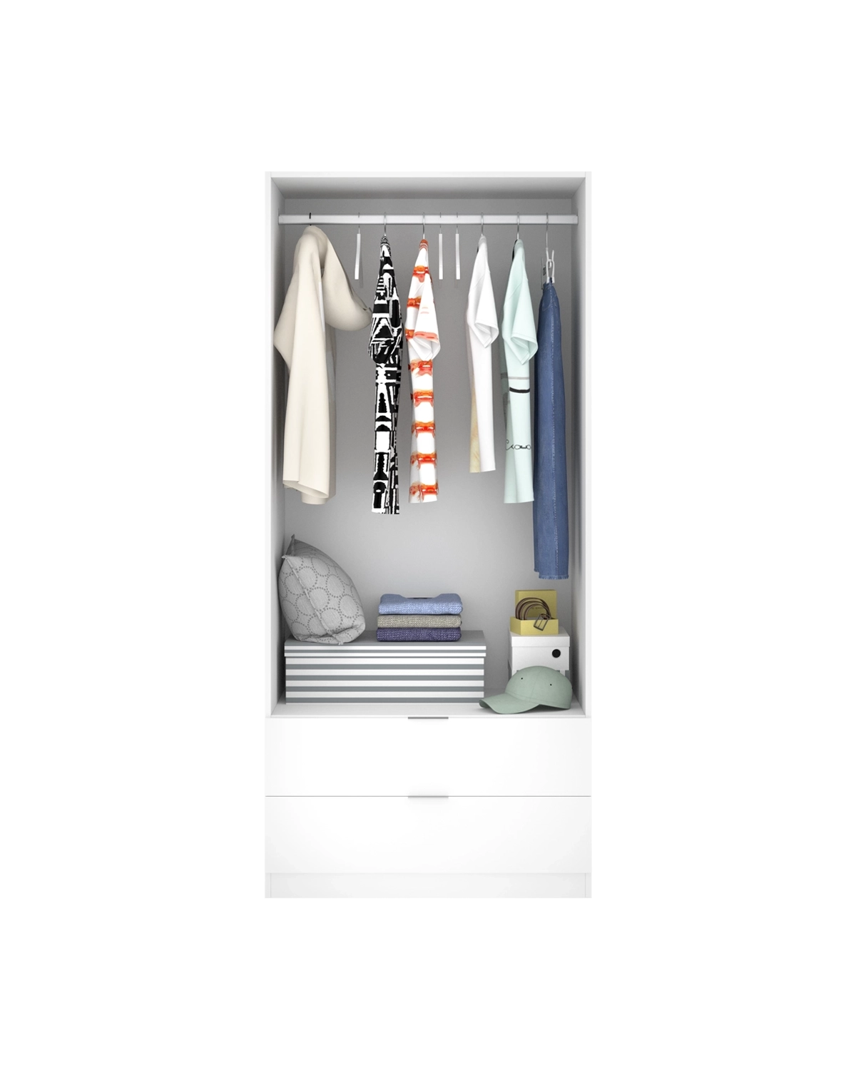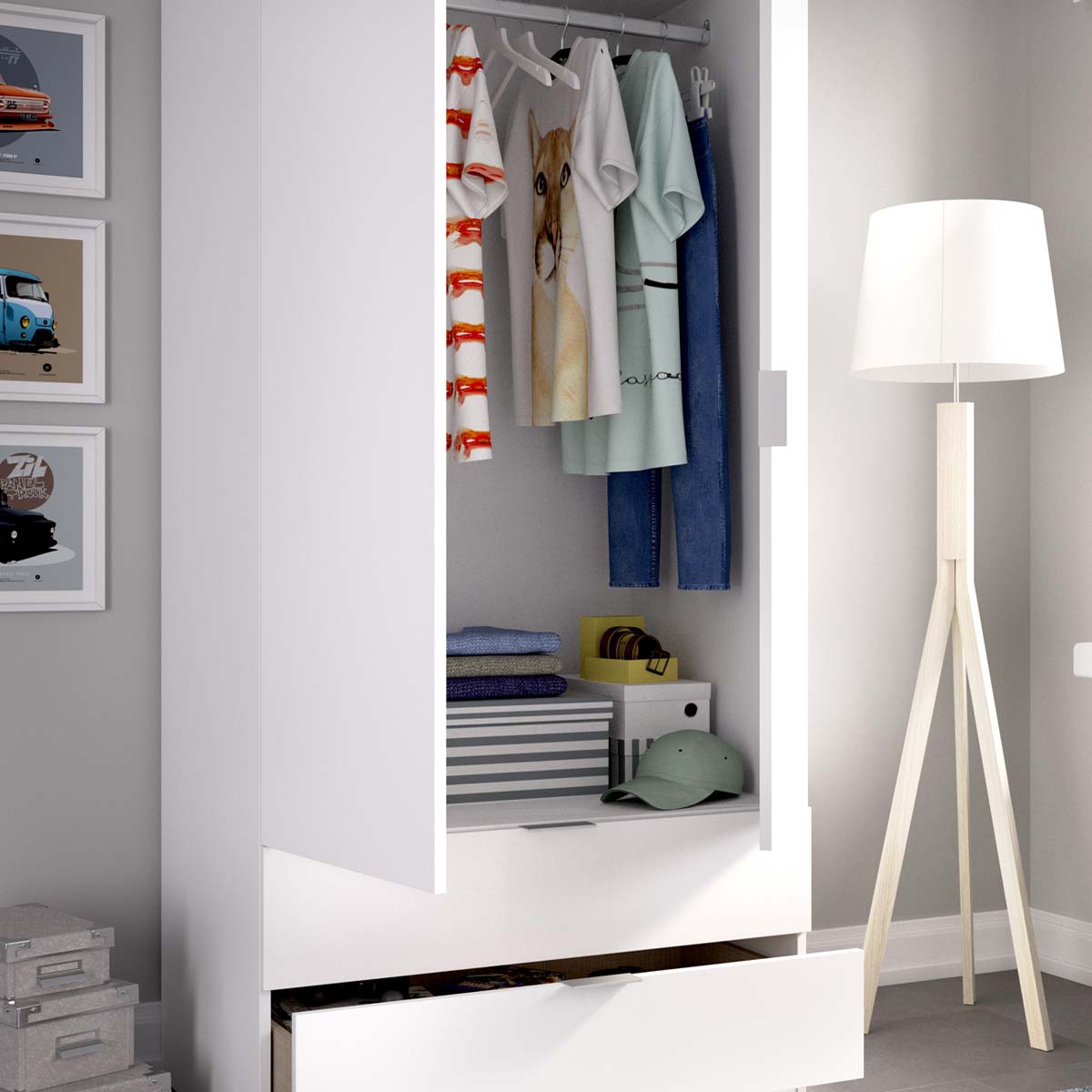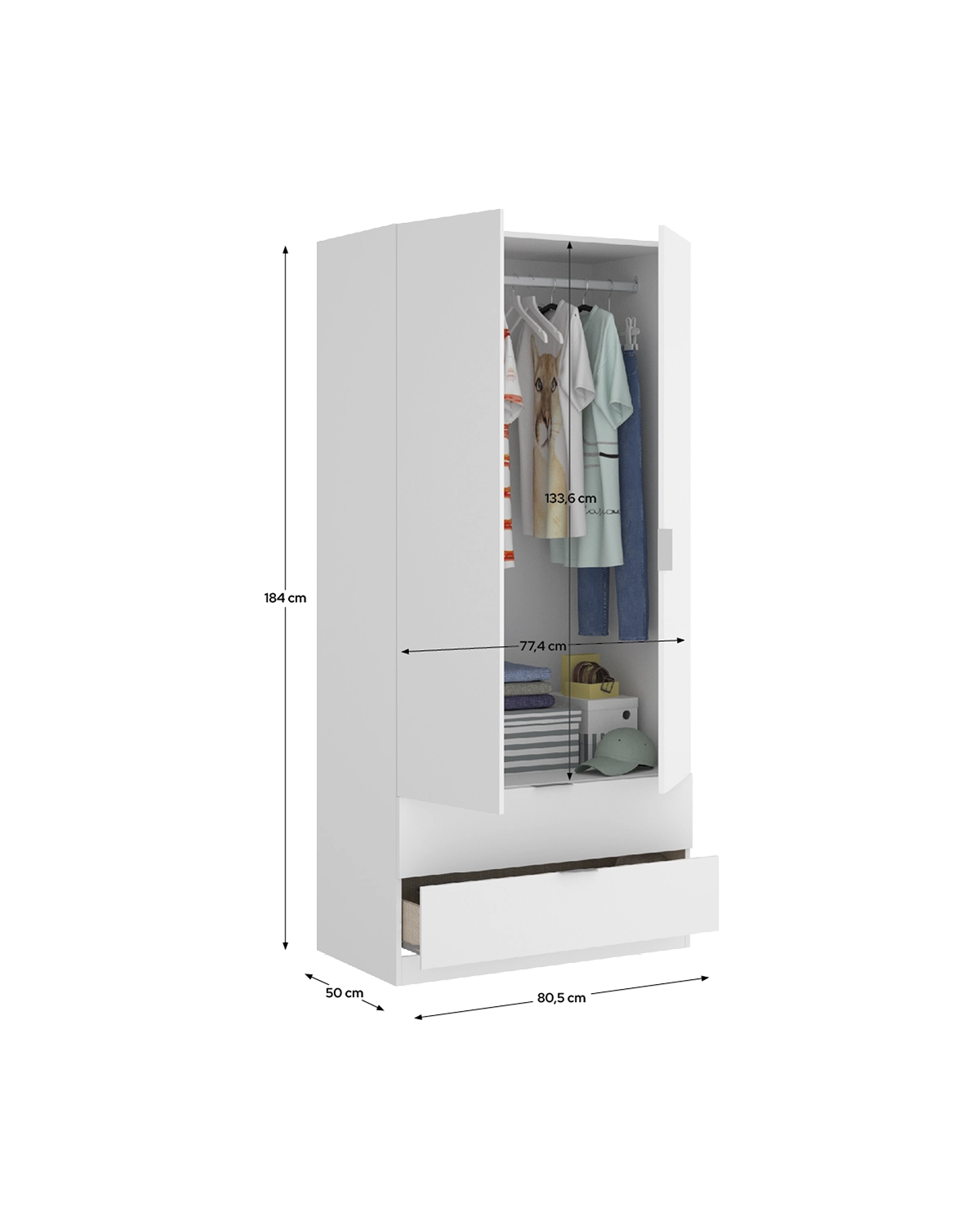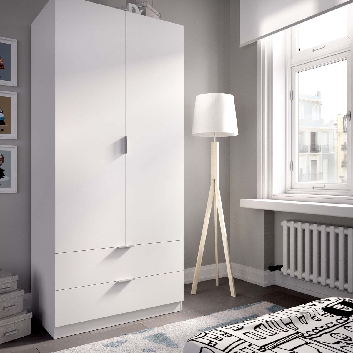 - El armario Essen blanco de dos puertas batientes y dos cajones ofrece una combinación equilibrada de capacidad y diseño contemporáneo. Su acabado blanco potencia la luminosidad y aporta sensación de amplitud, mientras que las dos puertas abatibles permiten acceder cómodamente al interior. En su distribución se integran una barra de colgar de aluminio y estantes interiores, junto con dos cajones inferiores con acabado textil y guías metálicas de suave deslizamiento, ideales para mantener el orden diario. Fabricado en tablero melaminizado de alta calidad, este armario garantiza resistencia y un mantenimiento sencillo. Las bisagras metálicas y los tiradores de aluminio aportan estabilidad y elegancia, mientras que los tacos protectores antirrayaduras cuidan el suelo y aseguran la durabilidad del conjunto. Su estructura robusta está pensada para soportar el uso constante sin perder funcionalidad. Essen blanco se adapta con facilidad a ambientes modernos o minimalistas, aportando un toque limpio y ordenado. Es un mueble funcional, elegante y versátil, ideal para dormitorios que buscan un equilibrio entre estética y practicidad, con un diseño que se mantiene actual a lo largo del tiempo.