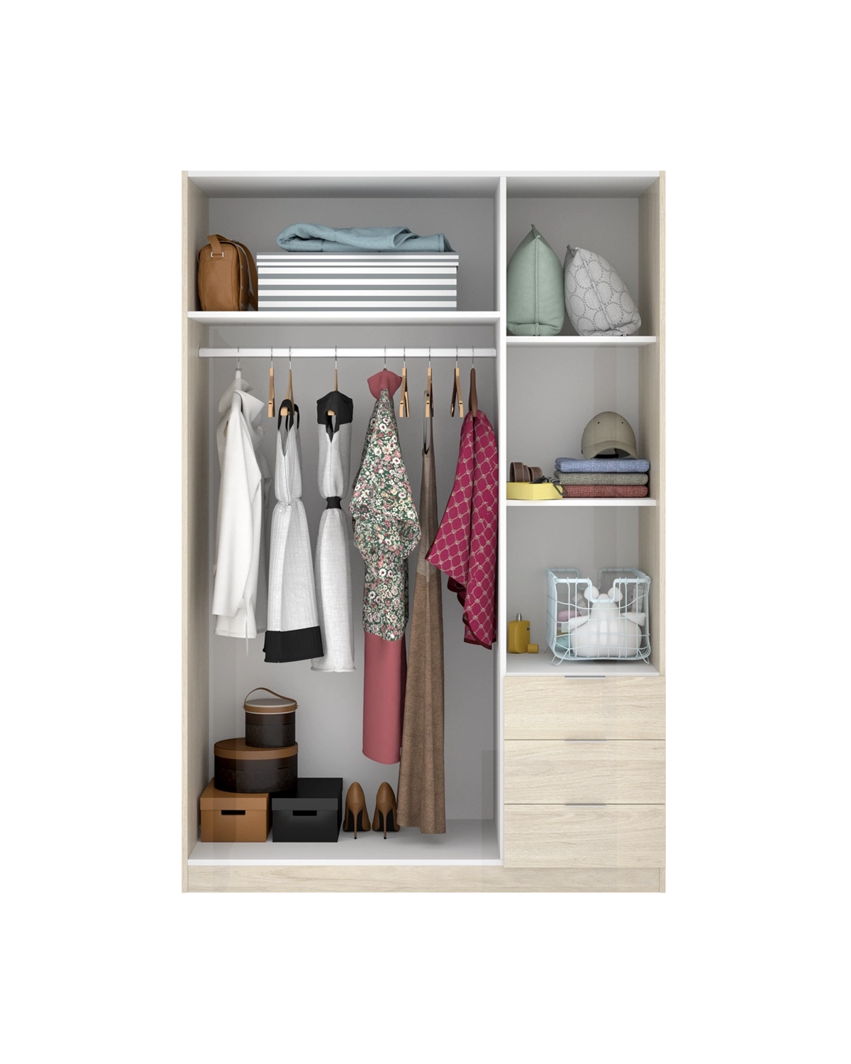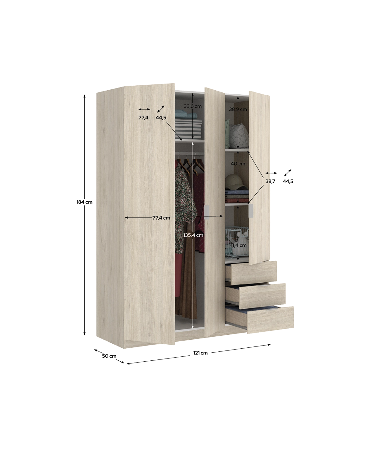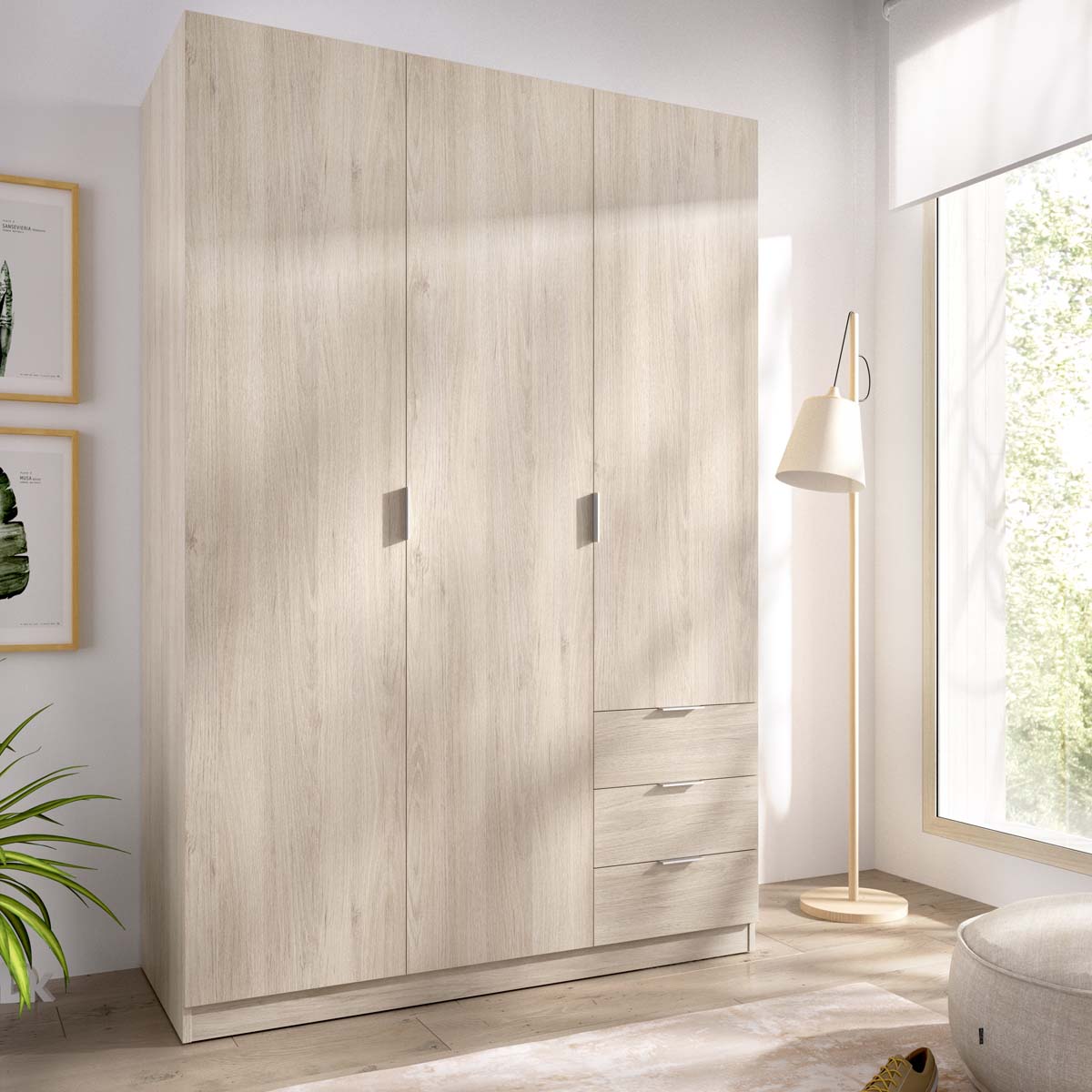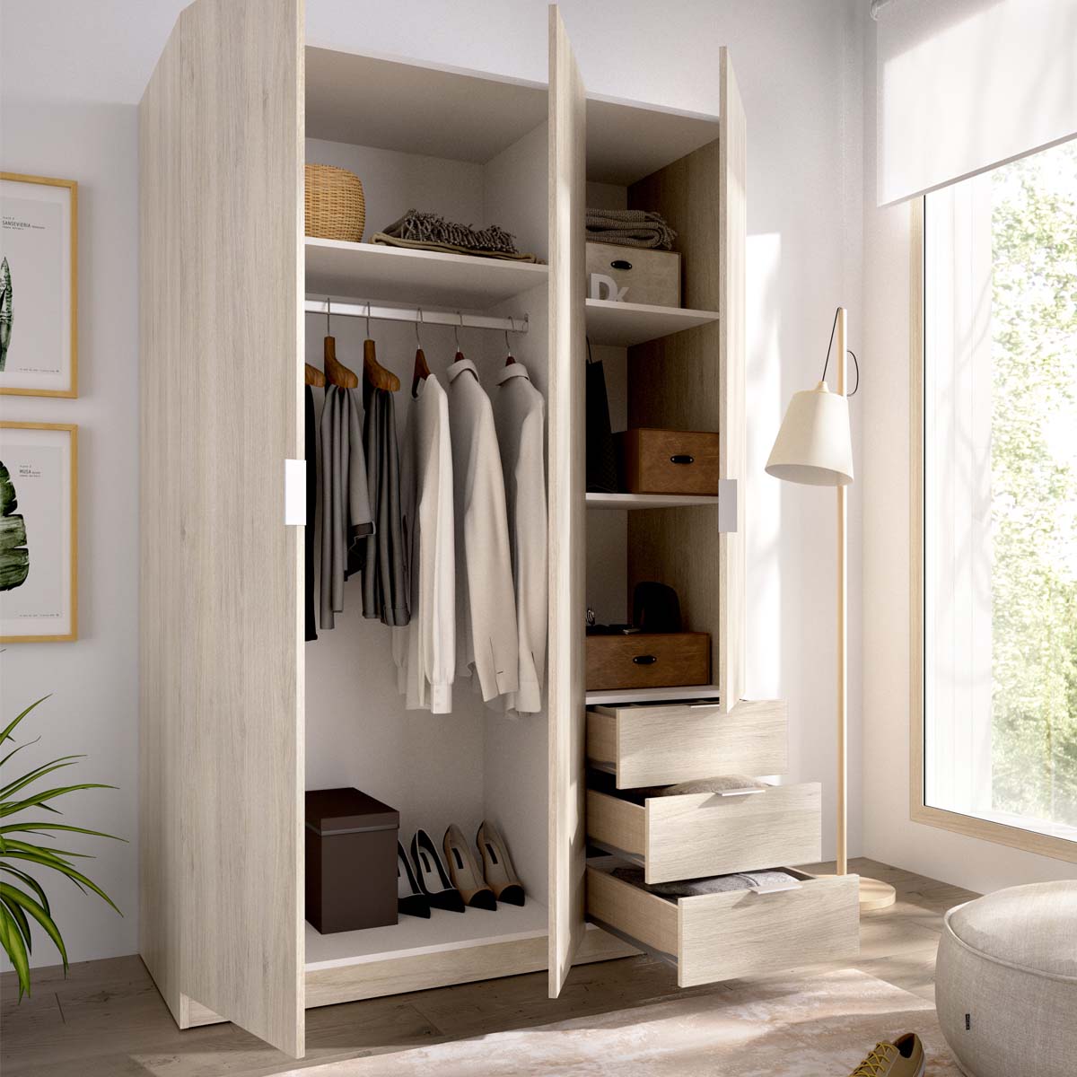 - El armario Essen en acabado madera natural de tres puertas batientes y tres cajones aporta calidez y funcionalidad al dormitorio. Su diseño equilibrado ofrece una distribución interior completa con barra metálica para colgar prendas, estantes amplios y cajones inferiores con acabado textil y guías metálicas que aseguran un deslizamiento suave. Su estética natural combina con facilidad con tonos neutros, aportando serenidad y confort visual. Elaborado en tablero melaminizado de alta resistencia, este armario garantiza durabilidad y un mantenimiento sencillo. Las bisagras metálicas y los tiradores de aluminio refuerzan su estructura y aportan un acabado moderno, mientras que los tacos antirrayaduras protegen las superficies. Es un mueble sólido, estable y diseñado para el uso cotidiano. Essen madera natural es una pieza versátil que encaja en ambientes modernos, nórdicos o tradicionales. Su equilibrio entre funcionalidad y diseño lo convierte en una opción ideal para quienes buscan un armario práctico, resistente y con un estilo cálido y natural que no pasa de moda.
