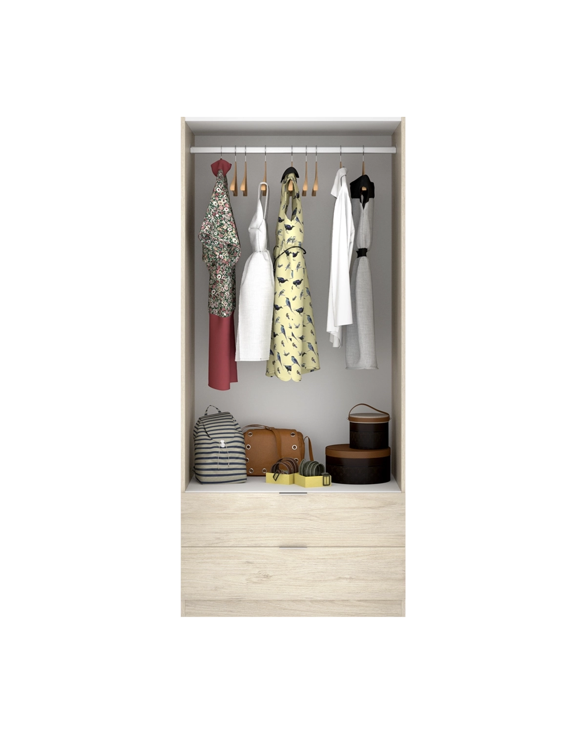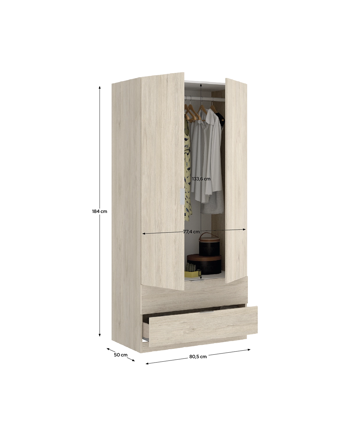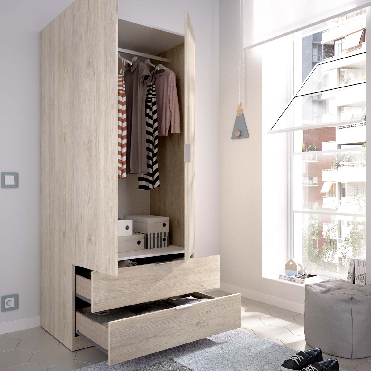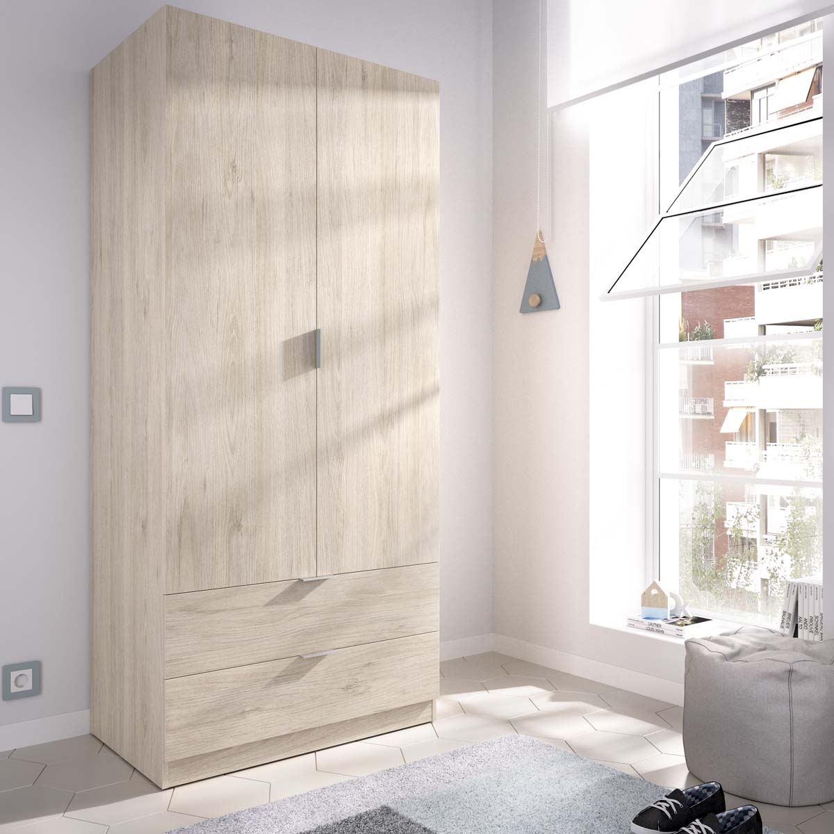 - El armario Essen en acabado madera natural de dos puertas batientes y dos cajones combina capacidad y calidez en un diseño pensado para optimizar el orden. Su tono natural aporta un toque acogedor al dormitorio, mientras que las dos puertas abatibles y los cajones inferiores con acabado textil y guías metálicas garantizan una organización práctica y fluida. En su interior incluye barra de colgar y estantes amplios, perfectos para ropa, complementos o calzado. Fabricado en tablero melaminizado de gran resistencia, este armario está diseñado para durar y mantener su aspecto original con el paso del tiempo. Las bisagras y tiradores de aluminio aportan firmeza y un toque moderno, mientras que los tacos antirrayaduras protegen el suelo. Su estructura sólida y equilibrada refuerza la funcionalidad sin renunciar a la estética. Essen madera natural se integra en todo tipo de estilos decorativos, desde nórdicos hasta contemporáneos o rústicos suaves. Es una pieza versátil que combina diseño y utilidad, ideal para quienes valoran muebles de líneas naturales, resistentes y con un aire cálido y ordenado.