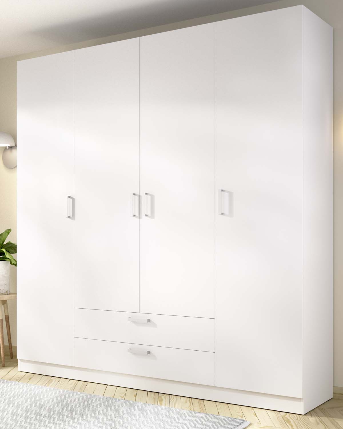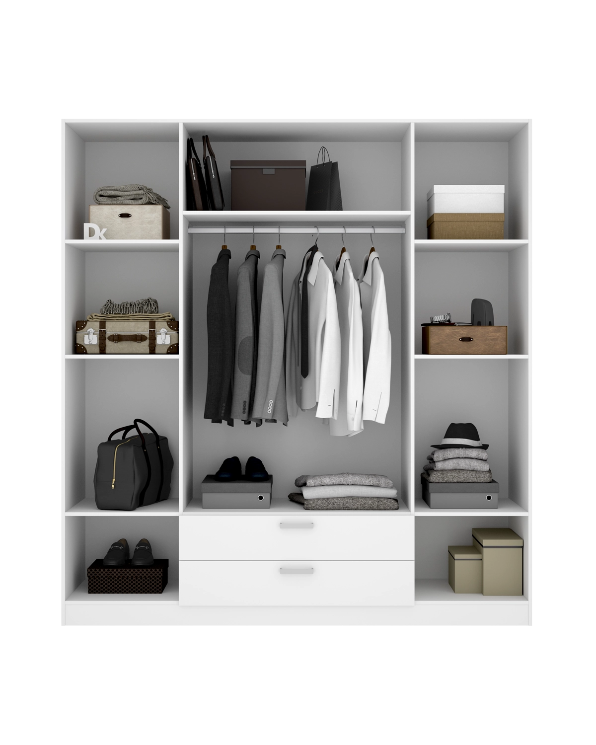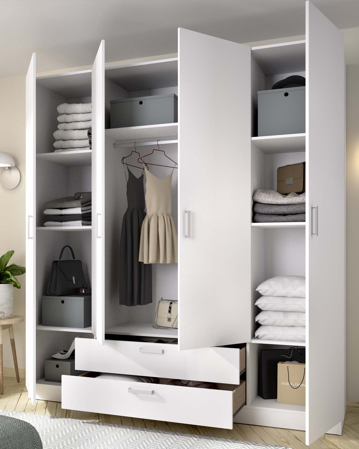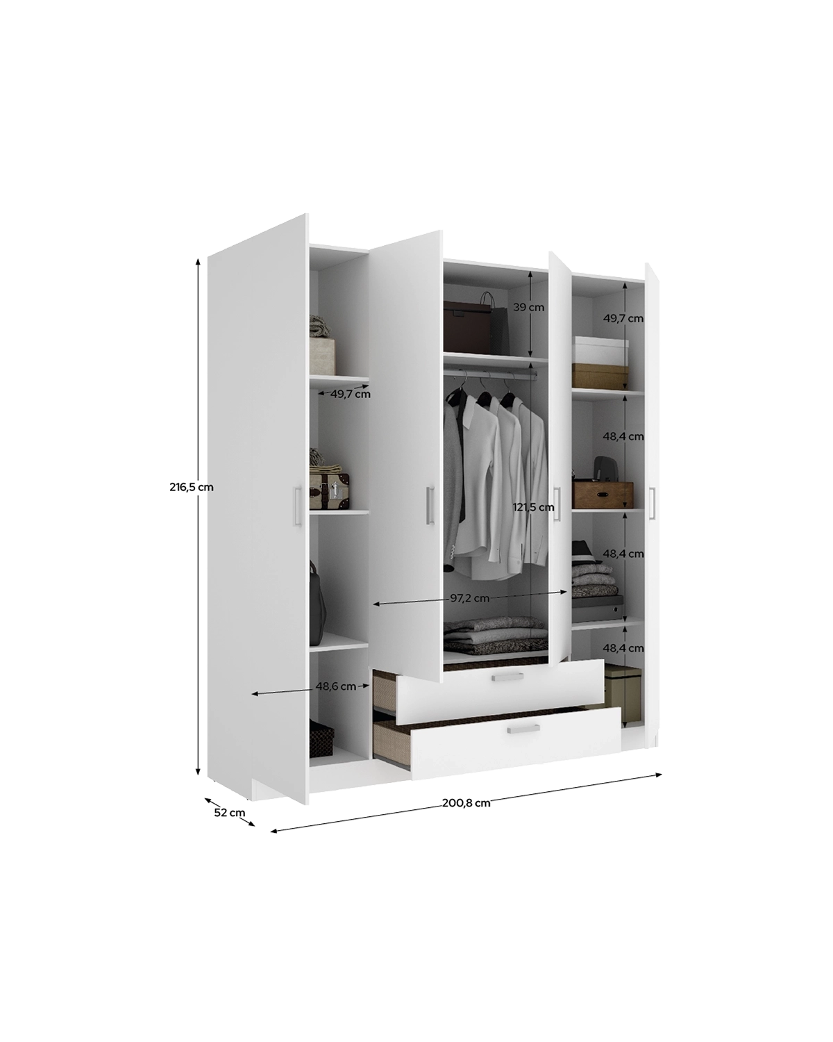 - El armario Maxi de 215 cm de altura y 200 cm de ancho es una opción ideal para dormitorios que requieren una gran capacidad de almacenaje. Su formato alto permite aprovechar el espacio vertical, ofreciendo una solución completa para mantener la ropa y los complementos perfectamente organizados. Cuenta con cuatro puertas batientes y dos cajones inferiores que facilitan una distribución práctica del interior. Los estantes regulables permiten personalizar el espacio según las necesidades, mientras que la barra de colgar de aluminio aporta funcionalidad para prendas de distinto tamaño. Fabricado en tablero de partículas melaminizado de 16 mm, con trasera de fibras de densidad media, garantiza resistencia y estabilidad en el uso diario. Su acabado en blanco aporta un estilo limpio y luminoso que se adapta con facilidad a diferentes estilos decorativos. Incluye sistema de fijación a pared para una instalación segura.