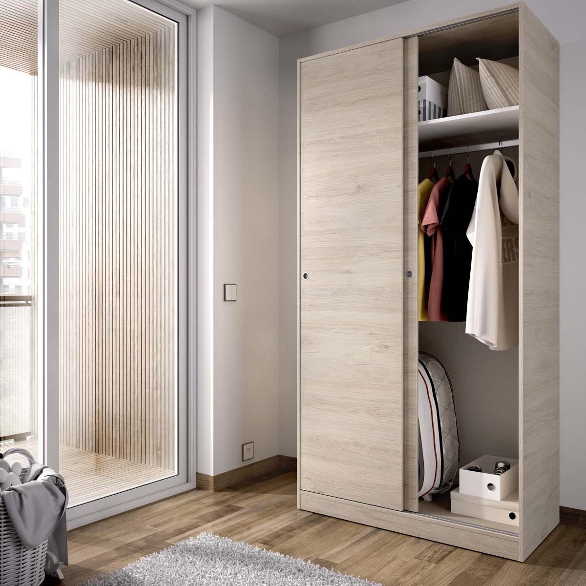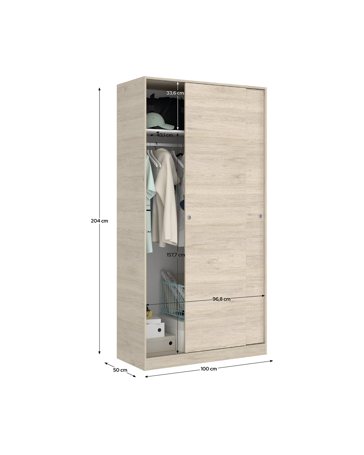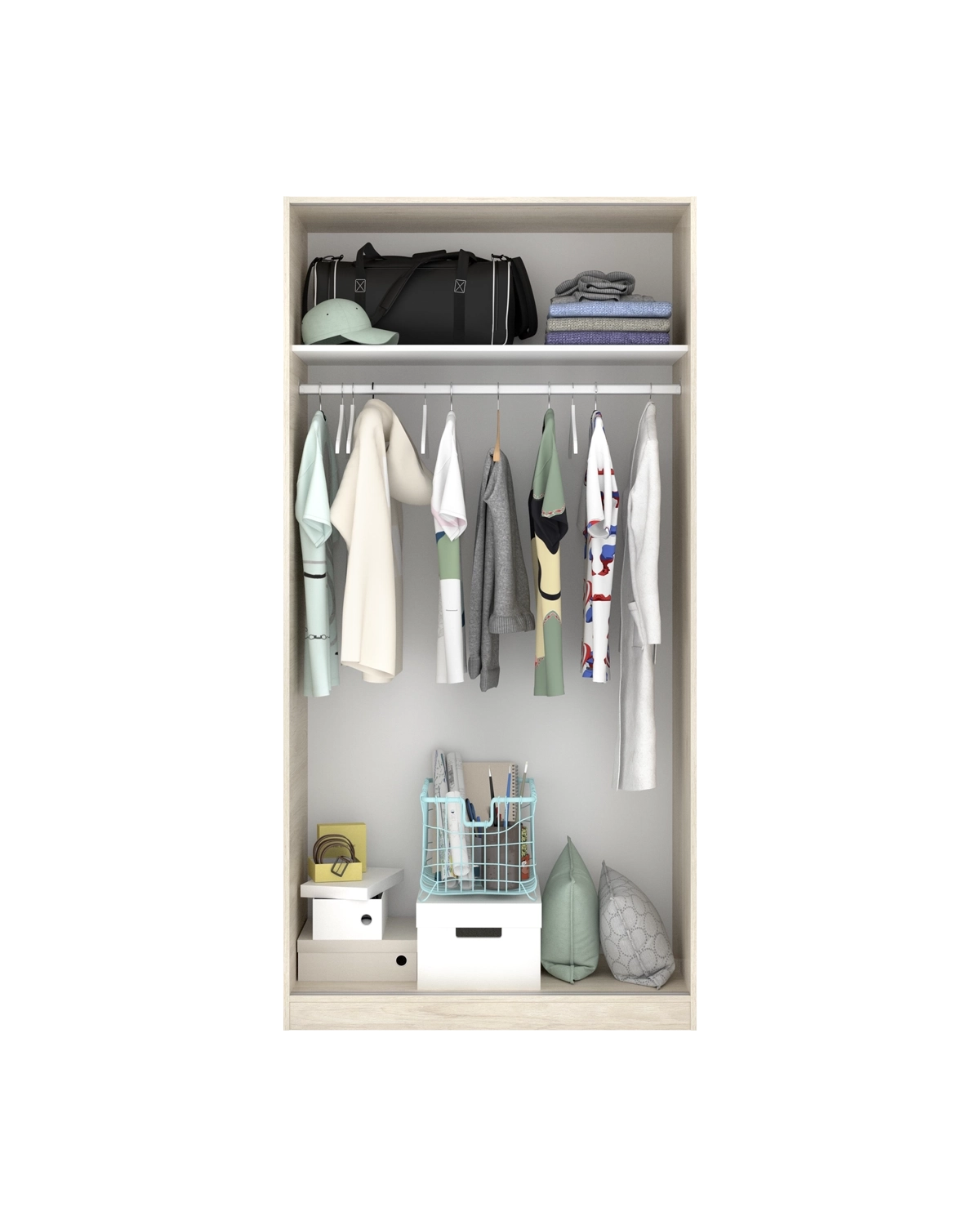 - El armario Slide en acabado madera natural combina funcionalidad y calidez en un formato moderno con puertas correderas. Su diseño sencillo permite aprovechar mejor el espacio sin comprometer el acceso ni la capacidad de almacenaje. En su interior incluye barra metálica de colgar y estantes amplios, ideales para organizar todo tipo de prendas y complementos. Fabricado en tablero melaminizado de alta resistencia, cuenta con herrajes y perfiles de aluminio que garantizan durabilidad. Los tacos protectores antirrayaduras aportan estabilidad y protegen las superficies. Slide madera natural aporta un aire acogedor y equilibrado al dormitorio, adaptándose a estilos nórdicos, modernos o naturales con la misma facilidad.