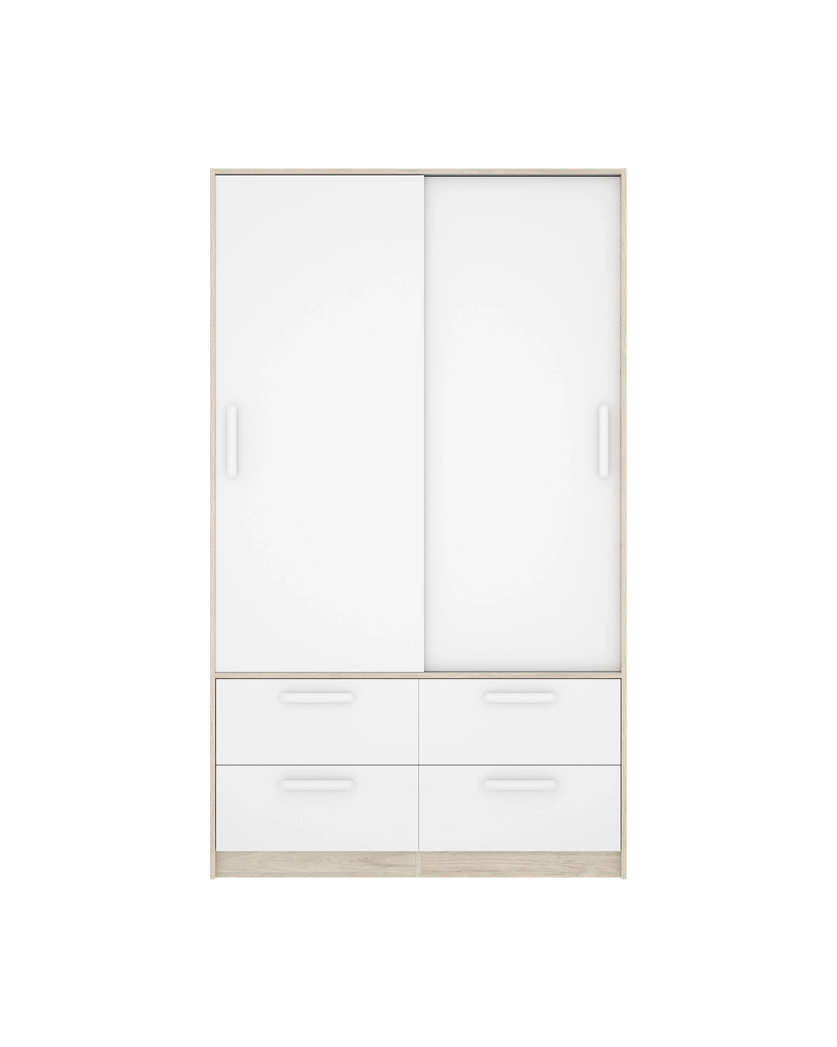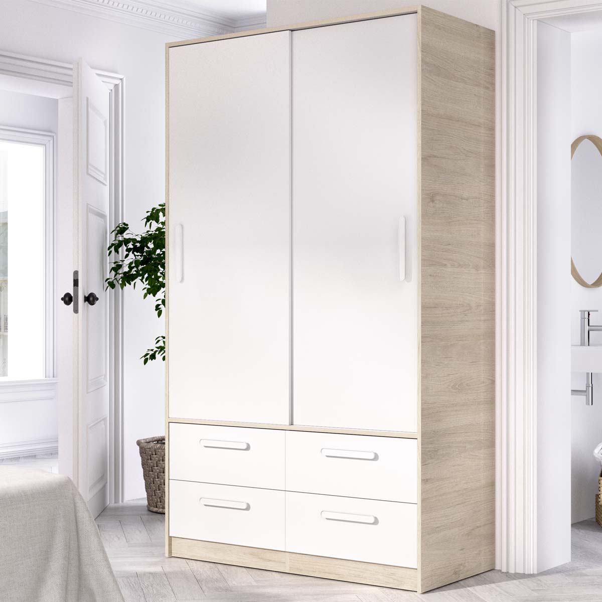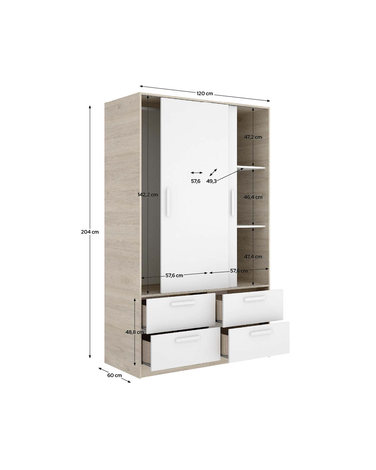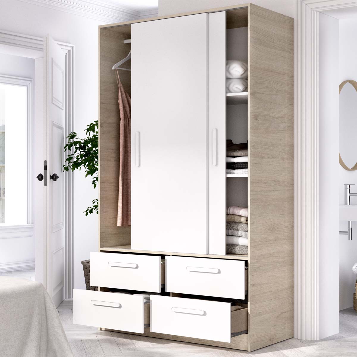 - El armario Slide en combinación blanco y madera natural equilibra luminosidad y calidez en un diseño de líneas limpias. Sus dos puertas correderas facilitan el acceso al interior sin ocupar espacio adicional, mientras que los cuatro cajones inferiores con acabado textil y guías metálicas de suave deslizamiento aportan funcionalidad y comodidad diaria. En su interior incorpora barra de colgar y estantes, ofreciendo una organización completa para prendas, calzado o complementos. Fabricado en tablero melaminizado de alta calidad, destaca por su resistencia y por los detalles de acabado en aluminio y metal que refuerzan su durabilidad. Slide bicolor combina con facilidad en ambientes modernos o nórdicos. Su mezcla de blanco y madera natural crea un ambiente cálido, elegante y equilibrado, perfecto para dormitorios que buscan orden y estilo contemporáneo.