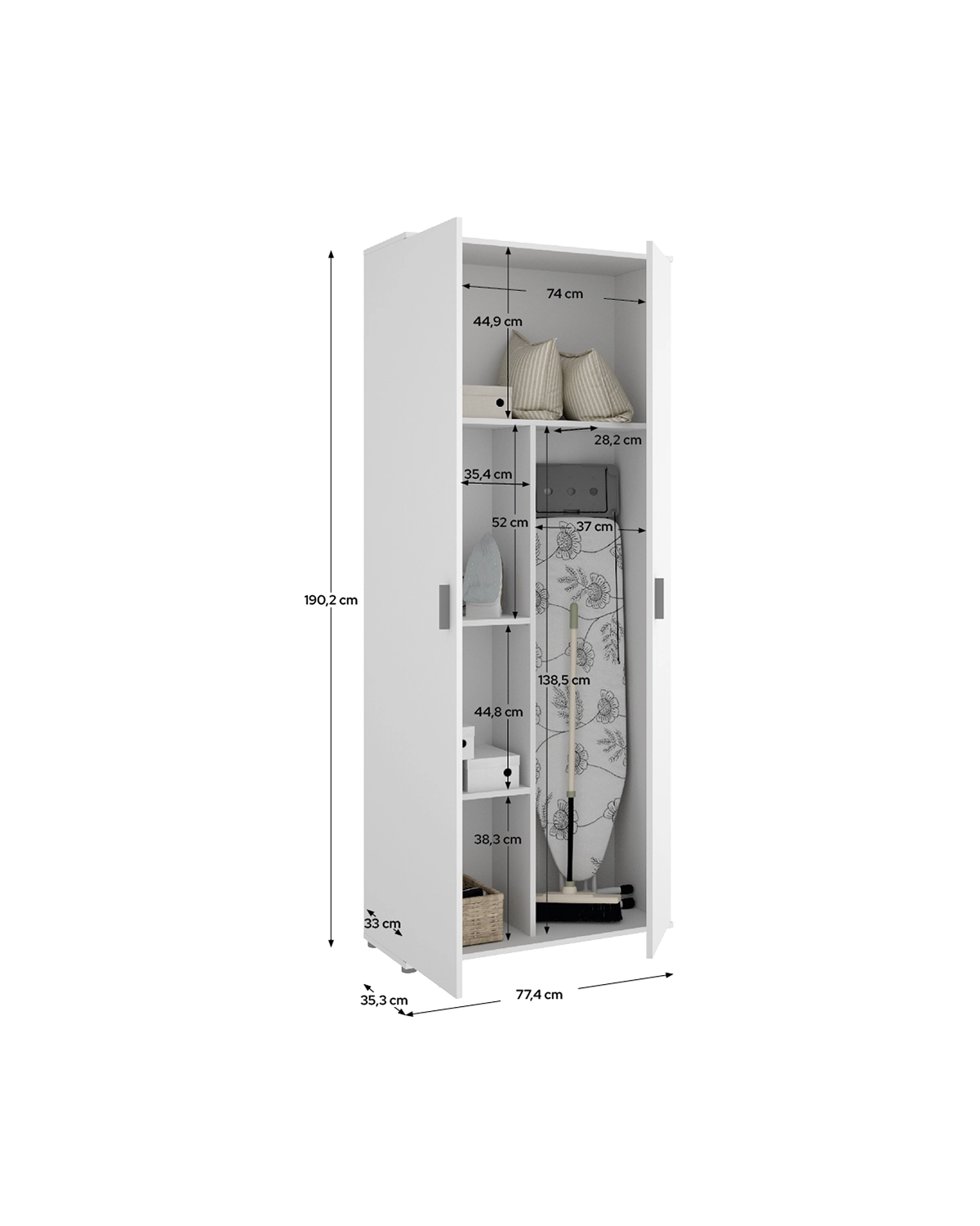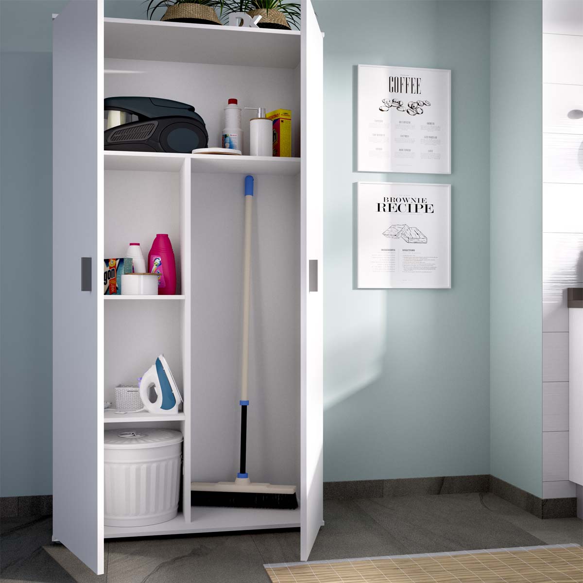 - Armario multiusos de puertas batientes ofrece una solución práctica y versátil para mantener el orden en el hogar. Armario en color blanco escobero de dos puertas batientes y tres estantes de 190x61 cm Su acabado en blanco lo convierte en un mueble fácil de integrar en diferentes estancias. Dispone de 2 puertas que ocultan un interior espacioso, la estructura está realizada en tablero de partículas melaminizado, lo que garantiza resistencia y durabilidad y los tiradores en abs acabado en alumino completan el conjunto con un detalle funcional. Un armario auxiliar pensado para adaptarse a recibidores, baños, cocinas, lavaderos o garajes, aportando siempre orden y funcionalidad sin renunciar a la estética.