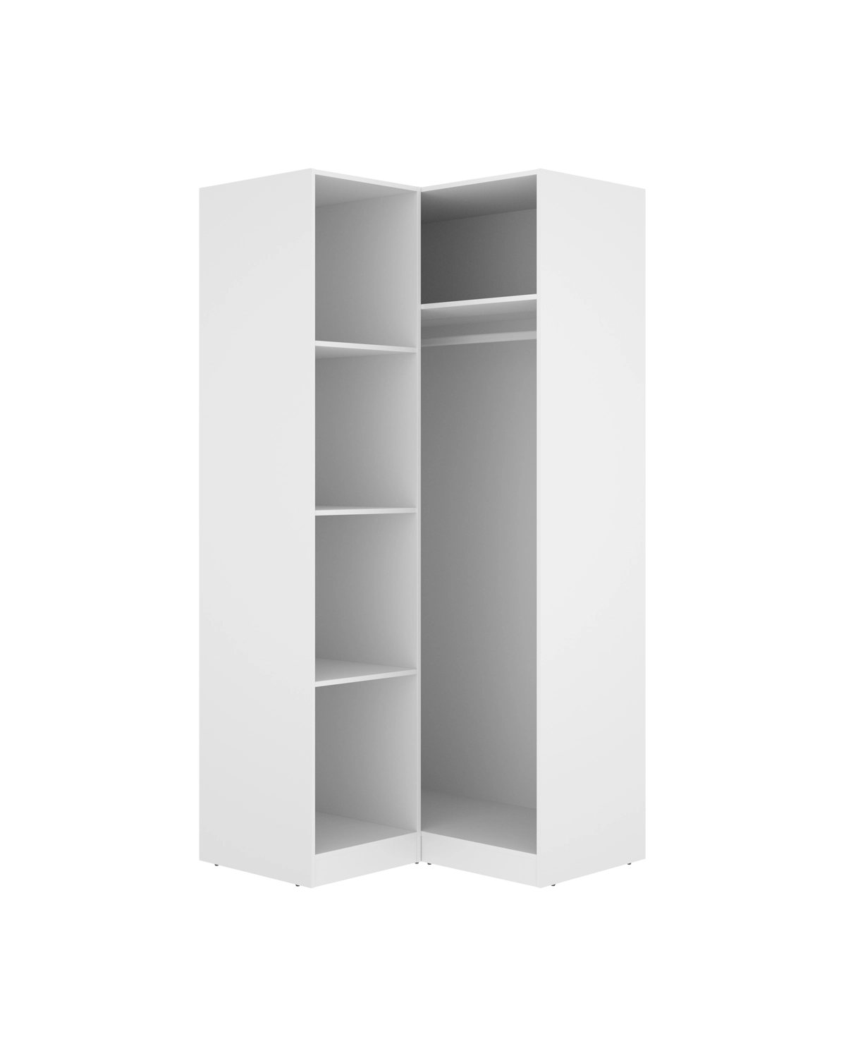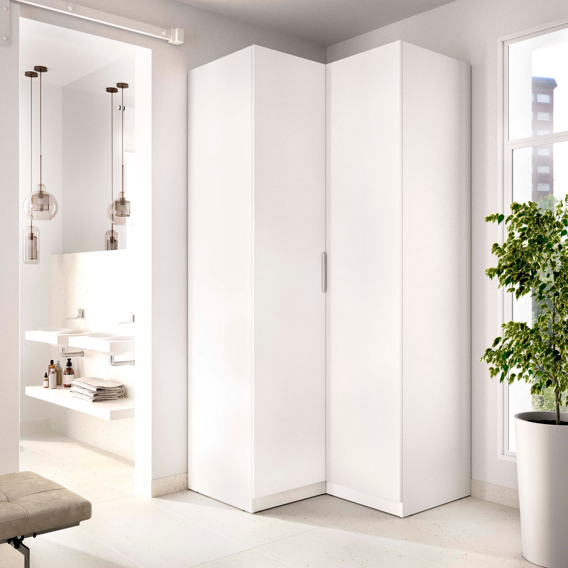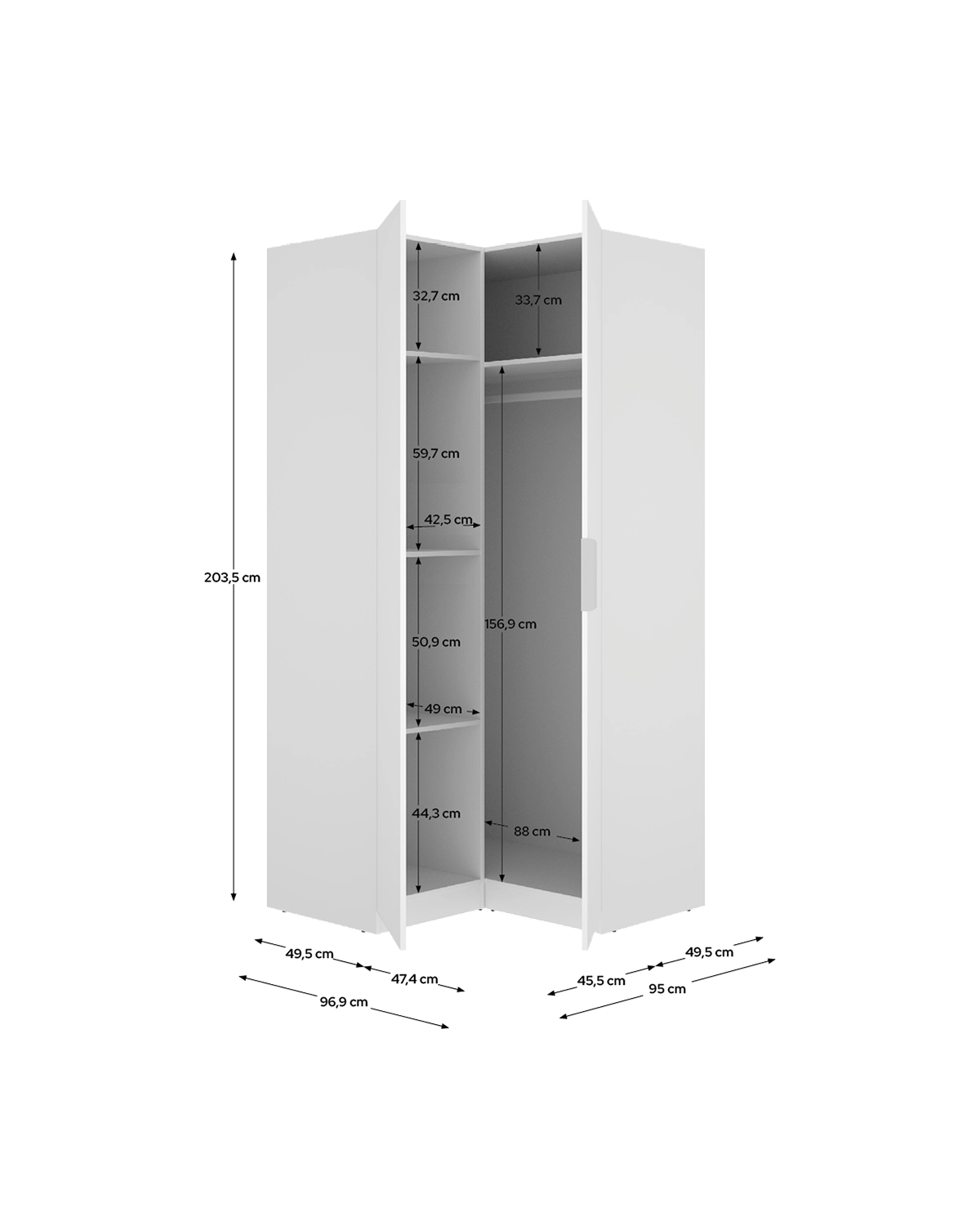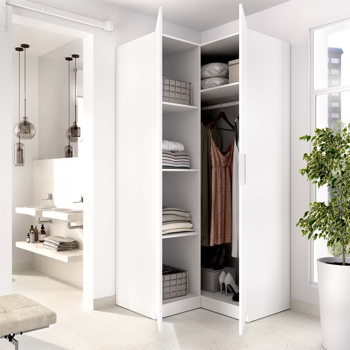 - Este armario rinconero en acabado blanco es una solución ideal para optimizar esquinas y ganar capacidad de almacenaje sin ocupar espacio adicional en la estancia. Con 203,5 cm de altura y 96,9 cm de ancho, su diseño está pensado para aprovechar al máximo zonas difíciles, integrándose con facilidad en dormitorios modernos y espacios funcionales. El interior incluye barras y estantes regulables, permitiendo configurar la distribución según el tipo de prendas o accesorios que necesites guardar. Sus dos puertas batientes facilitan el acceso y hacen que mantener el orden sea más sencillo. Gracias a su formato rinconero, es perfecto para completar una composición de armarios o para ampliar la capacidad en habitaciones pequeñas. Fabricado en tablero de partículas melaminizado con trasera en fibras de densidad media, destaca por su solidez. Los tiradores y la barra de colgar son de aluminio y los herrajes metálicos garantizan un uso prolongado. Cuenta con dispositivo de fijación a pared para mayor seguridad e incluye tacos ABS protectores. El mantenimiento diario solo requiere un paño humedecido y un secado inmediato.
