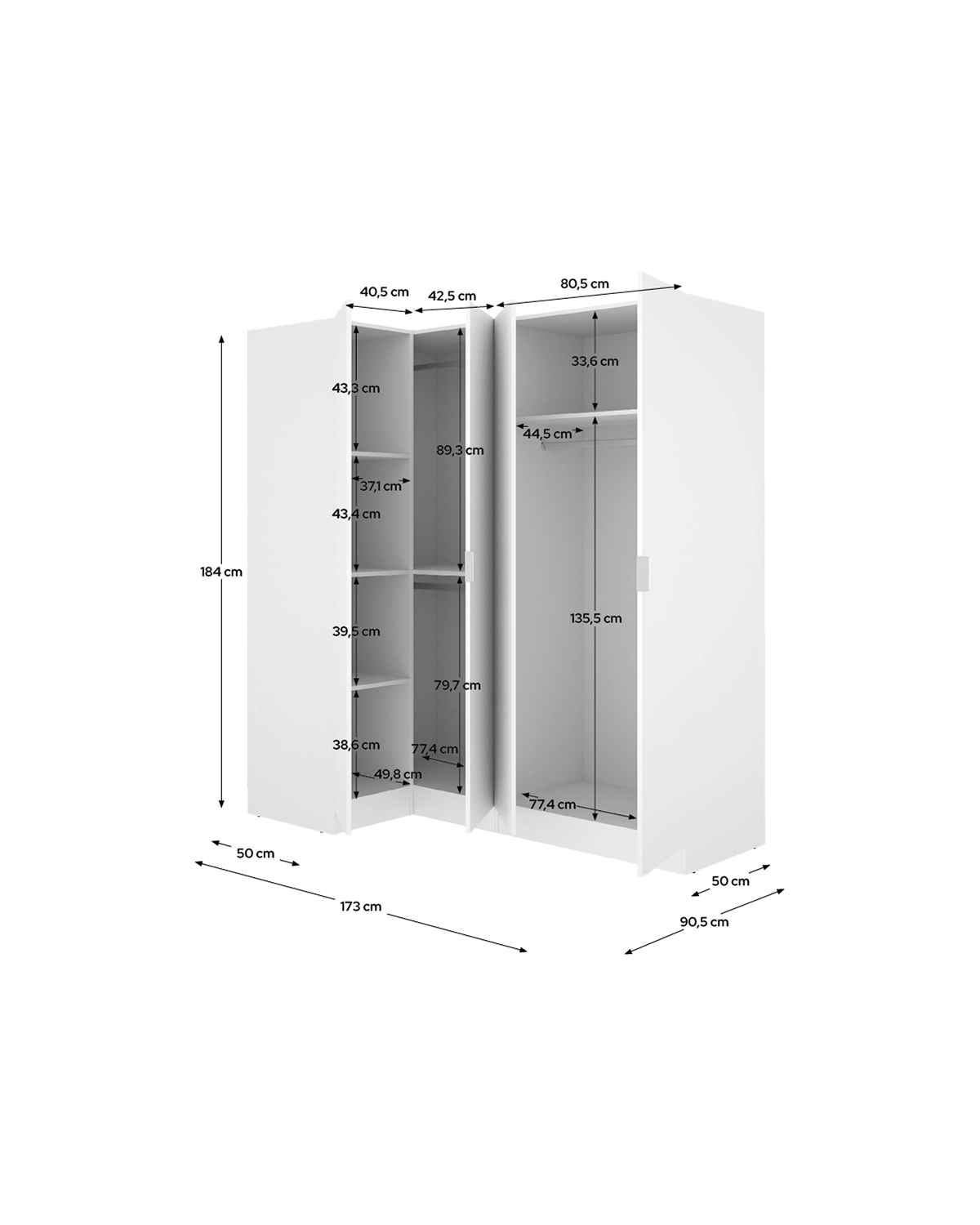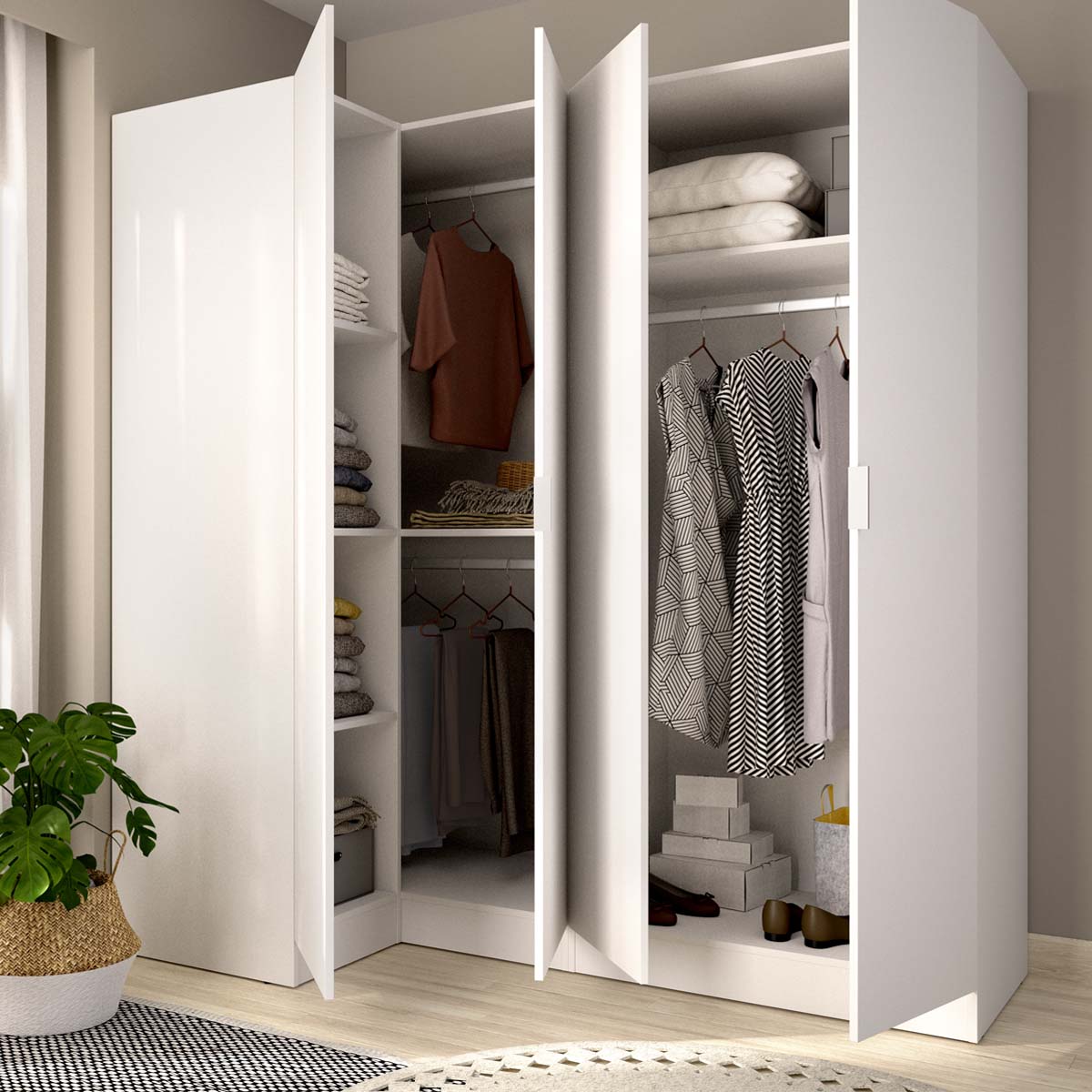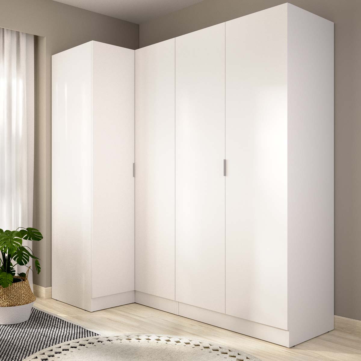 - El armario rinconero Essen blanco de cuatro puertas batientes está diseñado para aprovechar al máximo los espacios de esquina, ofreciendo una capacidad excepcional sin perder elegancia. Su estructura en forma angular permite optimizar el almacenamiento en dormitorios amplios, creando una distribución interior funcional y accesible. Dispone de barra metálica para colgar prendas y estantes regulables, que facilitan mantener todo ordenado con comodidad. Su acabado blanco aporta luminosidad y una sensación de amplitud que se integra fácilmente en cualquier estilo decorativo. Fabricado en tablero melaminizado de alta calidad, con bisagras y guías metálicas, garantiza resistencia y un uso duradero. Los tacos protectores antirrayaduras aseguran la estabilidad del mueble y protegen el suelo, manteniendo la estética impecable con el paso del tiempo. Essen blanco rinconero de cuatro puertas combina diseño, capacidad y funcionalidad. Es la opción ideal para quienes buscan una pieza amplia, versátil y elegante que transforme los rincones en espacios útiles, aportando orden y equilibrio visual al dormitorio.