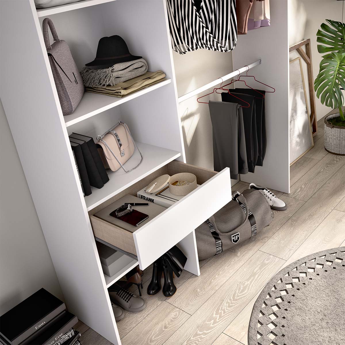 - El armario vestidor con columna Suit ofrece una solución práctica y equilibrada para quienes buscan mantener el orden sin renunciar al diseño. En acabado blanco, su aspecto luminoso se integra con facilidad en todo tipo de ambientes. Su estructura de ancho regulable mediante el corte de las barras permite adaptarlo a diferentes espacios, garantizando una instalación flexible. Incluye tacos ABS quitarruidos y antirrayaduras para las patas, y cajones con acabado textil y guías metálicas de suave deslizamiento, que aportan durabilidad y un funcionamiento fluido. En su interior, presenta cuatro huecos amplios, un cajón y dos barras metálicas, combinando espacio para prendas dobladas y colgadas con un diseño abierto que favorece la accesibilidad. Fabricado en tablero de partículas melaminizado y trasera de fibra de densidad media, asegura una estructura sólida y resistente al uso diario. Su montaje reversible amplía las posibilidades de colocación, adaptándose con facilidad a la disposición del dormitorio o vestidor. El modelo Suit destaca por su estilo funcional y su capacidad de integración. Gracias a su diseño limpio y contemporáneo, puede colocarse como pieza independiente o formar parte de un conjunto de vestidor. Su equilibrio entre estética y practicidad lo convierte en una opción perfecta para crear un ambiente ordenado, cómodo y visualmente armónico.