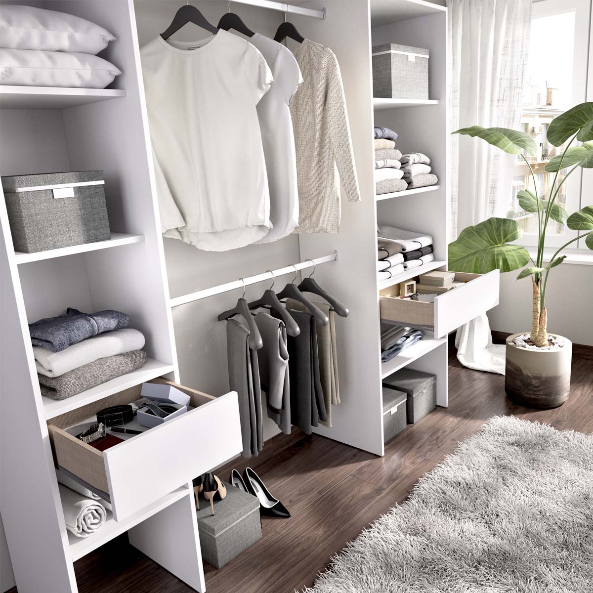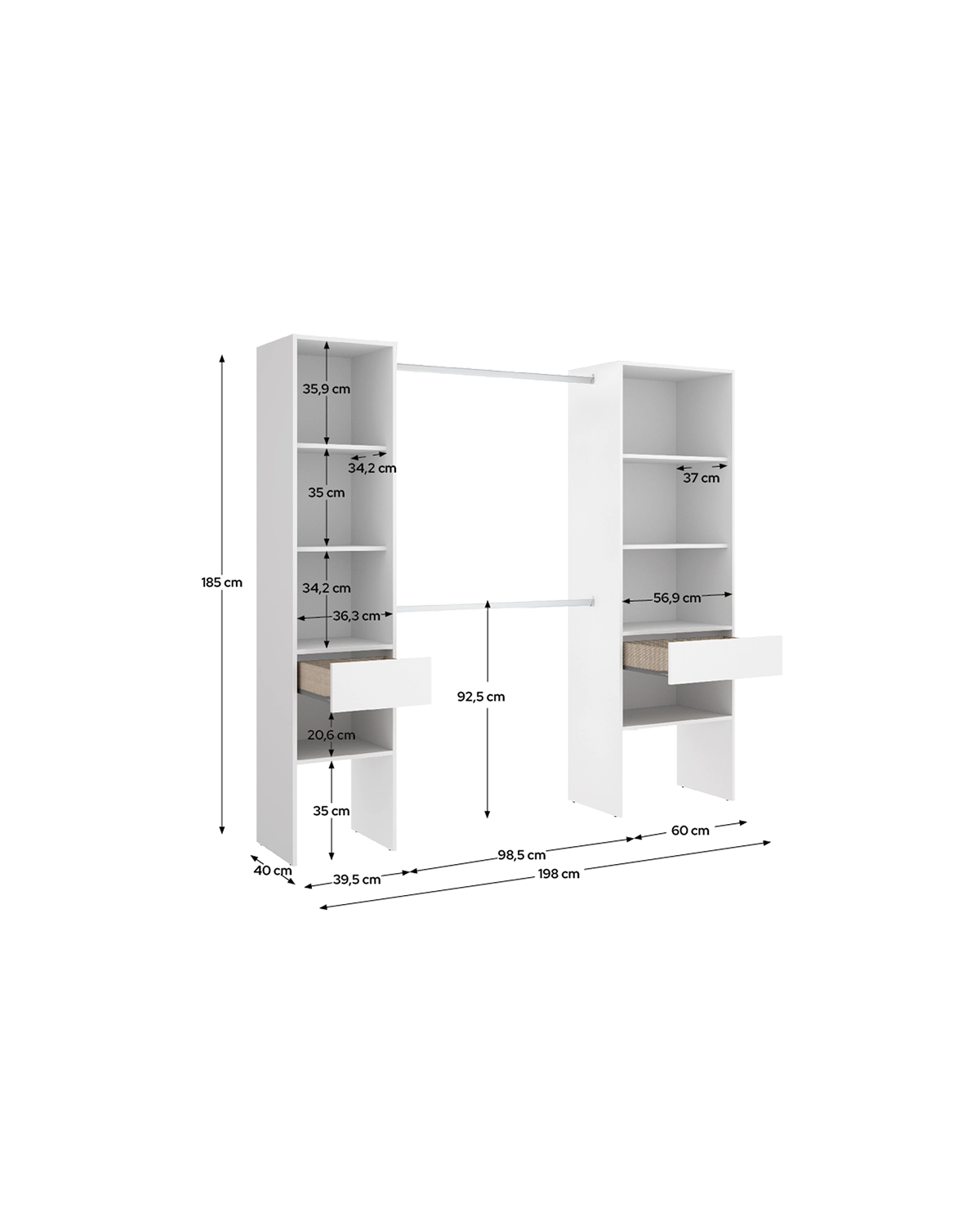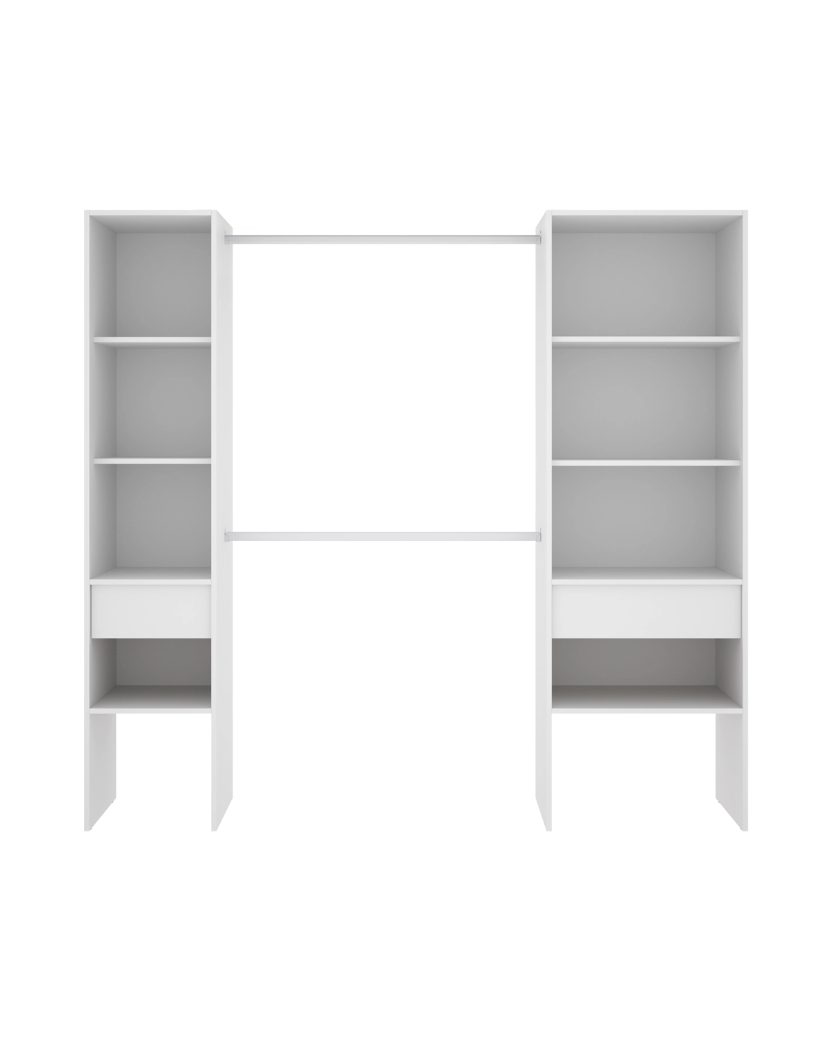 - El armario vestidor con dos columnas Suit ofrece una estructura completa y simétrica, ideal para quienes buscan un espacio de almacenaje amplio y equilibrado. En acabado blanco, su diseño transmite orden y luminosidad, adaptándose a dormitorios contemporáneos o vestidores abiertos. Incluye tacos ABS quitarruidos y antirrayaduras, así como cajones con acabado textil y guías metálicas de suave deslizamiento, que aportan funcionalidad y confort en el uso diario. Cuenta con ocho huecos amplios, dos cajones y dos barras metálicas para colgar prendas, configurando un interior práctico y accesible. El conjunto está fabricado en tablero melaminizado de 16 mm con trasera en fibra de densidad media, materiales que garantizan solidez y una larga vida útil. Su montaje reversible facilita la instalación, adaptándose a distintas configuraciones del espacio. Como parte de la línea Suit, este armario vestidor permite crear composiciones personalizadas o combinarse con otros modelos de la colección para formar vestidores completos. Su diseño lineal, abierto y regulable hace que encaje en cualquier estancia donde se busque un equilibrio entre capacidad, orden y diseño atemporal.