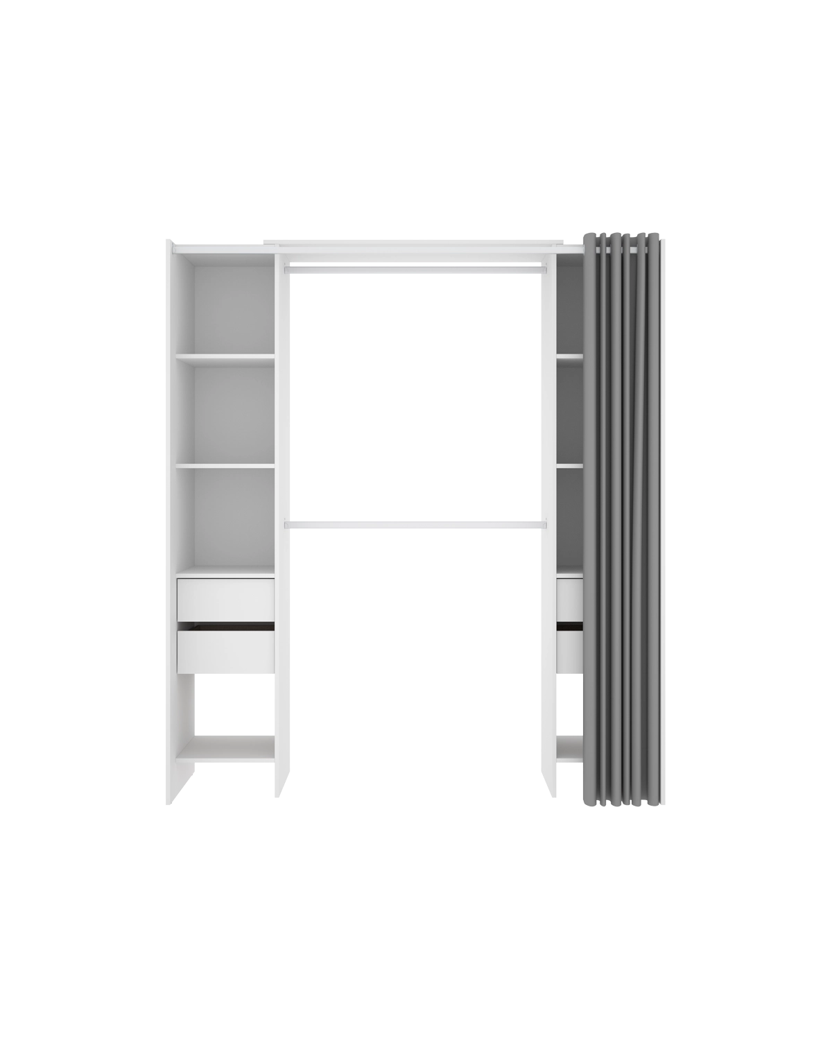 - El armario vestidor con dos columnas y cortina Suit, en color blanco, combina funcionalidad y elegancia en un diseño versátil pensado para optimizar el espacio. Su estructura de ancho regulable mediante el corte de las barras metálicas permite adaptarlo con precisión a distintos huecos, mientras que la cortina de poliéster sustituye las puertas tradicionales, ofreciendo una apertura ligera y un aspecto limpio. Incluye tacos ABS quitarruidos y antirrayaduras para las patas, y cajones con acabado textil y guías metálicas de suave deslizamiento, que aportan comodidad y durabilidad al uso diario. El interior está organizado en ocho huecos, cuatro cajones y dos barras metálicas, proporcionando un espacio de almacenaje equilibrado entre prendas colgadas y dobladas. Fabricado en tablero de partículas melaminizado con trasera de fibra de densidad media, ofrece resistencia y estabilidad, mientras su acabado blanco refuerza la luminosidad del entorno. Integrado en la colección Suit, este modelo permite crear composiciones personalizadas combinando diferentes módulos. Su diseño abierto con cortina mantiene la sensación de orden sin perder ligereza visual, convirtiéndolo en una opción perfecta para dormitorios modernos o vestidores elegantes.