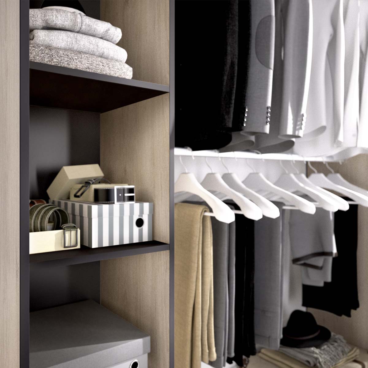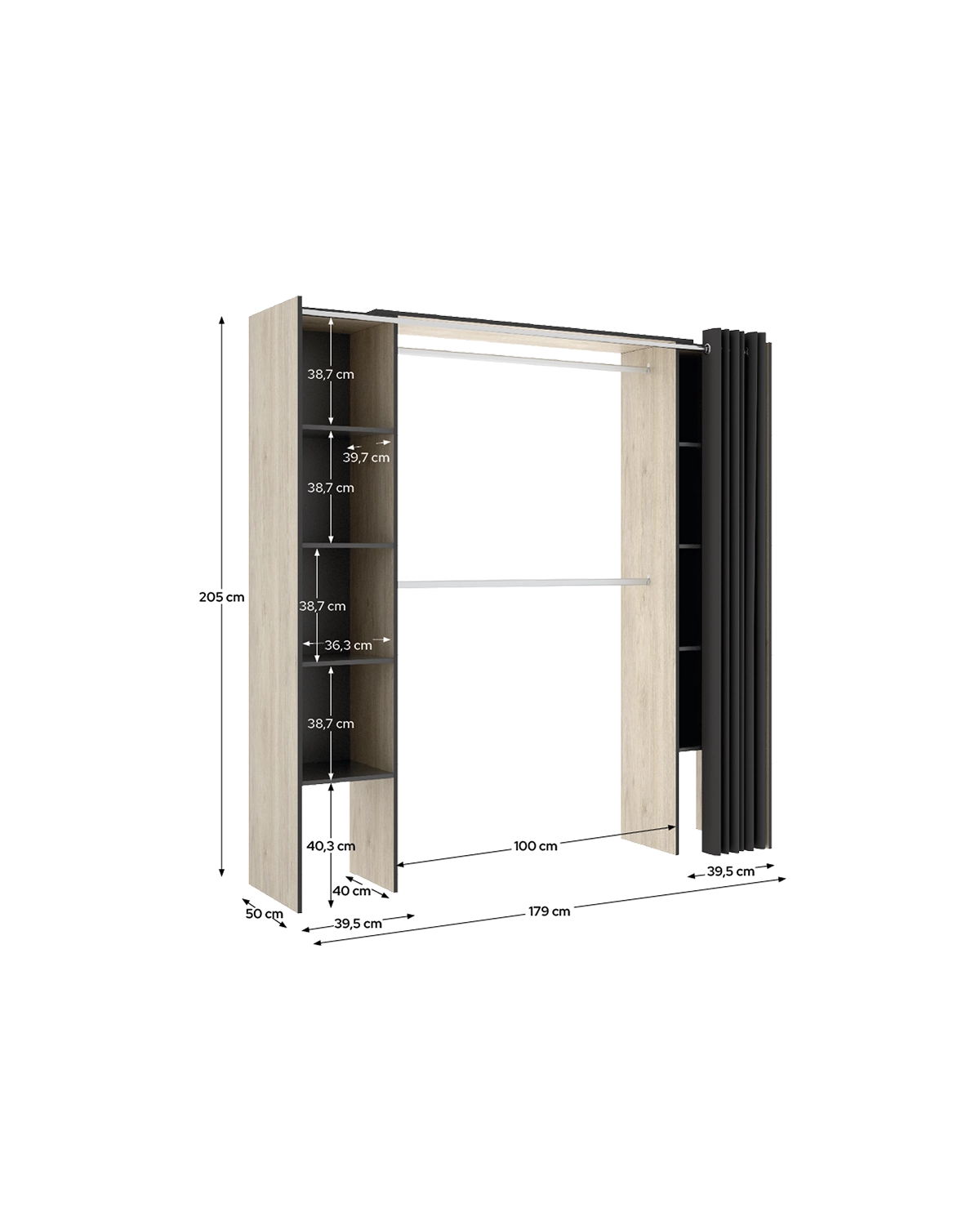 - El armario vestidor con dos columnas y cortina Suit destaca por su acabado bicolor en madera natural y grafito, una combinación que aporta equilibrio entre calidez y sofisticación. Su diseño de ancho regulable mediante el corte de las barras metálicas facilita una instalación ajustada a cada espacio, mientras que la cortina de poliéster añade un toque decorativo funcional, ocultando el interior sin restar ligereza. Incluye tacos ABS quitarruidos y antirrayaduras para las patas, asegurando estabilidad y protección en el uso diario. En su interior, ofrece ocho huecos amplios y dos barras metálicas, proporcionando espacio suficiente para colgar prendas y almacenar complementos o ropa doblada. Fabricado en tablero melaminizado con trasera de fibra de densidad media, mantiene una estructura sólida y resistente. La combinación de tonos naturales con detalles oscuros crea una estética moderna, perfecta para interiores de estilo industrial o urbano. Como parte de la colección Suit, este vestidor puede combinarse con otros modelos y módulos para diseñar un espacio de almacenaje totalmente personalizado. Su equilibrio entre diseño, funcionalidad y carácter lo convierte en una pieza versátil, pensada para quienes valoran tanto el orden como la estética.