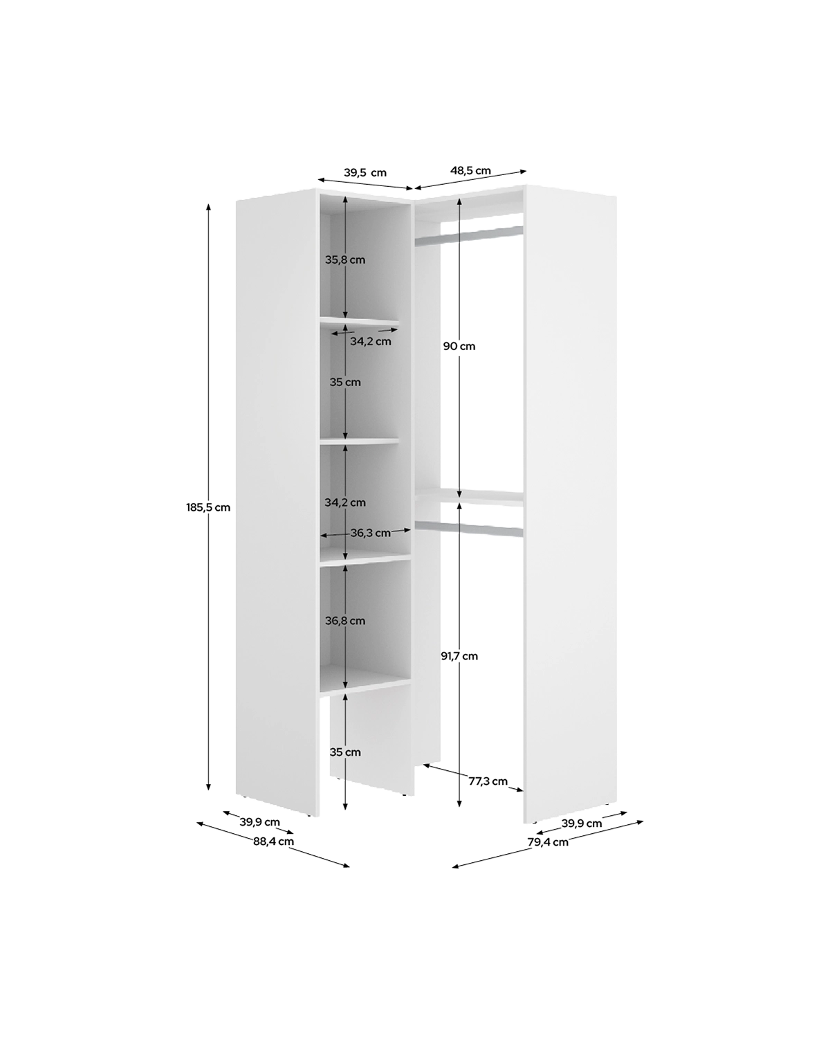 - El vestidor rinconero Suit en color blanco está pensado para transformar una esquina del dormitorio en un área de almacenaje clara y accesible. Su diseño abierto aporta ligereza visual y facilita el uso diario. Incluye tacos ABS quitarruidos y antirrayaduras para las patas, lo que mejora la estabilidad y protege el suelo durante el uso. La estructura, firme y bien proporcionada, aprovecha el ángulo sin invadir el paso, creando una transición natural con el resto del mobiliario. En el interior, la columna ofrece cuatro huecos para ropa doblada y complementos, además de dos barras de aluminio para colgar prendas. Los estantes fijos ordenan el contenido y evitan desplazamientos, mientras el sistema de fijación a pared añade seguridad. Fabricado en tablero de partículas melaminizado con trasera de fibra de densidad media y herrajes metálicos, resiste el uso continuo manteniendo una estética limpia y luminosa. Su montaje reversible facilita la adaptación a distintos giros de esquina, integrándose con naturalidad en dormitorios de estilo moderno o nórdico. La forma angular optimiza cada centímetro disponible y convierte un rincón desaprovechado en un espacio útil, silencioso y visualmente ordenado.