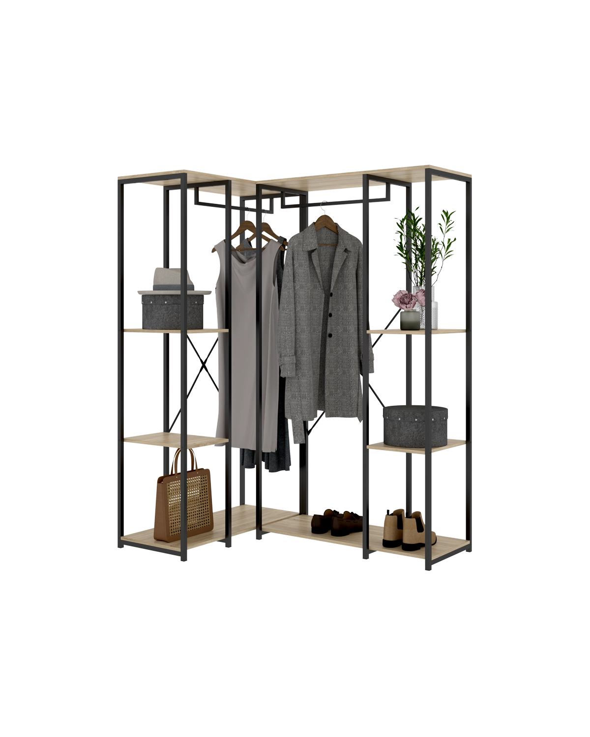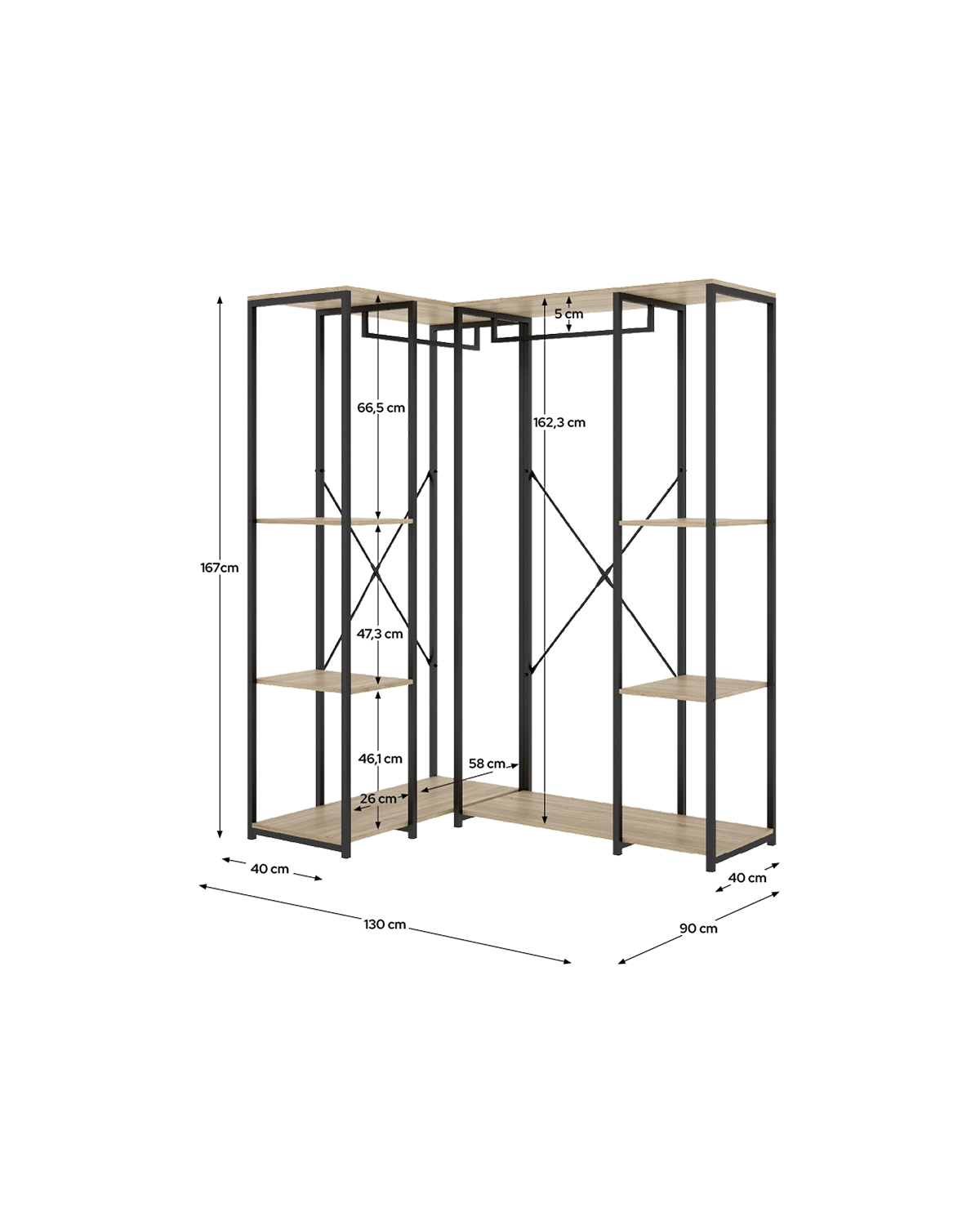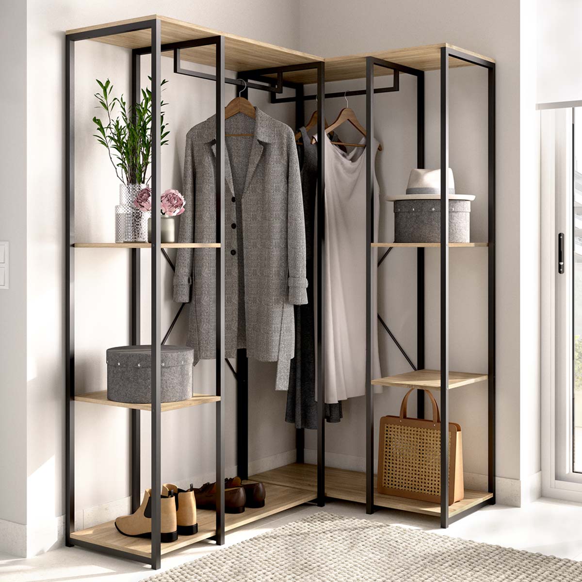 - La versión más amplia del vestidor rinconero Trok ofrece un aprovechamiento total del espacio de esquina, combinando funcionalidad y estilo en una misma pieza. El binomio negro y madera natural aporta personalidad, mientras que la estructura metálica refuerza la sensación de solidez y modernidad. Dispone de cuatro estantes espaciosos y dos barras metálicas, lo que facilita organizar las prendas por tipo o uso, manteniendo todo visible y bien ventilado. La distribución interior está pensada para maximizar la capacidad sin comprometer la accesibilidad, adaptándose con naturalidad a dormitorios amplios o vestidores modulares. El uso de tablero melaminizado de 16 mm y perfiles metálicos garantiza resistencia y durabilidad. Su diseño modular y su geometría específica lo convierten en el complemento perfecto de los modelos lineales Trok, aportando continuidad visual y aprovechamiento integral del espacio disponible.