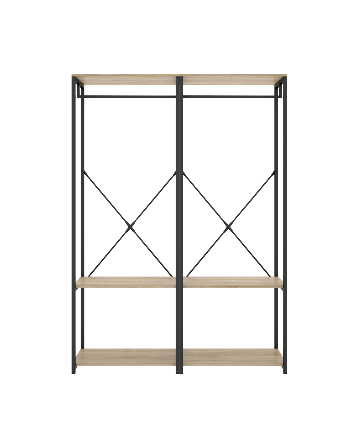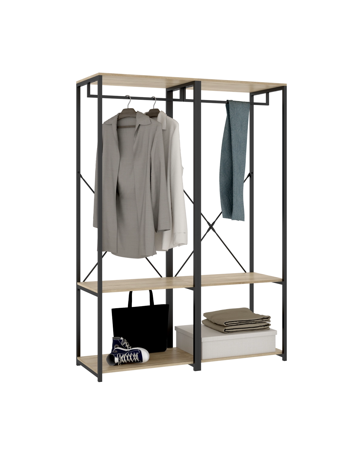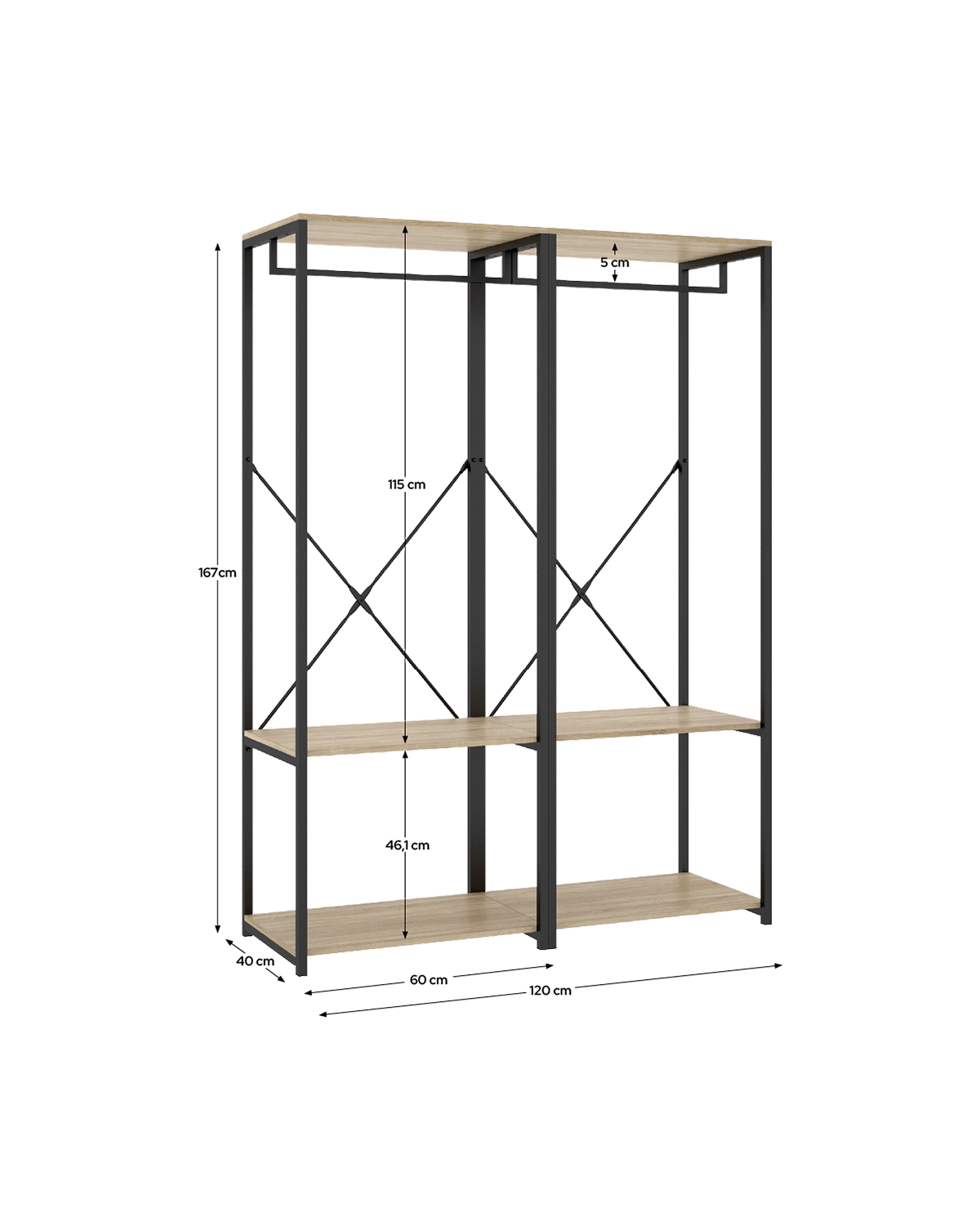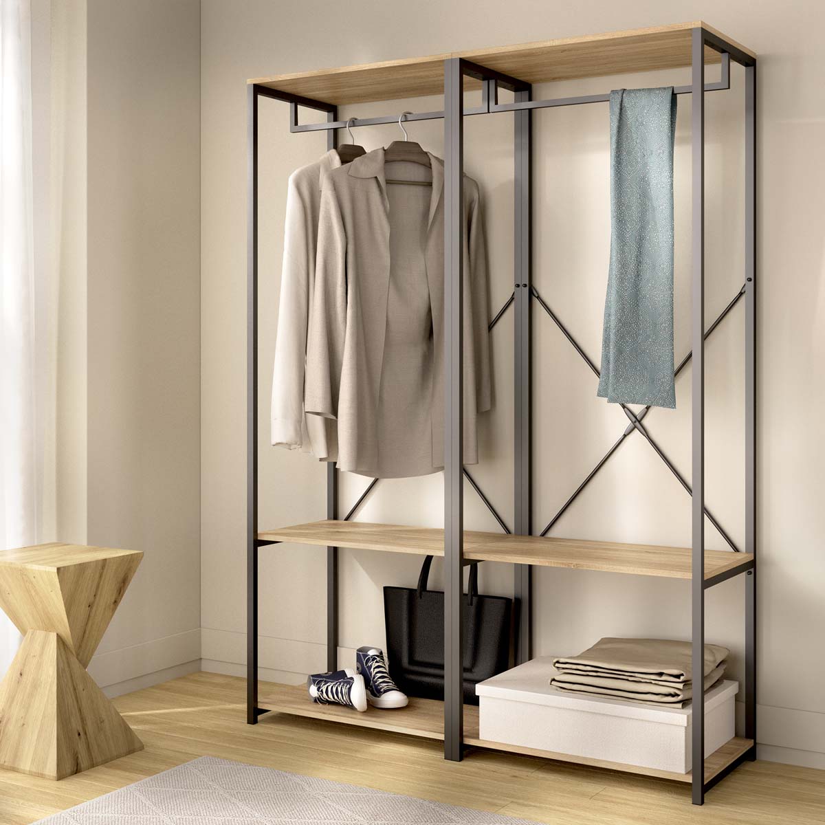 - Capacidad y ritmo visual se equilibran en un módulo panorámico con estética industrial cálida. El frente sin puertas y el contraste madera–negro generan una lectura ordenada de las prendas, útil en vestidores compartidos o dormitorios con zona abierta. La estructura vista evita acumulaciones y ayuda a mantener rotación de uso. Su interior combina dos estantes para apilar y clasificar por categorías con dos barras metálicas, muy útiles para dividir largos y cortos o separar outfits de la semana. La anchura permite integrar cajas etiquetadas y bandejas para accesorios sin perder acceso frontal. La construcción en tablero melaminizado de 16 mm y perfil metálico refuerza la estabilidad, mientras que el mantenimiento se resuelve con limpieza suave y secado. La colocación sobre base nivelada mejora el apoyo; por seguridad y dependiendo del soporte, conviene fijación a pared y reapriete periódico de herrajes.