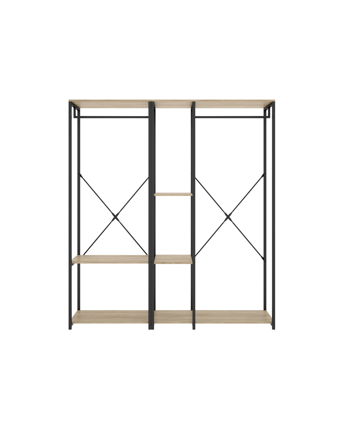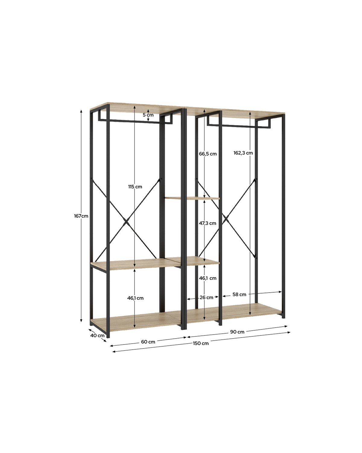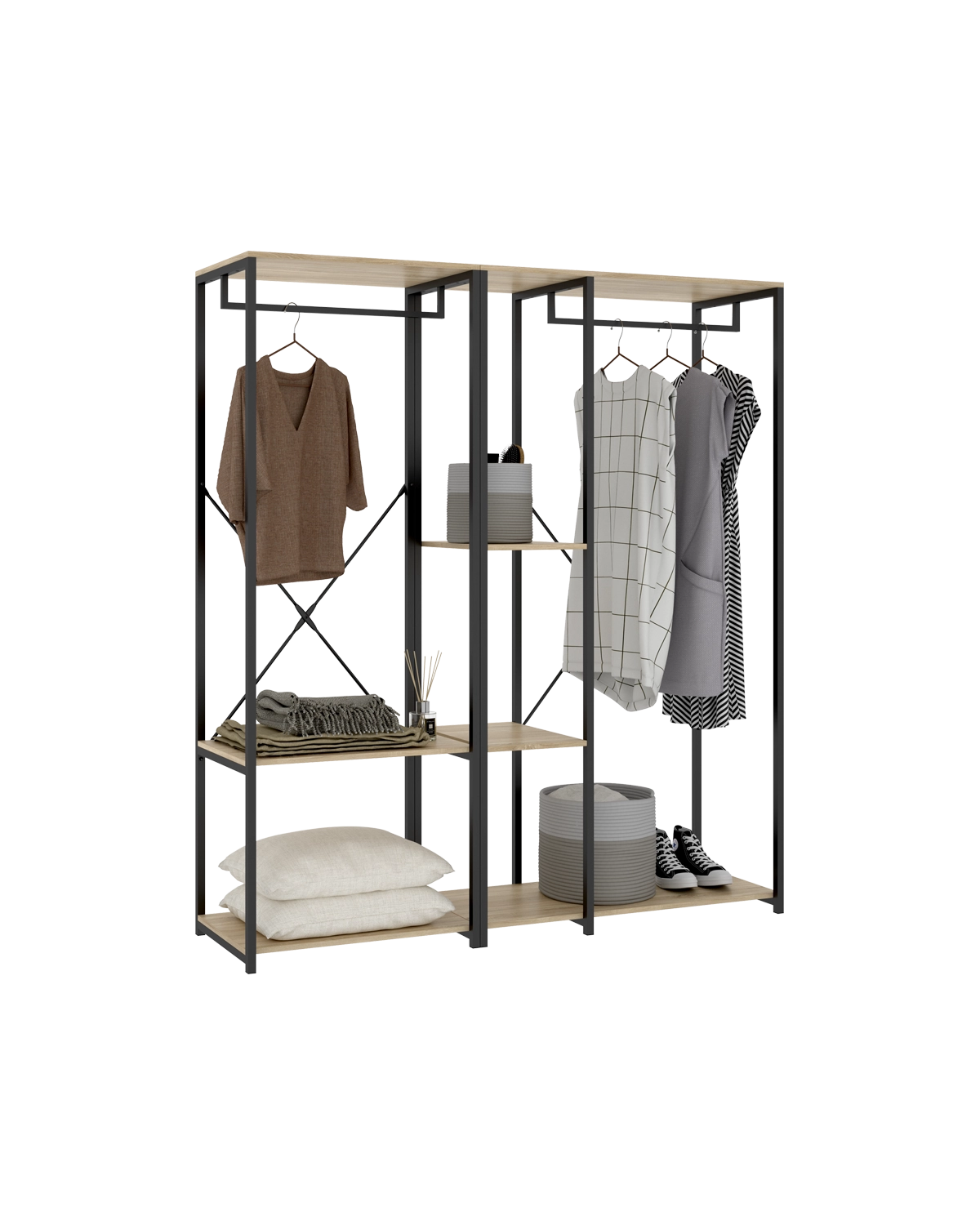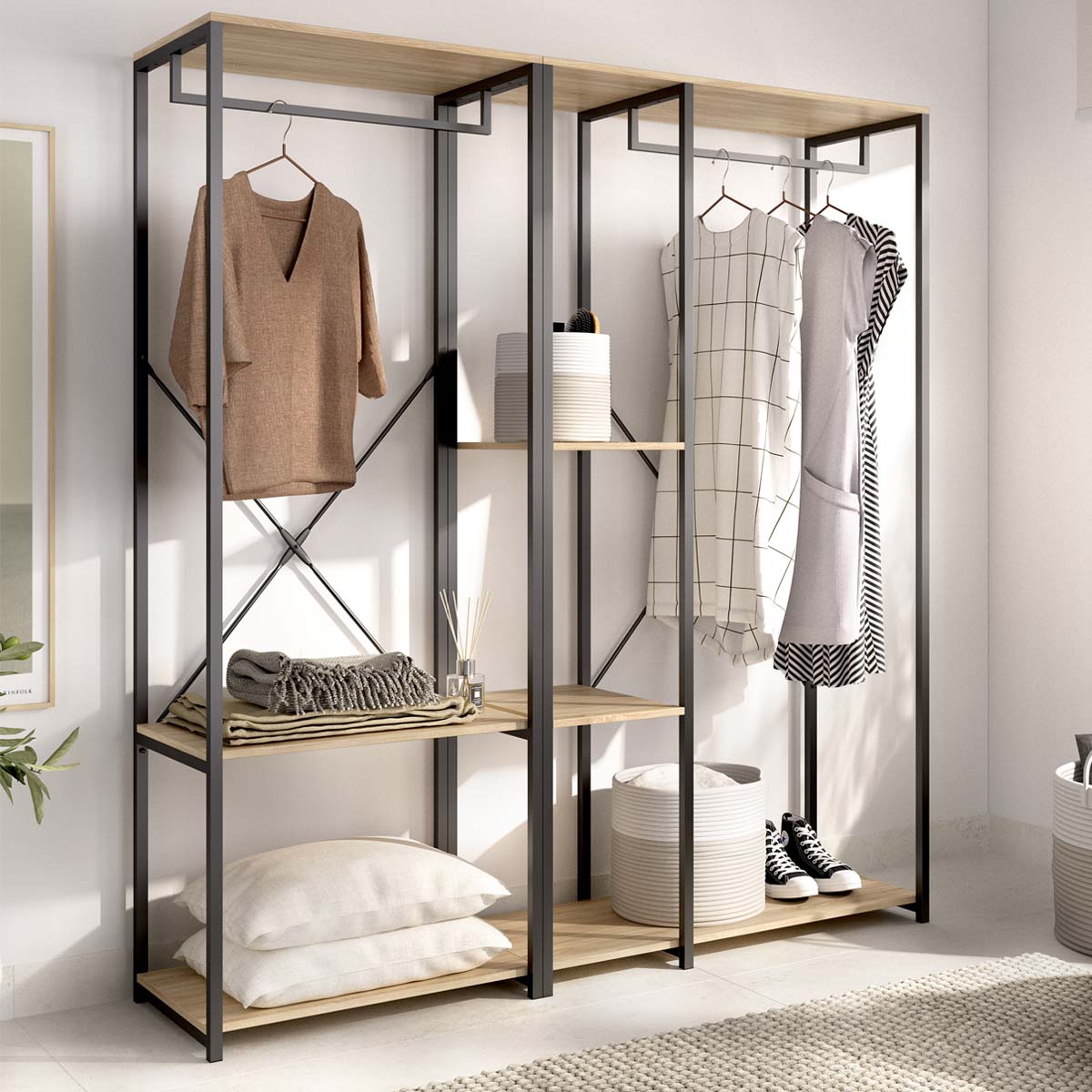 - El vestidor Trok funciona como pieza central de un vestidor abierto. Su lenguaje en negro y madera natural suma carácter y calidez, permitiendo componer paredes completas de almacenaje sin saturar, gracias a la ventilación y visibilidad del diseño abierto. La solución interior propone dos estantes amplios —ideales para punto, bolsos y cajas— y dos barras metálicas para separar trajes, camisas o vestidos, optimizando alturas y flujos de uso. La modulación facilita integrar iluminación puntual o organizadores textiles para un acabado de proyecto. Fabricado en melamina de 16 mm y estructura metálica, garantiza solidez y durabilidad con mantenimiento sencillo. Un apoyo estable y el posible anclaje incrementan seguridad en usos intensivos. El conjunto puede rematarse con módulos auxiliares a juego para calzado o complementos, completando un sistema cohesionado y funcional.