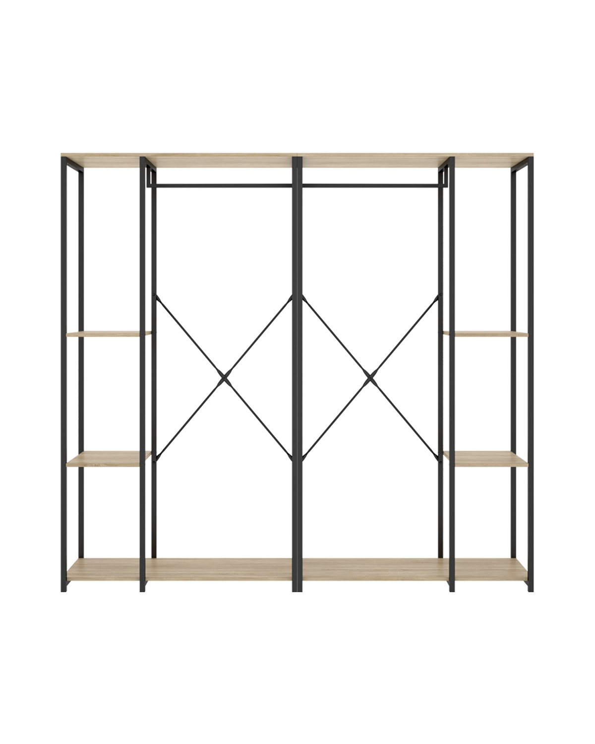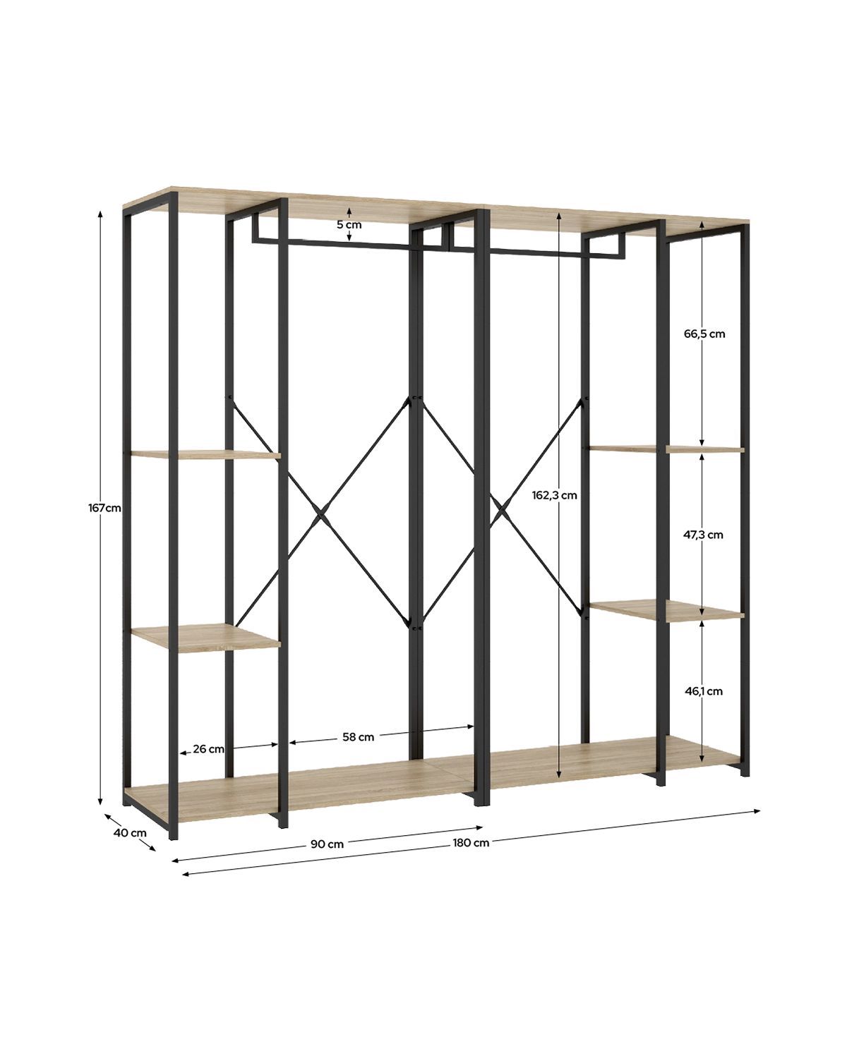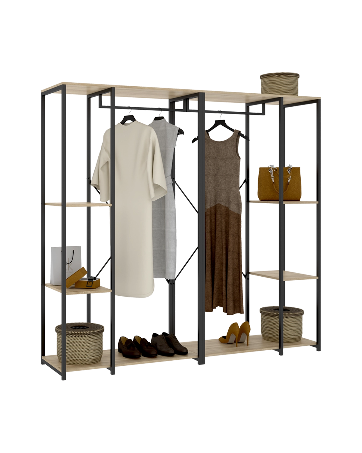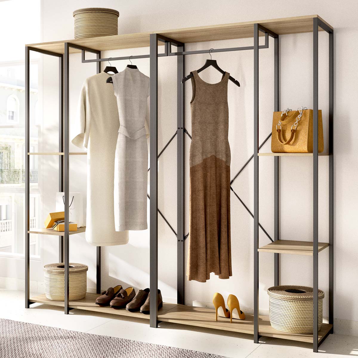 - El vestidor Trok de 180 cm combina proporción y funcionalidad en un formato abierto que potencia la ligereza visual. Su diseño en negro y madera natural aporta un carácter contemporáneo, con una estética industrial cálida que encaja tanto en dormitorios como en zonas de vestidor diáfanas. La estructura metálica y los acabados en melamina texturizada reproducen la veta de la madera con fidelidad, creando un conjunto equilibrado y sólido. Su interior integra cuatro estantes amplios y dos barras metálicas, distribuidas para ofrecer una organización práctica: espacio para colgar prendas largas o cortas y zonas superiores ideales para cajas o complementos. El diseño modular permite combinarlo con otros elementos de la serie Trok, adaptando el conjunto al tamaño del espacio disponible. Fabricado en tablero de partículas melaminizado y metal, garantiza resistencia y estabilidad. Los herrajes aportan firmeza a la estructura y los materiales permiten una limpieza sencilla con un paño humedecido. Su configuración abierta favorece la ventilación de las prendas y mantiene la sensación de orden visual en el ambiente.