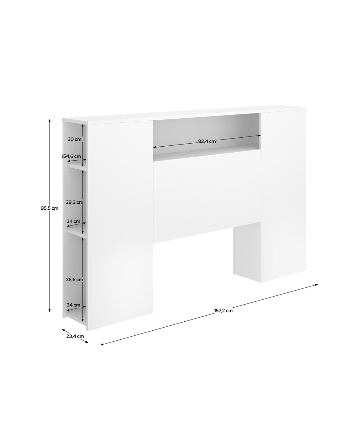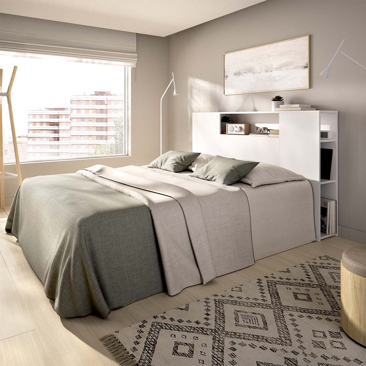 - El cabecero TEN en color blanco destaca por su diseño funcional y equilibrado, pensado para optimizar el espacio en dormitorios de matrimonio. Su acabado blanco mate aporta luminosidad y serenidad, mientras las líneas rectas y el formato compacto refuerzan una estética contemporánea fácil de integrar en distintos estilos decorativos. Diseñado para camas de 150 cm, cuenta con almacenaje en ambos lados del cabecero, proporcionando espacios accesibles y discretos para guardar libros, dispositivos, gafas o pequeños objetos de uso cotidiano. Esta distribución convierte al cabecero en una pieza multifuncional que sustituye las mesitas de noche, aportando orden y comodidad sin recargar el ambiente. Fabricado en tablero de partículas melaminizado de 16 mm, garantiza resistencia y durabilidad. Los tacos ABS quitarruidos y antirrayaduras protegen el suelo y aportan estabilidad al conjunto. Su mantenimiento es muy sencillo: basta con limpiar con un paño humedecido con una solución jabonosa suave y secar después. Una propuesta práctica y elegante que combina diseño y utilidad en perfecta armonía.
