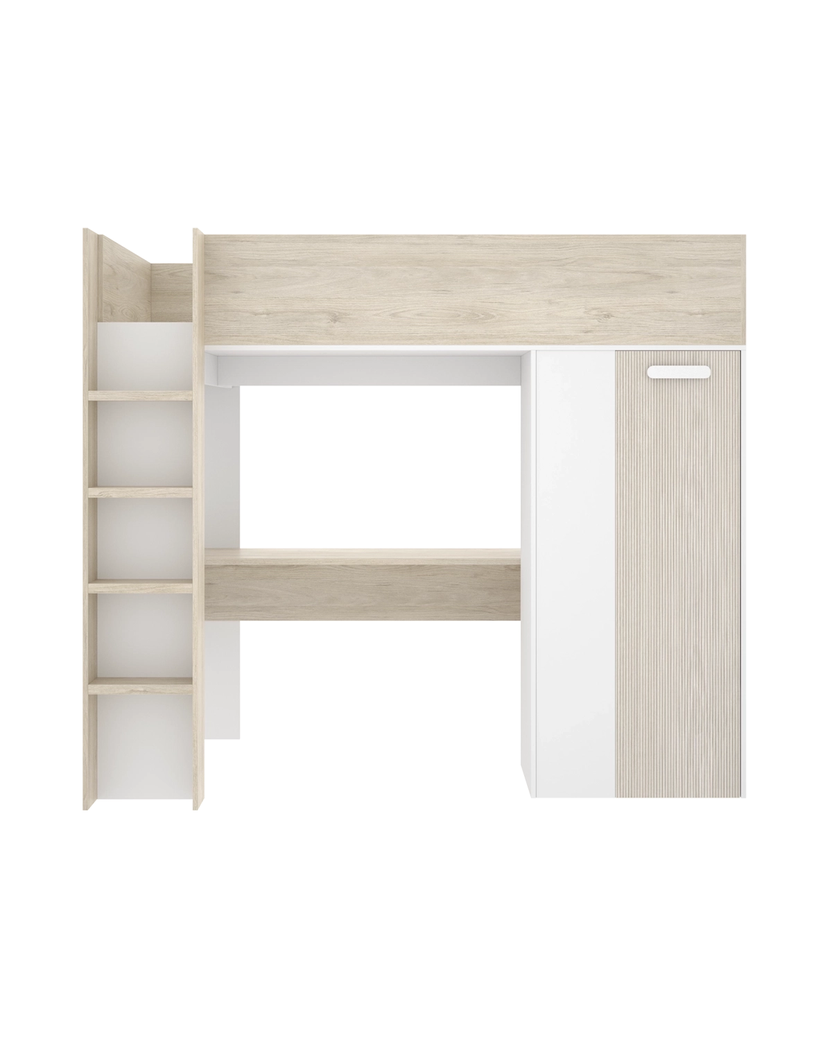 - La cama alta Spylo es una solución todo en uno para dormitorios juveniles o espacios reducidos. Su diseño en blanco, roble natural y roble alistonado combina funcionalidad y estética, aportando una sensación de amplitud y orden. Ideal para crear una zona de descanso, estudio y almacenaje dentro de un mismo mueble. La estructura eleva una cama de 90 x 190–200 cm, que no necesita somier gracias a su base con orificios de ventilación. Bajo ella se organiza un espacio perfectamente distribuido con un escritorio amplio, ideal para estudiar o trabajar con comodidad, y un armario lateral con barra para colgar ropa y estantes interiores, que facilita mantener todo en su sitio. Este diseño aprovecha la altura para liberar superficie útil, permitiendo una mejor organización del dormitorio. Fabricada en tablero de partículas melaminizado, la cama alta Spylo destaca por su resistencia y estabilidad. Incluye tacos ABS antirrayaduras y quitarruidos, y cumple con las recomendaciones de seguridad para camas elevadas (no indicada para menores de seis años). Una pieza práctica y versátil que transforma el espacio en una zona multifuncional con estilo contemporáneo.