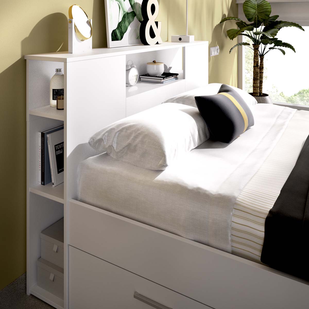 - La cama Lanka en acabado blanco destaca por su estética luminosa y su diseño funcional, pensado para aprovechar el espacio en el dormitorio principal. Su línea limpia y equilibrada se adapta fácilmente a ambientes modernos o escandinavos, aportando claridad y amplitud visual. El cabecero incluye espacios de almacenaje perfectos para libros, dispositivos o pequeños objetos, integrando la funcionalidad sin romper la armonía visual del conjunto. En la base, dos cajones con guías metálicas de suave deslizamiento ofrecen capacidad adicional para ropa de cama o accesorios. La estructura, en tablero de partículas melaminizado, combina resistencia con un mantenimiento sencillo, y los tacos ABS protegen el suelo y evitan ruidos. Compatible con colchones de 135–140 x 190 cm, esta cama conjuga practicidad y estilo, aportando una presencia elegante que realza el confort diario del dormitorio.