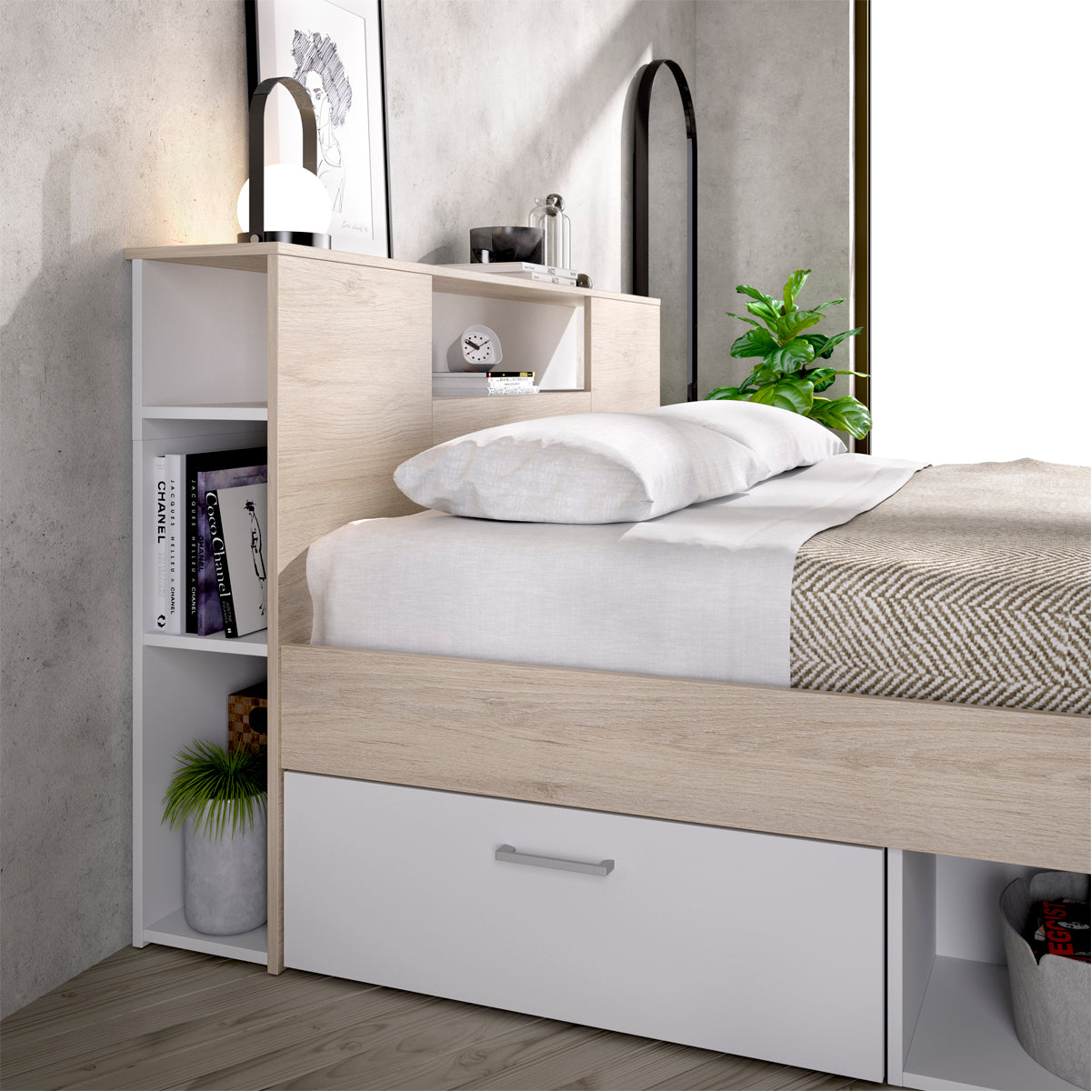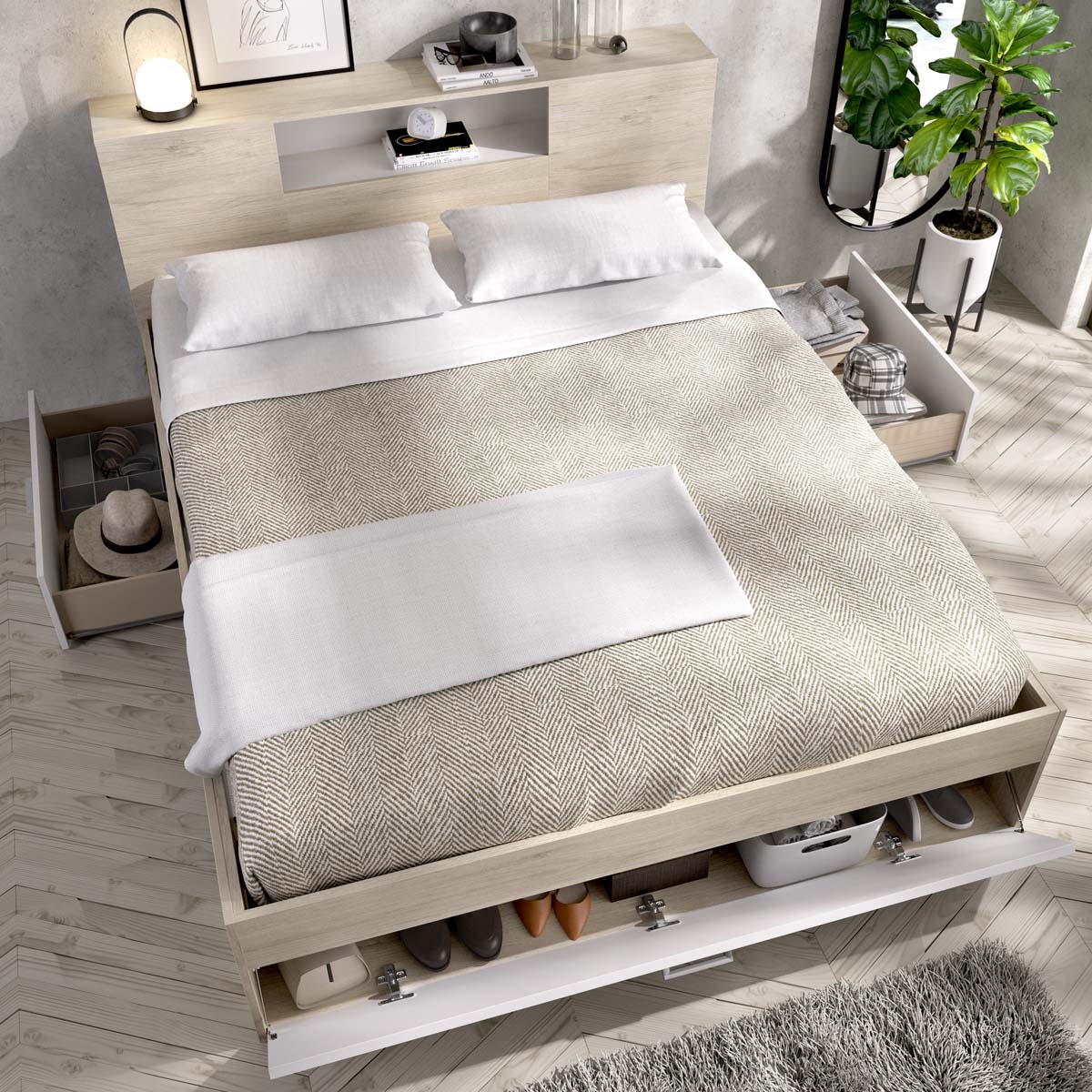 - La cama Lanka combina funcionalidad y estética natural para crear un ambiente cálido y equilibrado en el dormitorio principal. Su acabado en blanco y roble natural aporta una sensación de confort y armonía, perfecta para espacios donde se busca una decoración serena y contemporánea. El cabecero incorpora prácticos compartimentos de almacenaje, ideales para tener a mano libros, dispositivos o pequeños objetos personales. En la parte inferior, dos amplios cajones con guías metálicas de suave deslizamiento amplían la capacidad de almacenaje, ayudando a mantener el orden con facilidad. La estructura está realizada en tablero de partículas melaminizado, un material resistente y de fácil mantenimiento, mientras que los tacos ABS protegen el suelo y garantizan estabilidad. Diseñada para colchones de 135–140 x 190 cm, esta cama ofrece una base sólida y duradera. Sus detalles en acabado metálico aportan un toque moderno sin restar calidez, convirtiéndola en una opción ideal para dormitorios donde la funcionalidad se une al diseño natural.
