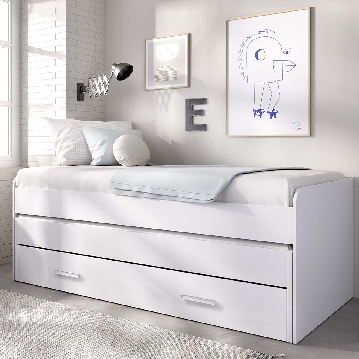 - La cama nido Pema combina un diseño cálido con una funcionalidad excepcional, pensada para optimizar el espacio en dormitorios juveniles o de invitados. Su acabado en blanco aporta un aire moderno y acogedor, integrándose fácilmente en interiores de estilo nórdico o contemporáneo. La estructura está fabricada en tablero de partículas melaminizado, resistente y de fácil mantenimiento. Dispone de un amplio cajón de almacenaje inferior que permite guardar ropa de cama, juguetes o accesorios, además de una cama supletoria con ruedas unidireccionales y soporte metálico para facilitar su movimiento. La cama superior se eleva sobre el cajón, proporcionando una altura más cómoda para el descanso diario y una mejor ergonomía. El colchón inferior no necesita somier, ya que se apoya directamente sobre la base. Es compatible con dos colchones de 90 x 190 cm, con una altura máxima de 18 cm para el inferior. Detalles como los tiradores metálicos en ABS, las ruedas integradas y los tacos ABS antirrayaduras garantizan durabilidad y comodidad de uso. Una cama nido práctica y elegante que ofrece dos camas y espacio de almacenaje en una sola pieza, ideal para quienes buscan funcionalidad sin renunciar al diseño.