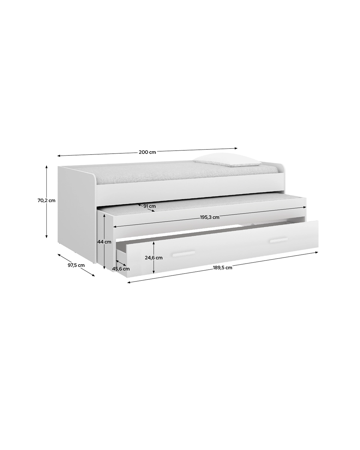 - Tamaño colchón compatible: Cama: 90 x 190 cm | Arrastre: 90 x 190 cm