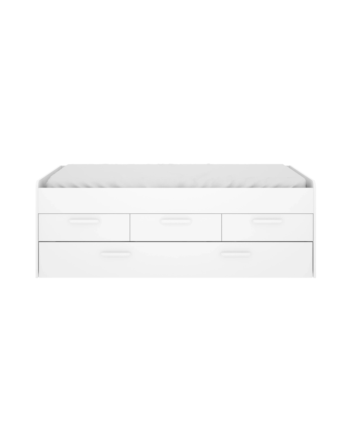 - La cama nido Leka en color blanco combina estilo y funcionalidad, ofreciendo una estructura práctica con líneas limpias y un diseño actual. Su estética neutra la convierte en una opción ideal para habitaciones juveniles, donde el orden y la versatilidad son esenciales. Cuenta con tres amplios cajones inferiores que permiten organizar ropa de cama, juguetes o material escolar, junto con una cama adicional que se desplaza fácilmente gracias a las ruedas unidireccionales con soporte metálico. El colchón de la cama inferior descansa directamente sobre la base, sin necesidad de somier. Fabricada en tablero de partículas melaminizado, incorpora tiradores de ABS en acabado metálico, guías metálicas de suave deslizamiento y tacos ABS quitarruidos y antirrayaduras. Es compatible con dos colchones de 90 x 190 cm, con una altura máxima de 20 cm en la cama inferior. Una cama doble compacta que ofrece gran capacidad de almacenaje y un diseño versátil, ideal para dormitorios donde cada metro cuenta.