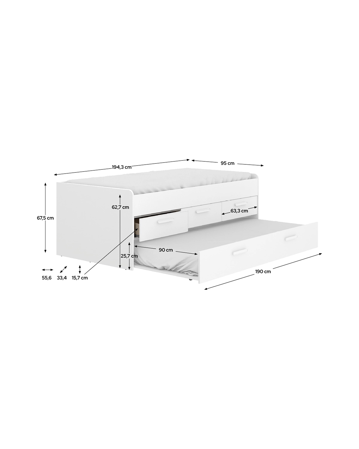 - Tamaño colchón compatible: Cama: 90 x 190 cm | Arrastre: 90 x 190 cm