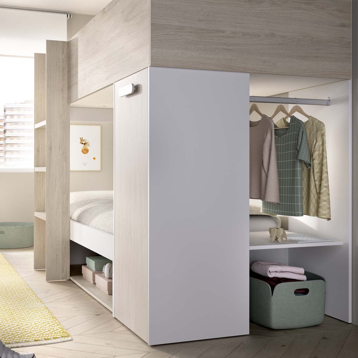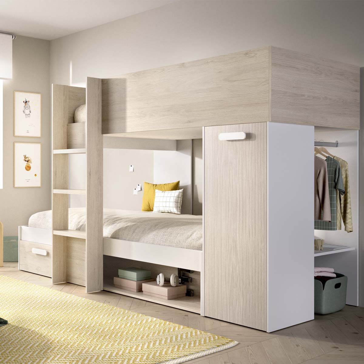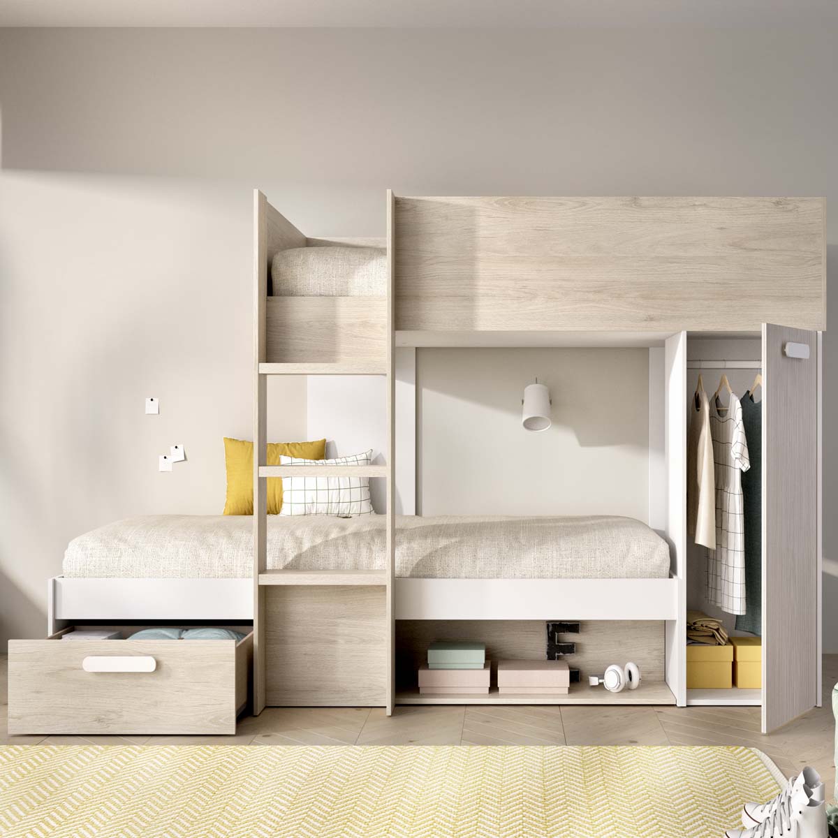 - La cama tren Kos combina diseño y funcionalidad para crear un dormitorio juvenil equilibrado, ordenado y con estilo. Su estructura en blanco, roble natural y roble alistonado aporta luminosidad y un toque cálido, adaptándose fácilmente a ambientes modernos o nórdicos. El conjunto está formado por dos camas de 90 x 190 cm, una superior y otra inferior, pensadas para ofrecer un descanso cómodo en un espacio compacto. La cama superior cuenta con barandilla de seguridad y escalera lateral, cumpliendo con la normativa UNE-EN 747-1, y no está indicada para menores de seis años. Ambas camas disponen de bases con orificios de ventilación, evitando la necesidad de somier y garantizando una correcta transpiración del colchón. La inferior se apoya sobre ruedas unidireccionales con soporte metálico y tacos ABS antirrayaduras y quitarruidos que protegen el suelo y facilitan el uso diario. Bajo la cama y en un lateral se integra un amplio armario, ideal para guardar ropa o textiles, y varios cajones inferiores que completan la capacidad de almacenaje. Fabricada en tablero de partículas melaminizado, la cama tren Kos es una solución sólida, segura y versátil, perfecta para dormitorios compartidos o espacios juveniles donde cada detalle cuenta.