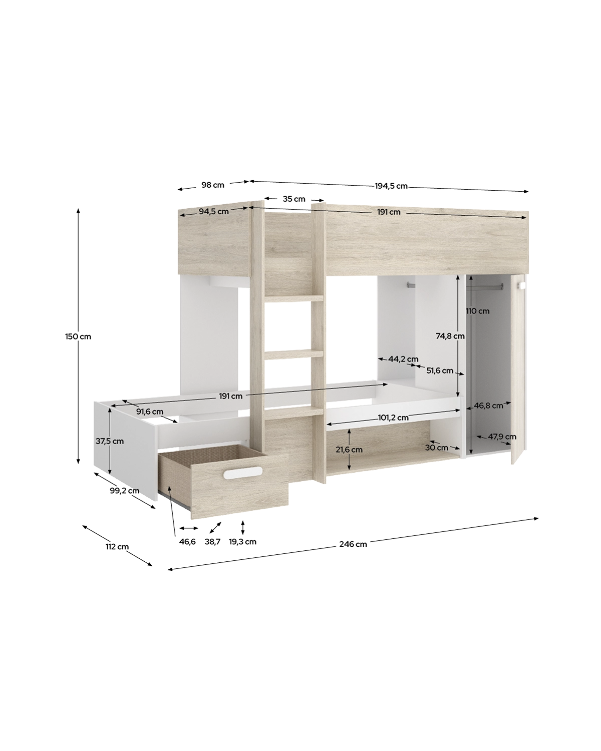 - Tamaño colchón compatible: Cama superior: 90 x 190 cm | Cama inferior: 90 x 190 cm