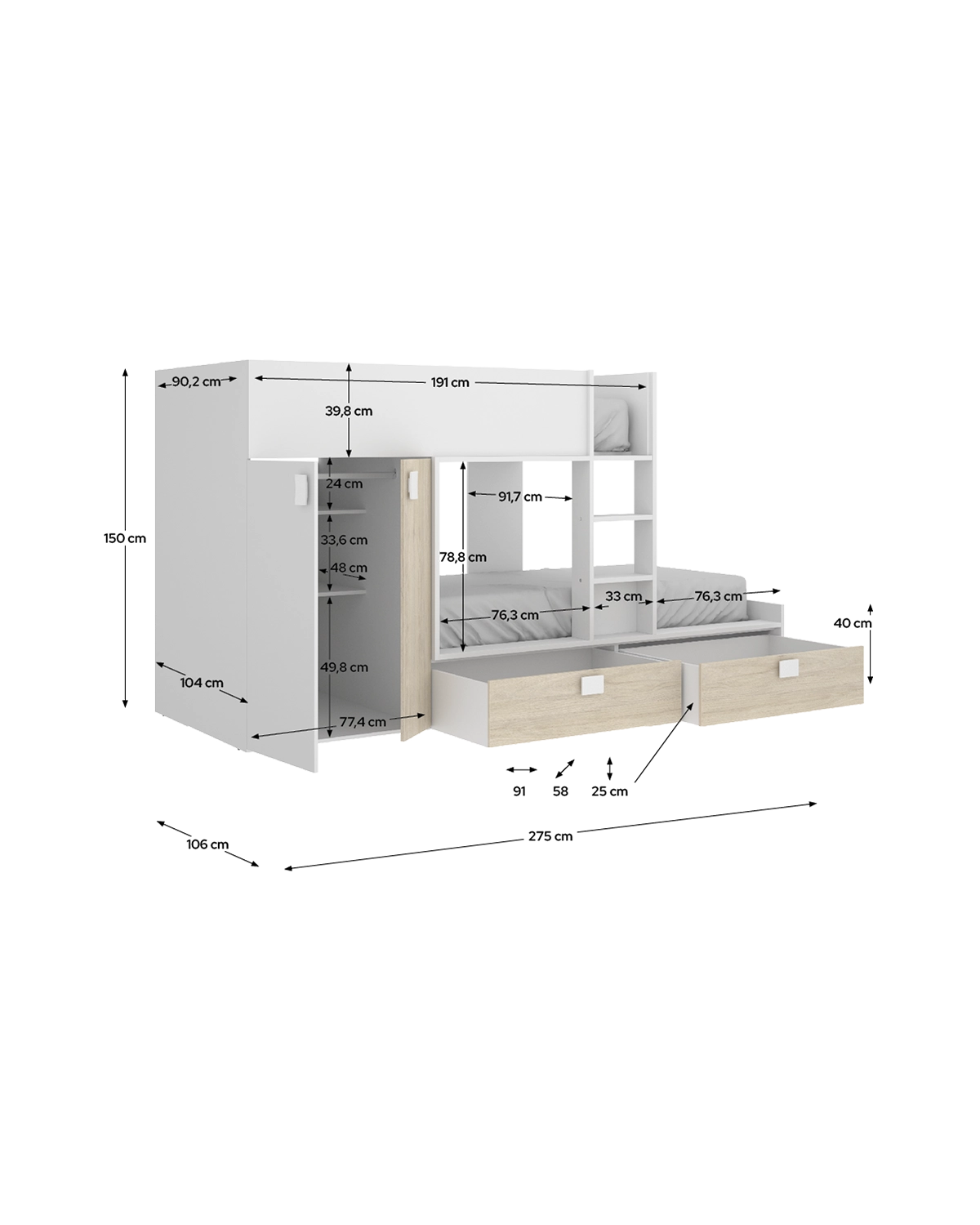 - Tamaño colchón compatible: Cama superior: 90 x 190 cm | Cama inferior: 90 x 190 cm