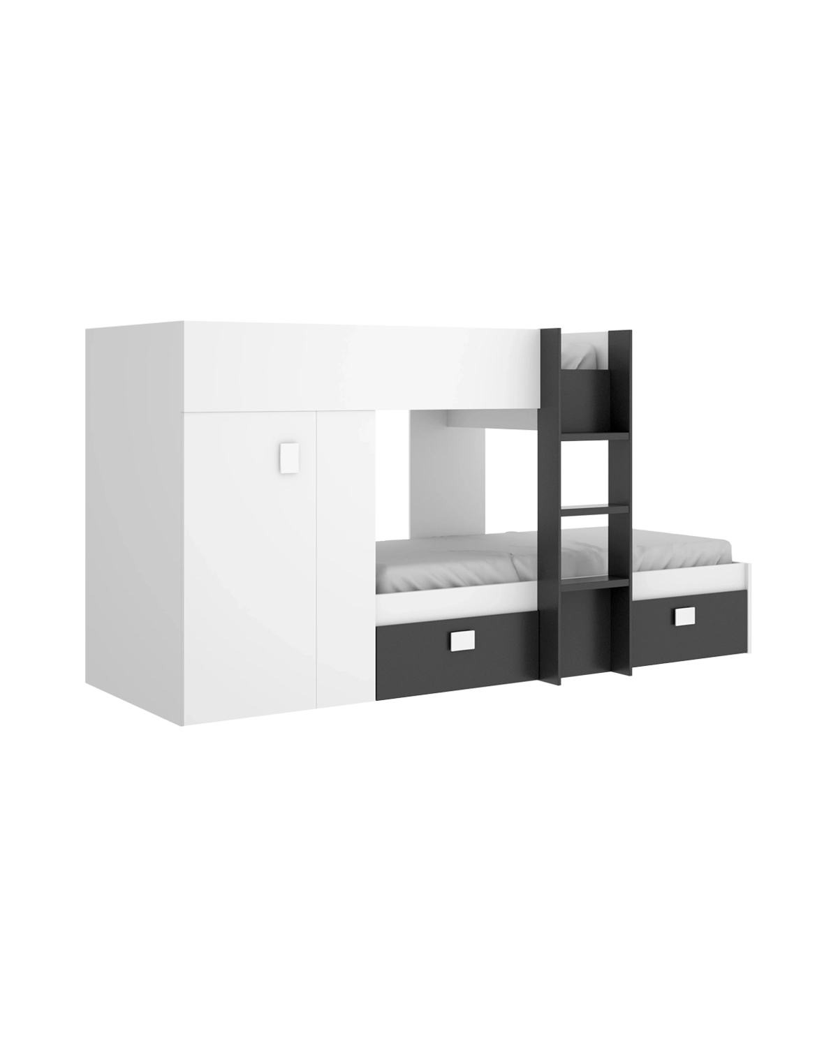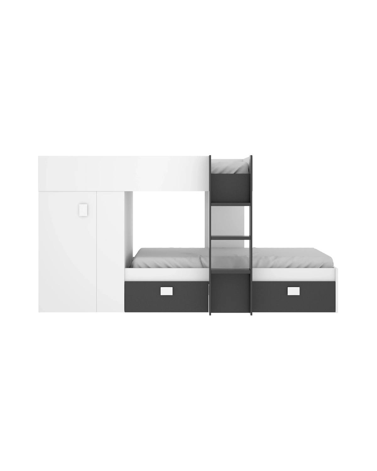 - La cama tren Groe en blanco y grafito combina un diseño dulce y luminoso con una estructura práctica que optimiza el espacio. Ideal para dormitorios infantiles o juveniles, aporta una atmósfera fresca y ordenada. Incluye dos camas de 90 x 190 cm, ambas con bases de madera ventiladas que no requieren somier. La cama superior incorpora barandilla protectora y escalera lateral, garantizando seguridad y confort conforme a la norma UNE-EN 747-1:2024 (no indicada para menores de 6 años). Su estructura integra un armario lateral funcional para ropa o accesorios y cajones inferiores con ruedas unidireccionales y guías metálicas, que amplían el almacenaje de forma cómoda y accesible. Fabricada en tablero de partículas melaminizado con tacos ABS protectores, combina durabilidad, diseño y practicidad en una pieza que crece con el ritmo de los más jóvenes.