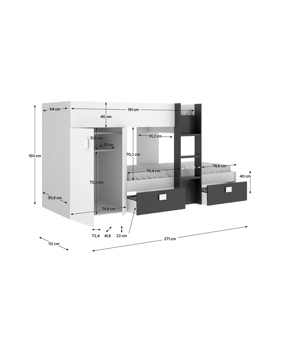 - Tamaño colchón compatible: Cama superior: 90 x 190 cm | Cama inferior: 90 x 190 cm