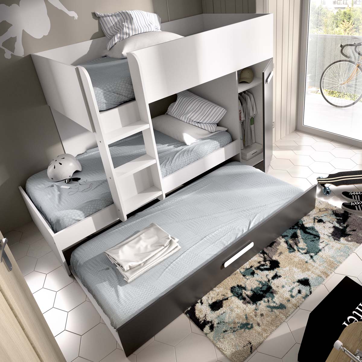 - La cama tren triple Tom en blanco y grafito ofrece una estética moderna y funcional pensada para dormitorios juveniles o de invitados. Su diseño lineal y contrastado aporta un estilo contemporáneo que combina fácilmente con mobiliario en tonos neutros o madera. Este modelo incluye tres camas de 90 x 190 cm, con bases de madera ventiladas que eliminan la necesidad de somier. La cama inferior se extrae con suavidad mediante ruedas unidireccionales, mientras que las dos superiores garantizan un descanso cómodo y seguro. Incorpora un armario lateral con gran capacidad de almacenaje y cajones inferiores amplios con guías metálicas, que permiten organizar ropa, juguetes o textiles. Fabricada en tablero de partículas melaminizado con tacos ABS protectores, esta cama cumple con la normativa UNE-EN 747-1:2024, asegurando resistencia, estabilidad y seguridad para uso infantil o juvenil. Un mueble multifuncional que optimiza el espacio sin perder elegancia.