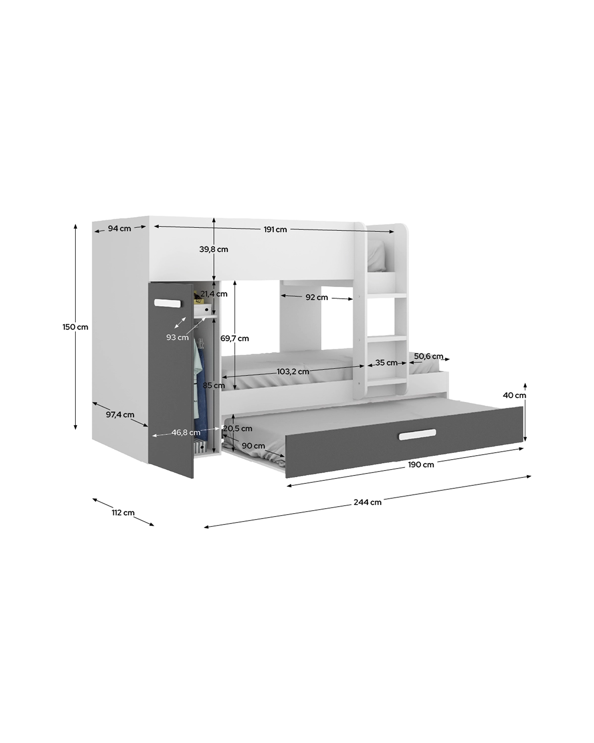 - Tamaño colchón compatible: Cama superior: 90 x 190 cm | Cama inferior: 90 x 190 cm | Arrastre: 90 x 190 cm