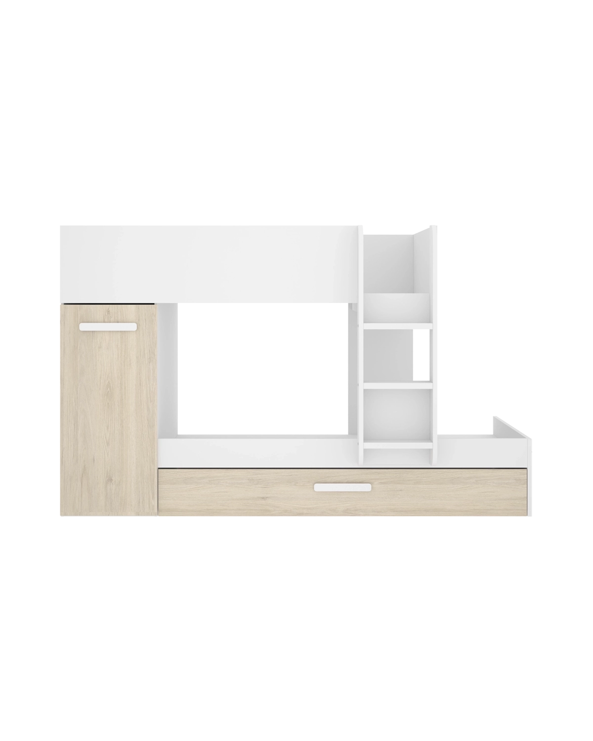 - La cama tren triple Tom combina diseño práctico y gran capacidad de descanso, ideal para dormitorios compartidos o habitaciones de invitados. Su acabado en blanco y roble natural aporta calidez y equilibrio, adaptándose con facilidad a distintos estilos decorativos. Dispone de tres camas de 90 x 190 cm distribuidas en distintos niveles: la superior y la intermedia cuentan con bases de madera perforadas que no requieren somier, mientras que la cama inferior se extrae mediante un sistema de arrastre con ruedas, facilitando su uso diario. Incluye un armario lateral integrado que añade espacio de almacenaje para ropa o juegos, así como cajones inferiores con guías metálicas y ruedas unidireccionales, perfectos para mantener el orden. Fabricada en tablero de partículas melaminizado con tacos ABS antirrayaduras y quitarruidos, la estructura cumple con la norma europea UNE-EN 747-1:2024, garantizando seguridad y estabilidad en el uso infantil. Una solución todo en uno que optimiza el espacio sin renunciar a la comodidad ni al diseño.