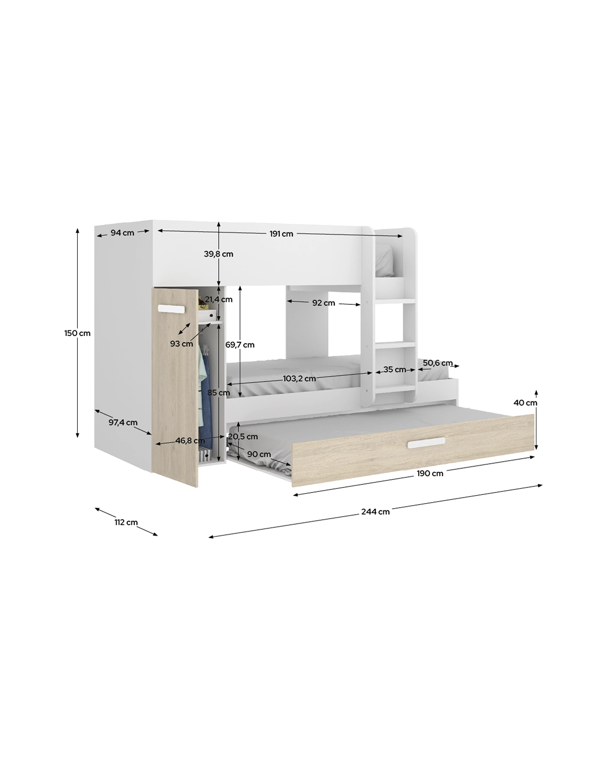 - Tamaño colchón compatible: Cama superior: 90 x 190 cm | Cama inferior: 90 x 190 cm | Arrastre: 90 x 190 cm