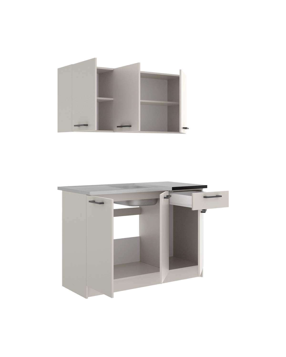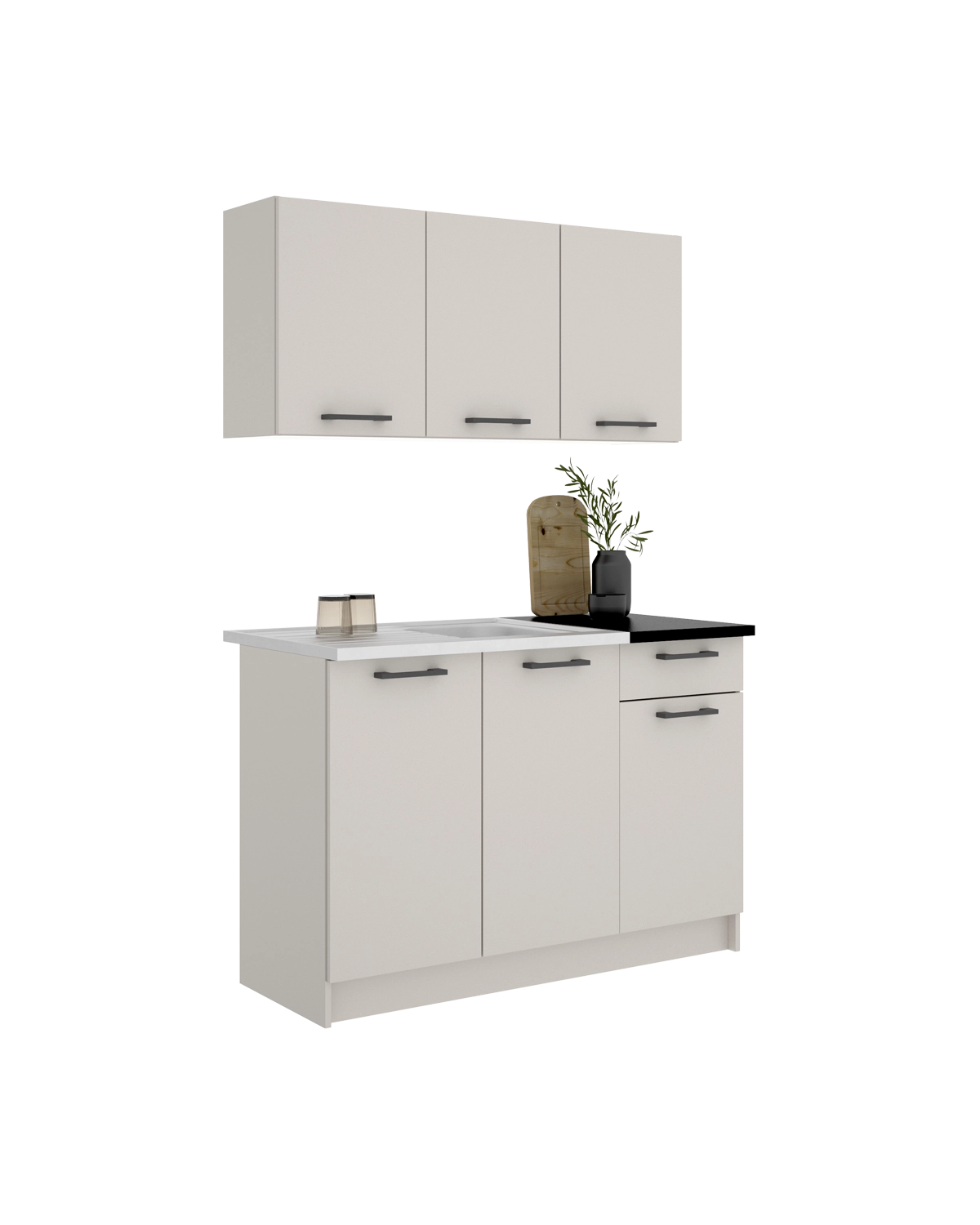 - Este conjunto está formado por 2 módulos colgantes de 120 cm que ofrecen una solución práctica para el almacenaje superior. Sus 3 puertas facilitan una distribución clara del contenido, permitiendo mantener la cocina visualmente despejada y bien organizada. En la parte inferior integra 2 módulos bajos que refuerzan la funcionalidad del conjunto. Disponen de 3 puertas, 1 cajón y hueco específico para fregadero, ayudando a ordenar utensilios, productos de limpieza y menaje de forma eficiente. El montaje reversible aporta flexibilidad en la instalación. Fabricado en tablero laminado, garantiza durabilidad y limpieza sencilla. El acabado beige con encimera negra aporta luminosidad y equilibrio visual, mientras que el zócalo de 10 cm refuerza la estructura y protege el mueble en el uso cotidiano.