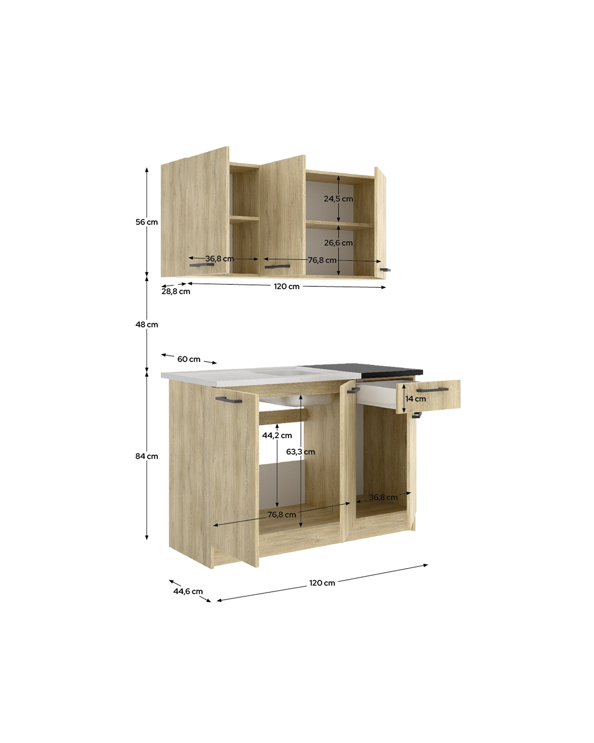 - Este conjunto incorpora 2 módulos superiores de 120 cm, diseñados para optimizar el almacenaje en la parte alta de la cocina. Sus 3 puertas permiten organizar vajilla y productos de despensa de forma accesible, manteniendo una estética ordenada. El formato colgante ayuda a aprovechar la pared sin ocupar superficie útil. La composición se completa con 2 módulos bajos pensados para la zona de trabajo. Incluyen 3 puertas, 1 cajón y hueco para fregadero, facilitando la organización del menaje y los utensilios de uso diario. El montaje reversible permite adaptarlos a distintas distribuciones según el espacio disponible. Fabricados en tablero laminado, combinan resistencia y fácil mantenimiento. El acabado en madera natural con encimera negra aporta calidez y contraste, mientras que el zócalo de 10 cm mejora la estabilidad del conjunto y protege la base frente al uso diario.